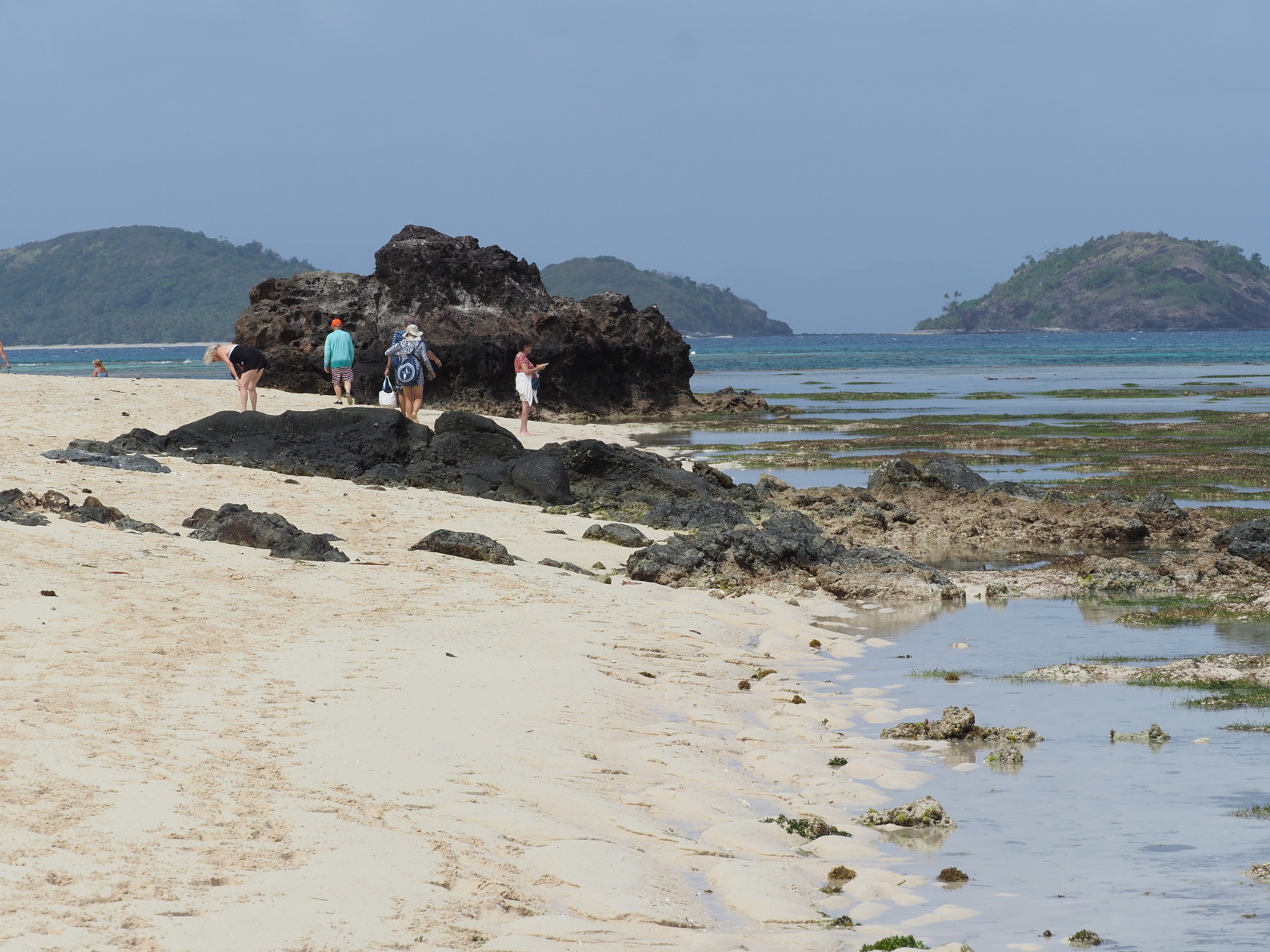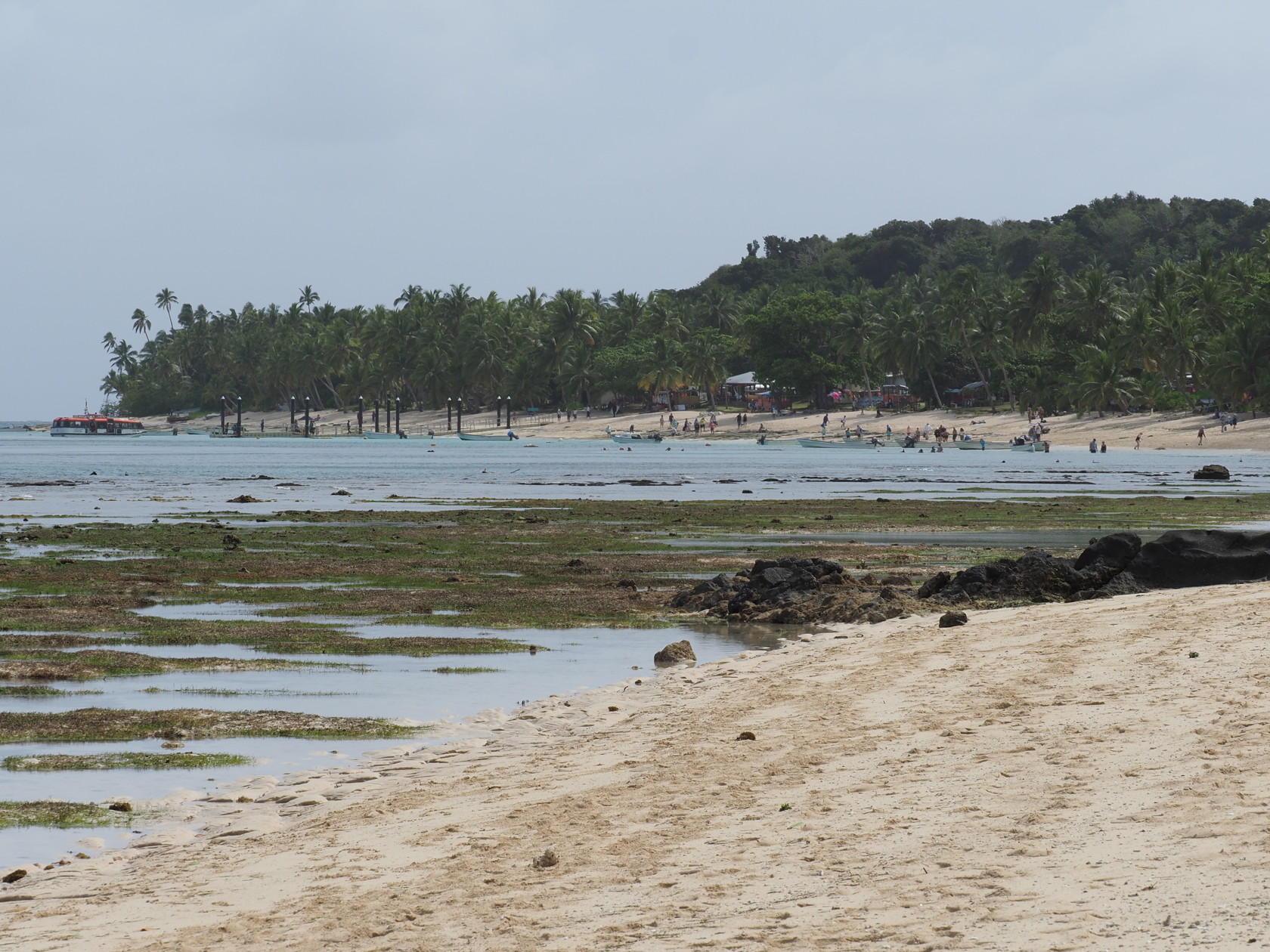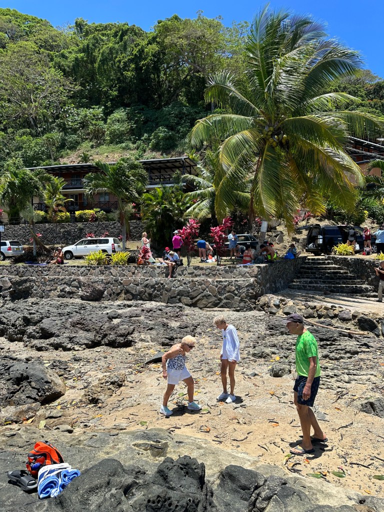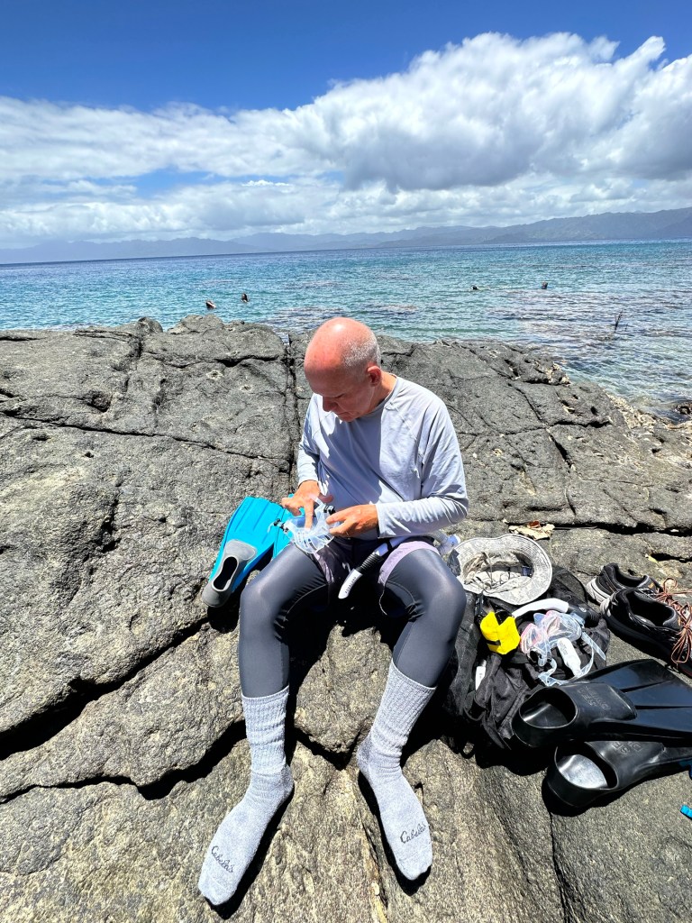 After lunch on the ship we returned to the beach to try to snorkel since the tide had come in some. Snorkeling at low tide can be difficult since you may have to walk a long way to get to water deep enough to actually snorkel in without rubbing your stomach on rocks or corals. Walking with bare feet isn’t advisable (sharp coral fragments and possibly nasty fish) and fins aren’t feasible to walk with for long distances.