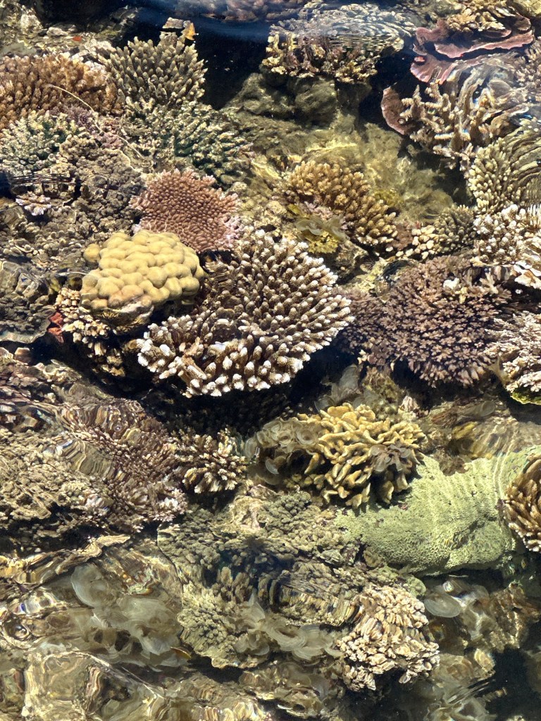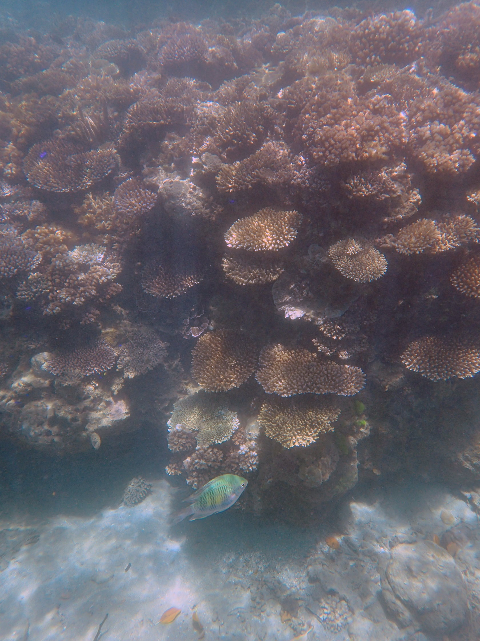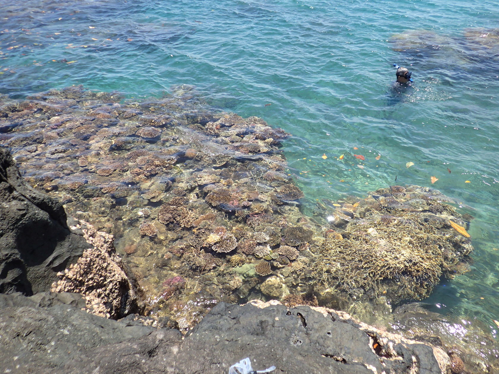 Access to the water at Split Rock wasn’t that easy. We arrived near low tide and the only feasible entrance into the water was cluttered with floating mangrove leaves. And it was mostly too shallow to snorkel right away. Once one got far enough into deeper water so as to not scrape the rocks/corals the viewing got better and it one snorkeled far enough offshore (only 50 or so feet) the visibility got much better. However one still had to snorkel between the coral heads and such, rather than swim over them.
