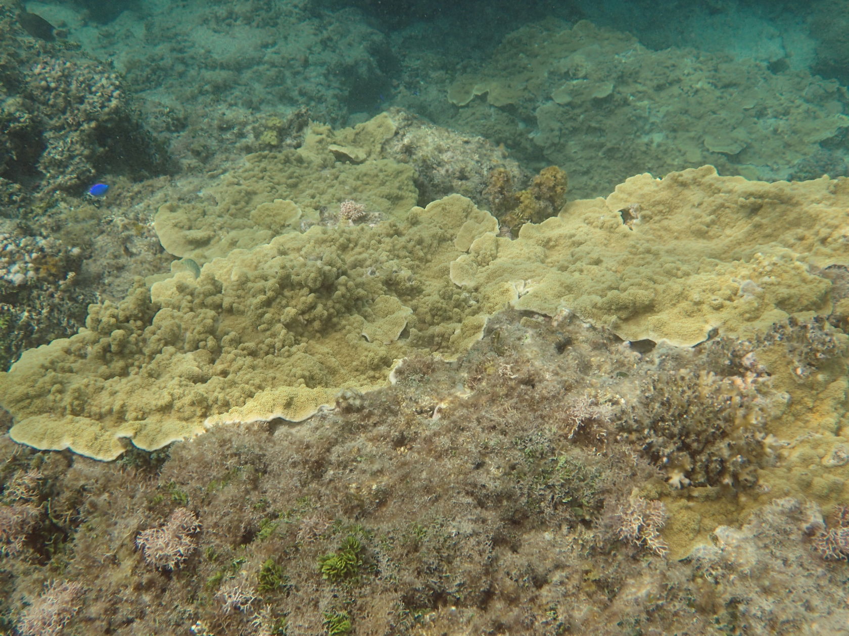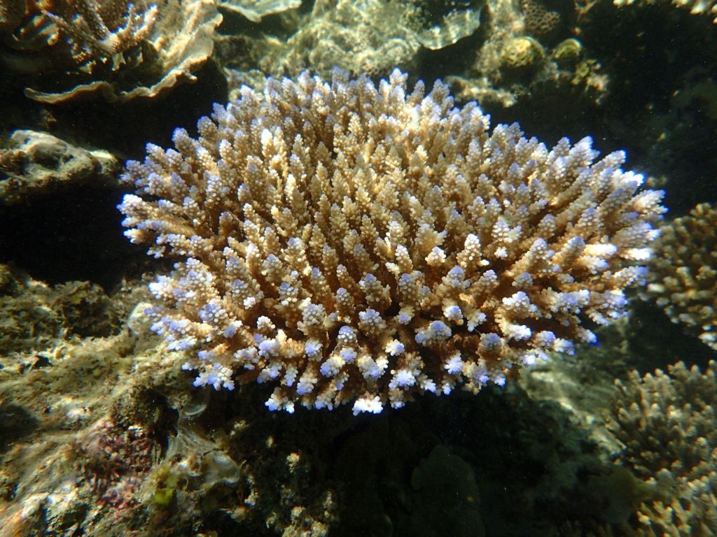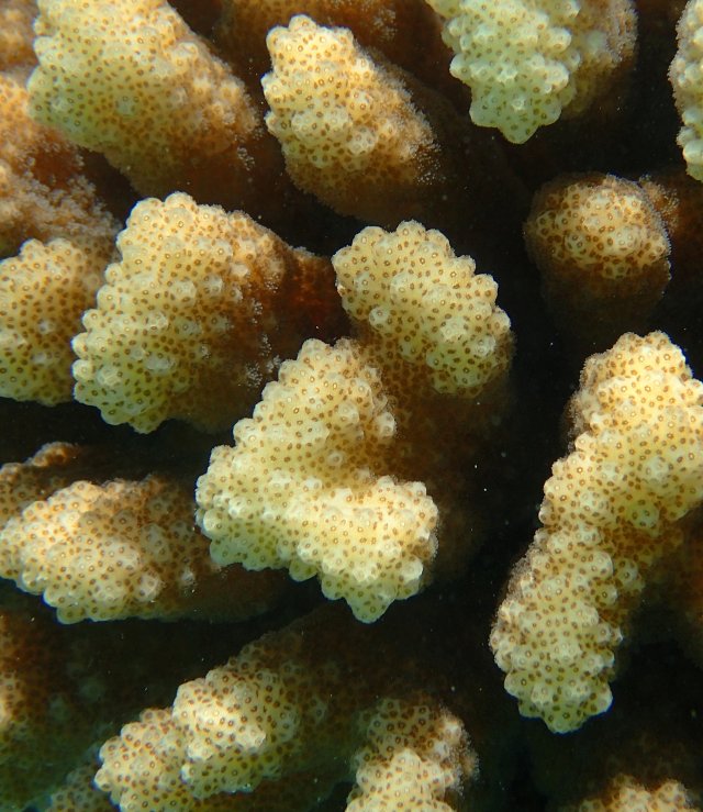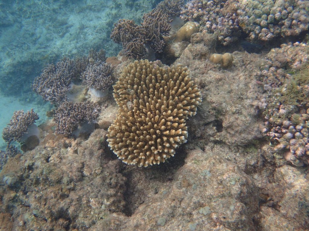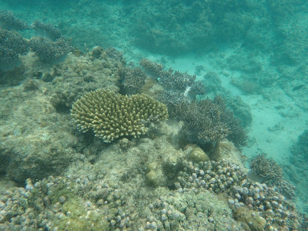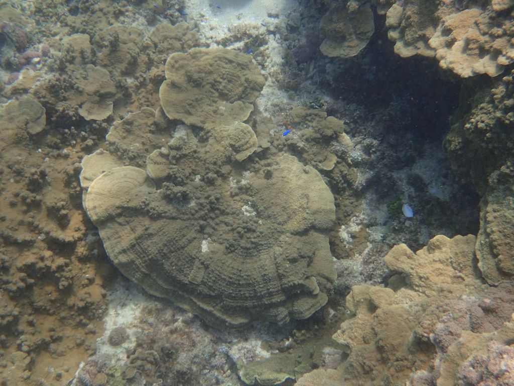 We attempted to snorkel four times during the cruise. Conditions varied and only one of the efforts was on an organized tour to a small motu on the barrier reef of Moorea, French Polynesia. The other snorkeling efforts were from the shore, in Fiji (at Split Rock, just outside Savusavu) and on Dravuni and Fakarava. We were able to get somewhat close to corals in Tonga as well, but were were not dressed to snorkel. Finally, in Tahiti at the dock there were corals growing on platforms that had been in the water for many years.