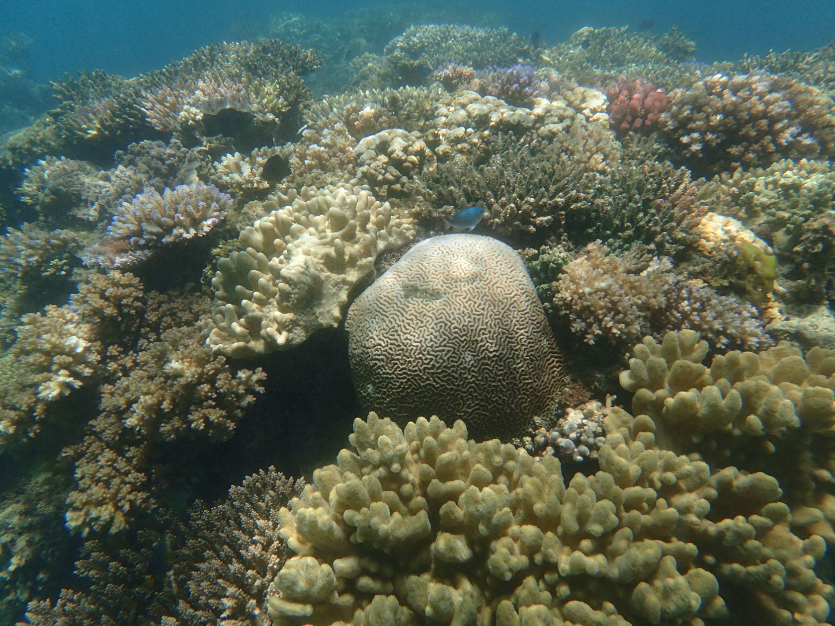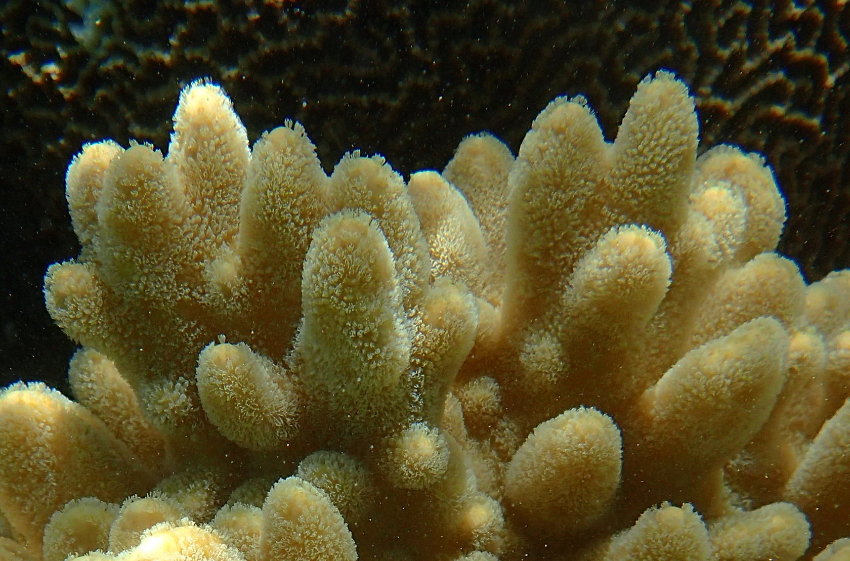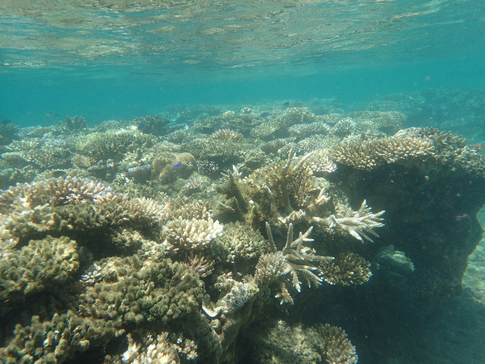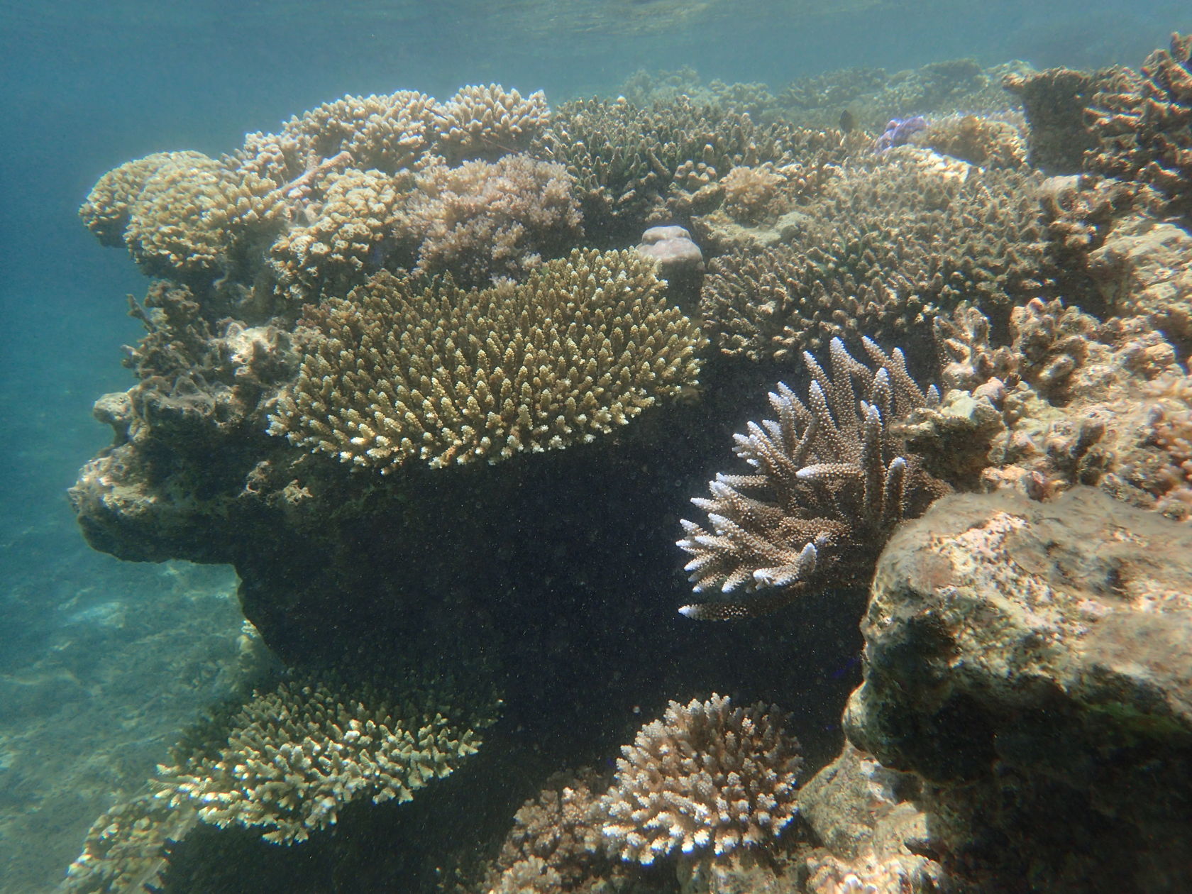 We attempted to snorkel four times during the cruise. Conditions varied and only one of the efforts was on an organized tour to a small motu on the barrier reef of Moorea, French Polynesia. The other snorkeling efforts were from the shore, in Fiji (at Split Rock, just outside Savusavu) and on Dravuni and Fakarava. We were able to get somewhat close to corals in Tonga as well, but were were not dressed to snorkel. Finally, in Tahiti at the dock there were corals growing on platforms that had been in the water for many years.