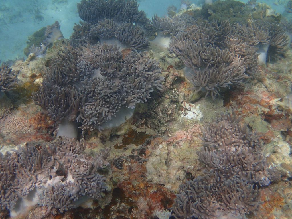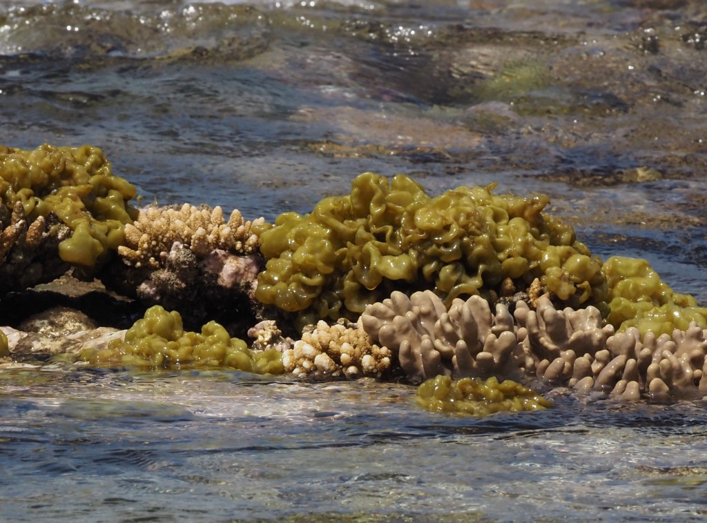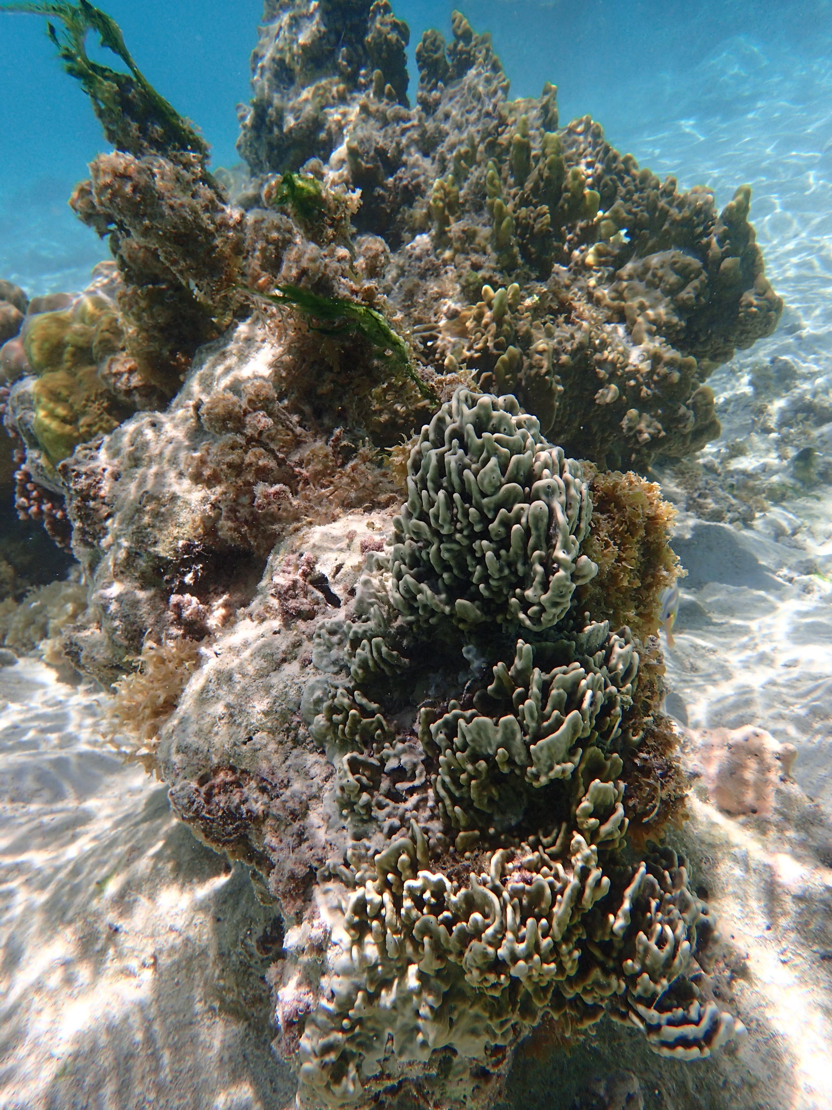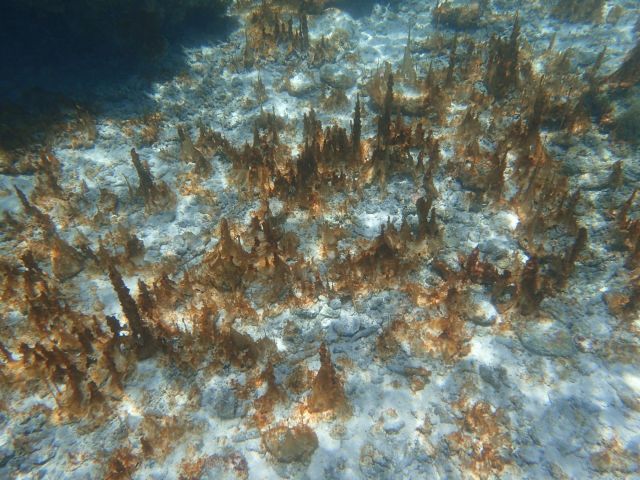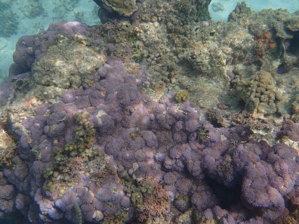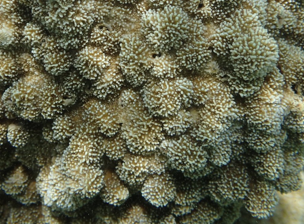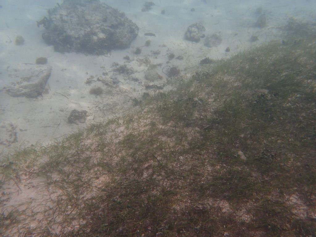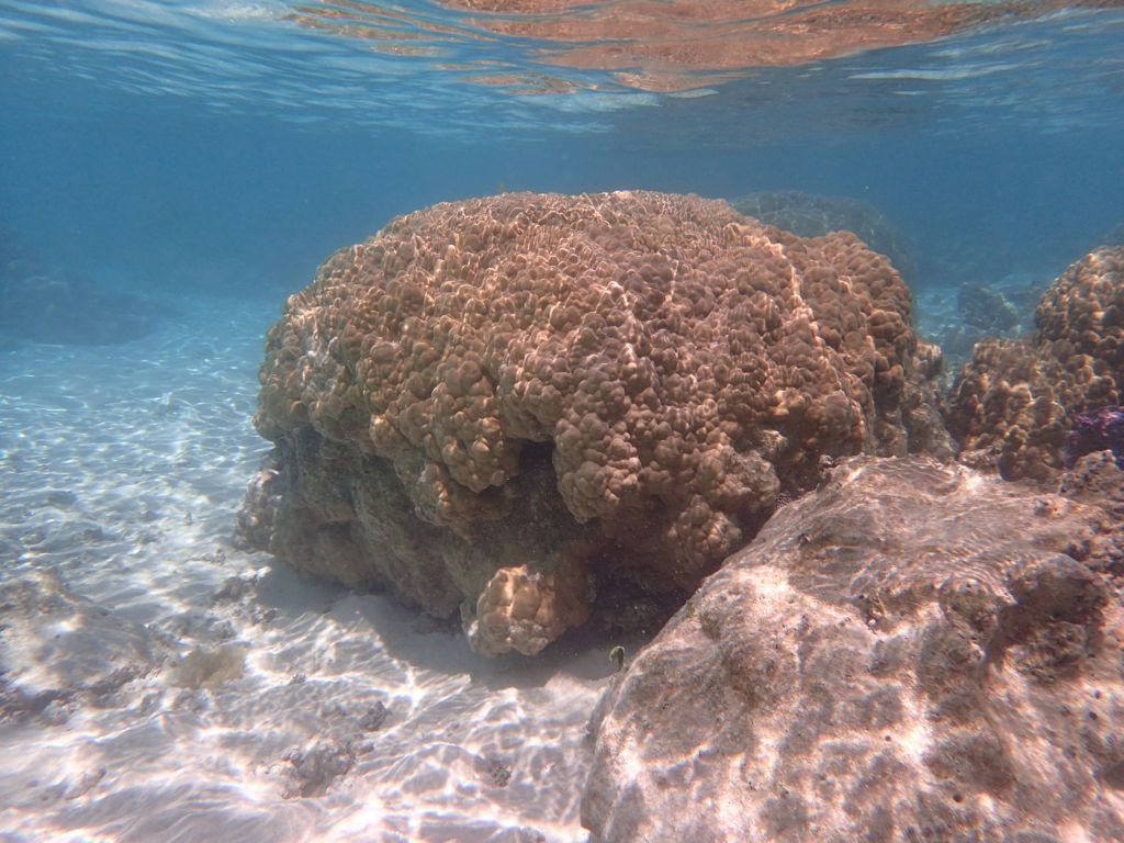 I was able to snorkel some. I was initially disappointed by the seagrass and sand upon entering but another snorkeler pointed to an area where he said there were corals. Sure enough, as one went out the water cleared up some and coral encrusted boulders appeared. I didn’t feel comfortable going very far out since I was soon the only person in the water, but did go far enough to see many interesting features. Some of the photos, taken with an Olympus TG-4 underwater camera, are shown below.