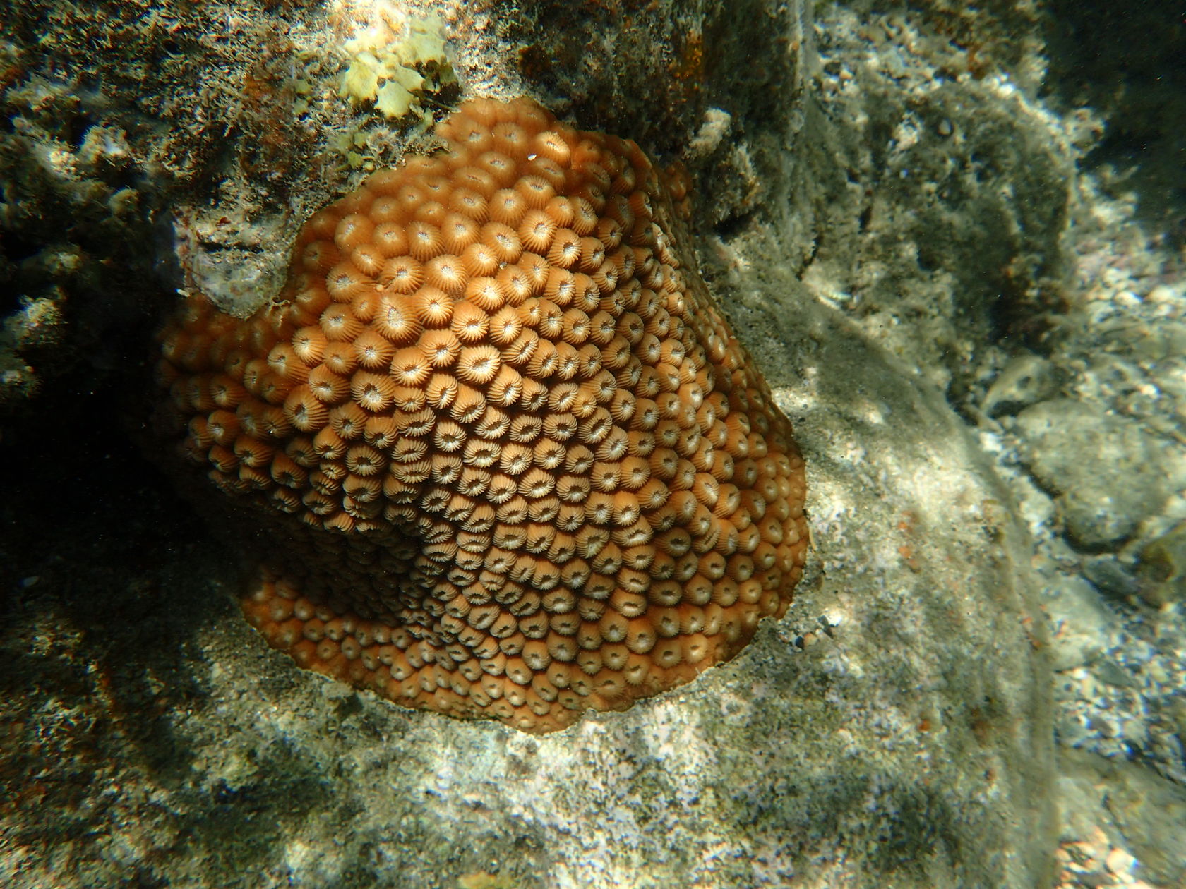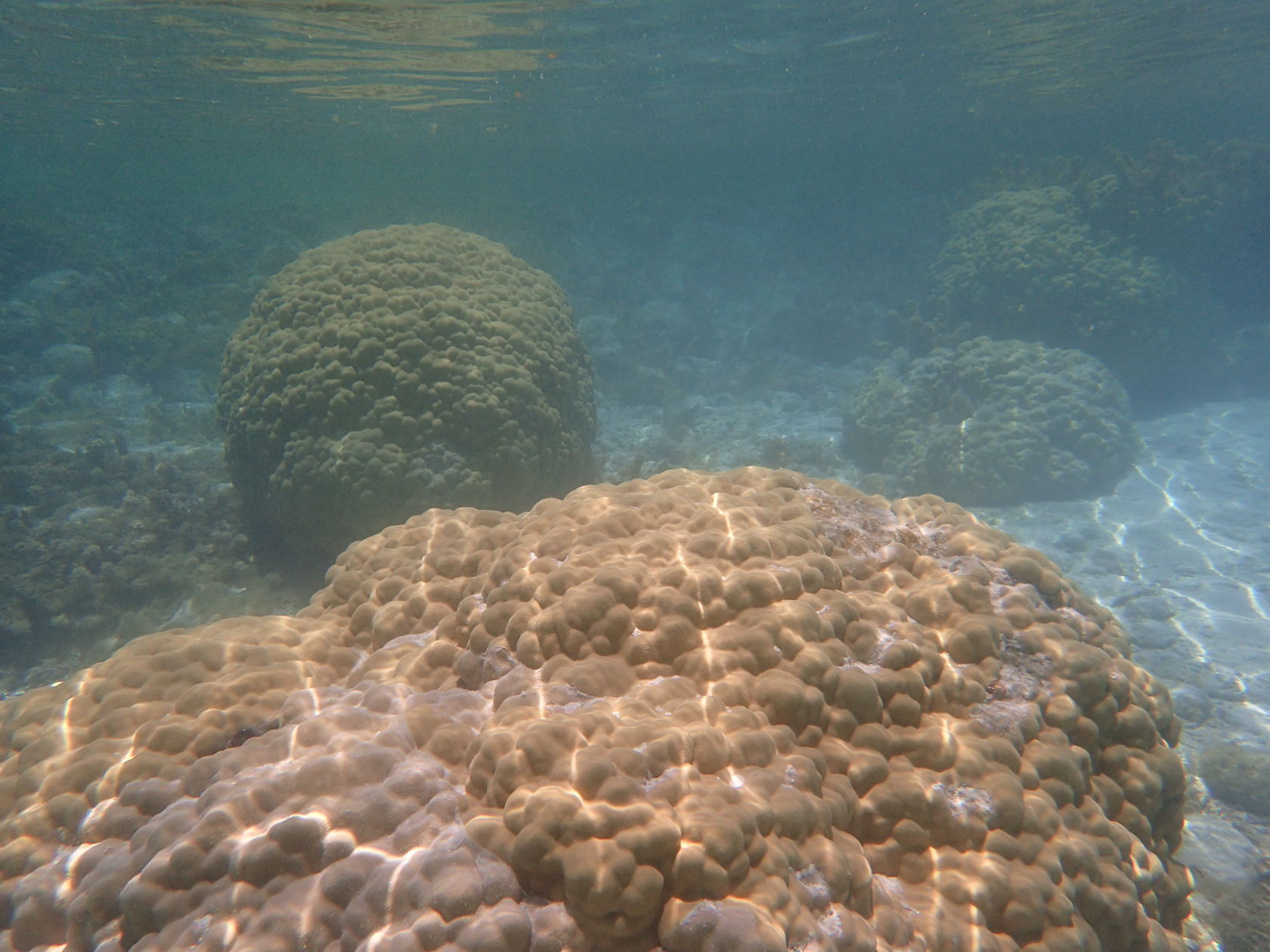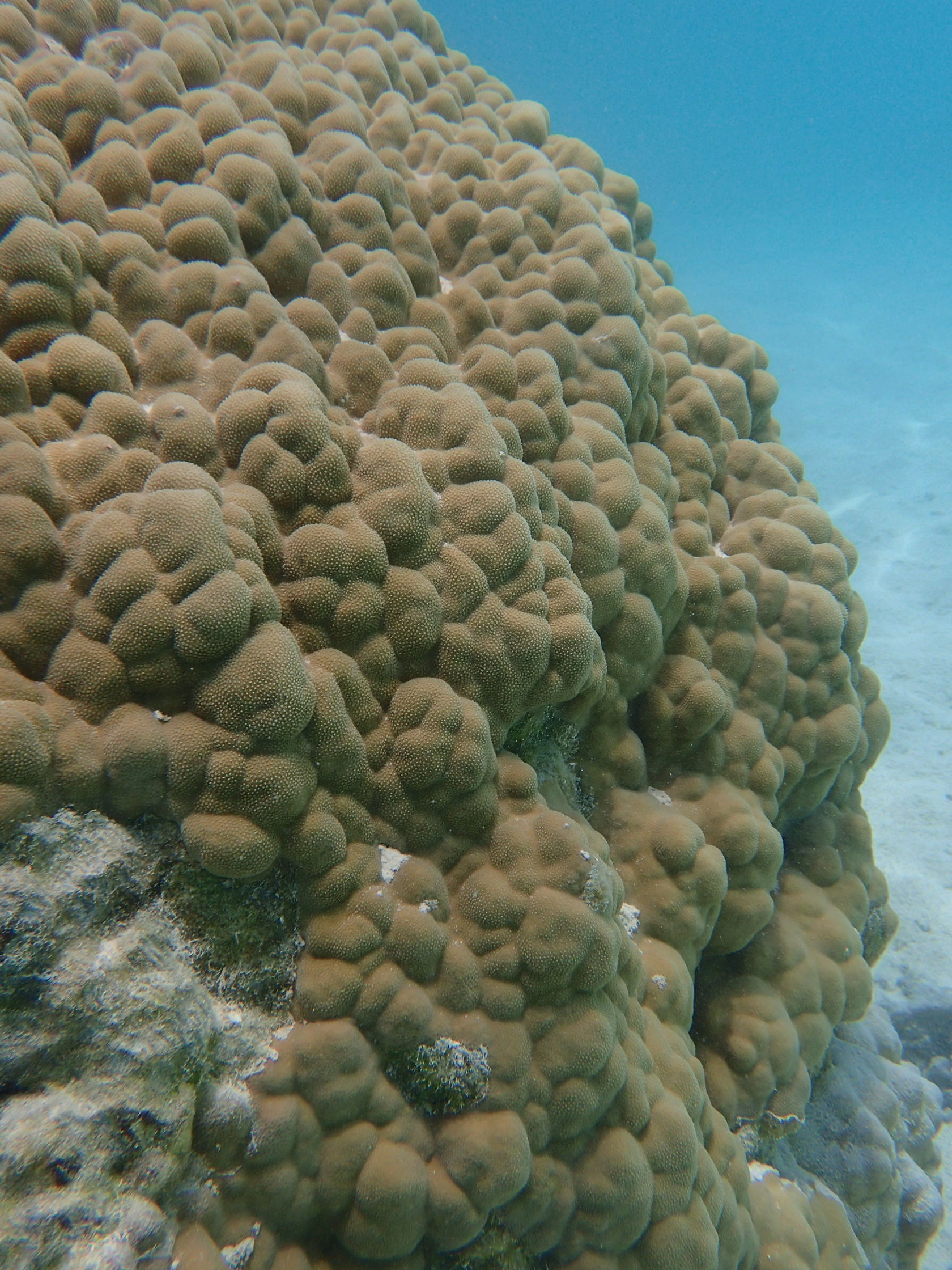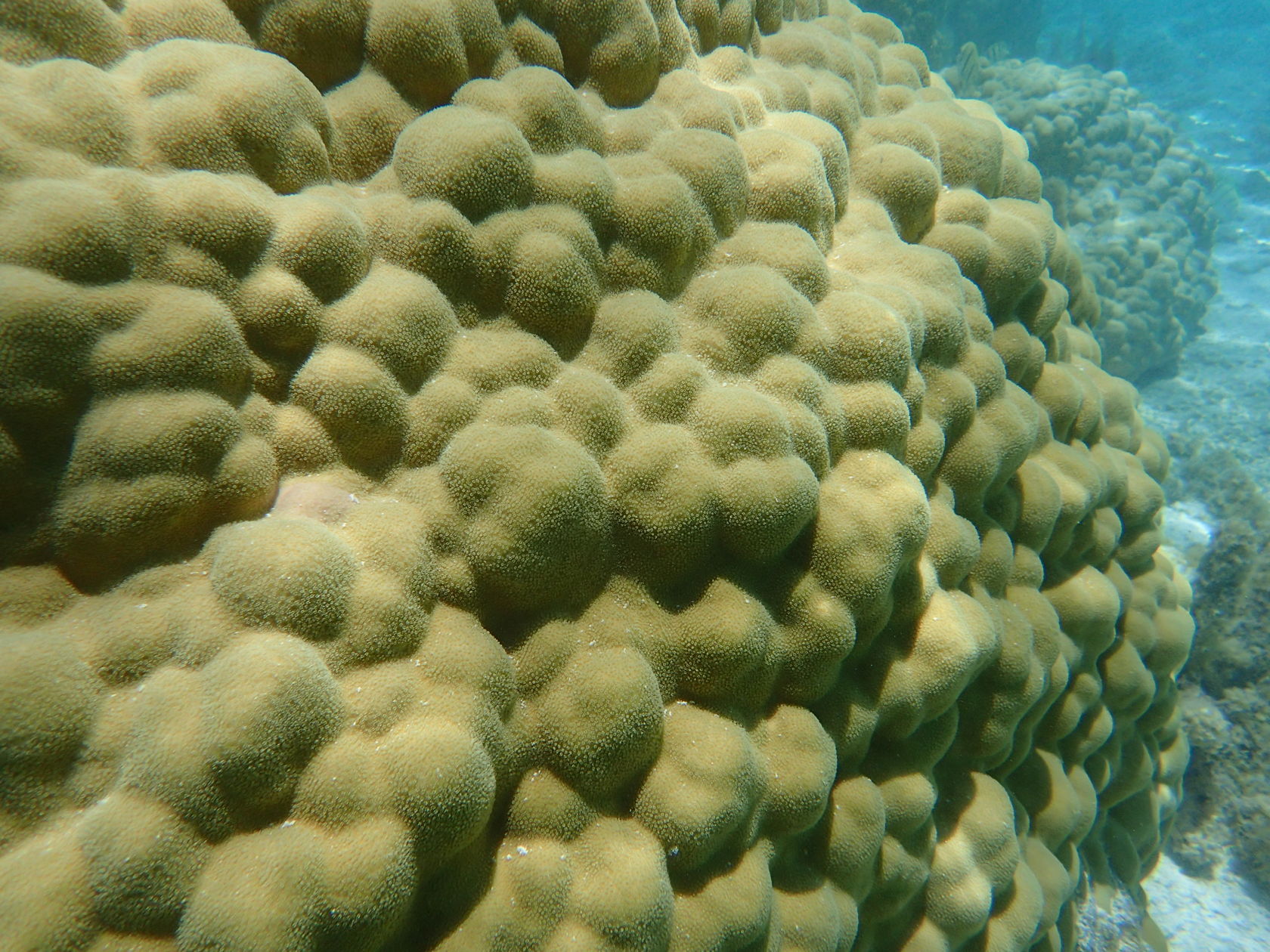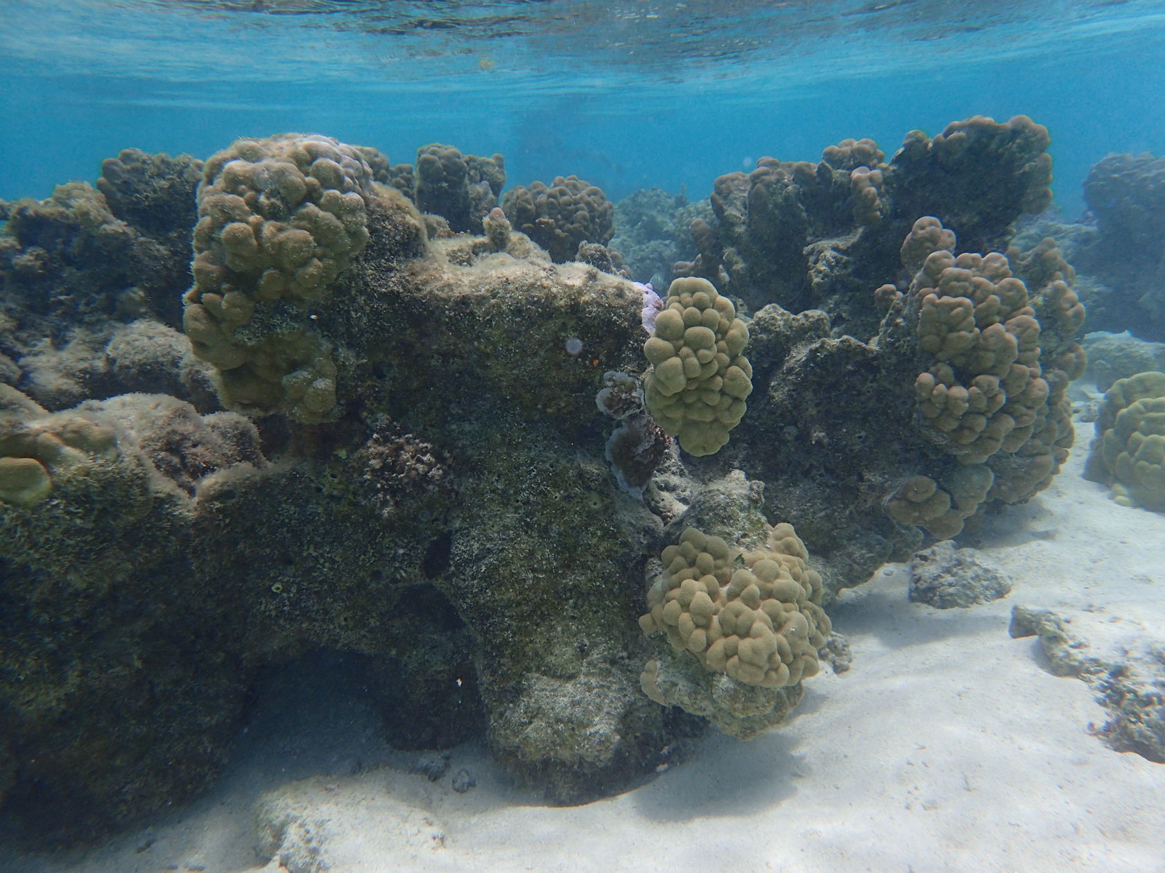 I was able to snorkel some. I was initially disappointed by the seagrass and sand upon entering but another snorkeler pointed to an area where he said there were corals. Sure enough, as one went out the water cleared up some and coral encrusted boulders appeared. I didn’t feel comfortable going very far out since I was soon the only person in the water, but did go far enough to see many interesting features. Some of the photos, taken with an Olympus TG-4 underwater camera, are shown below.