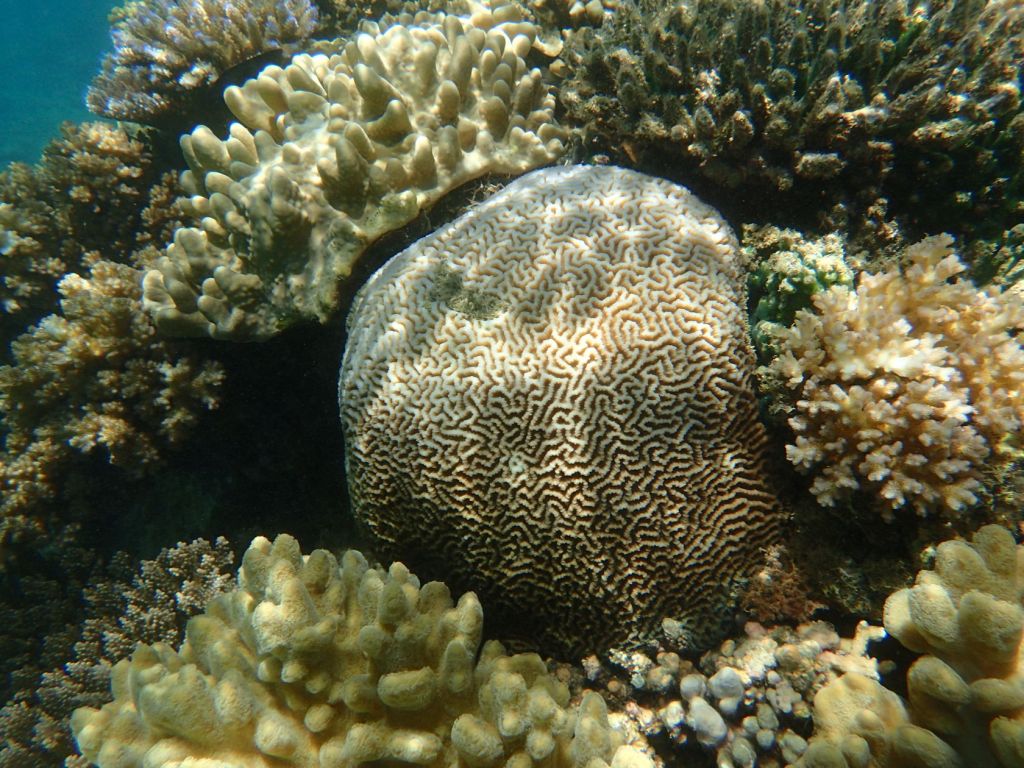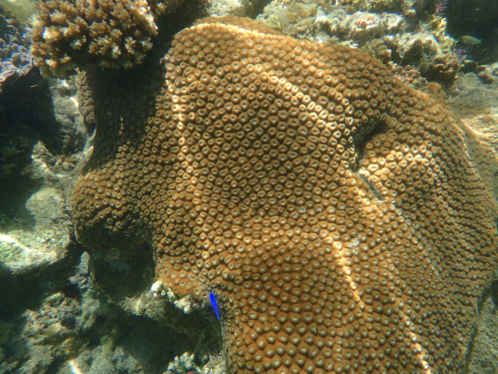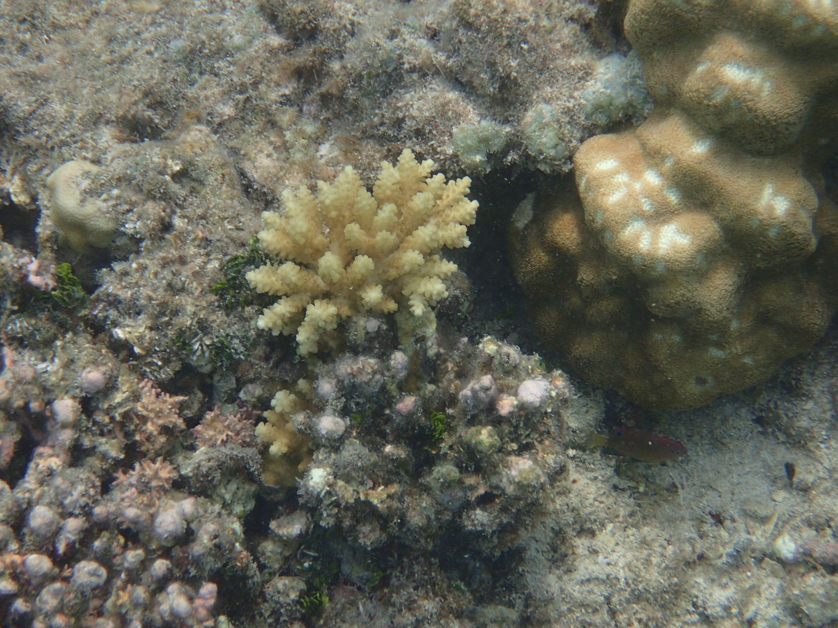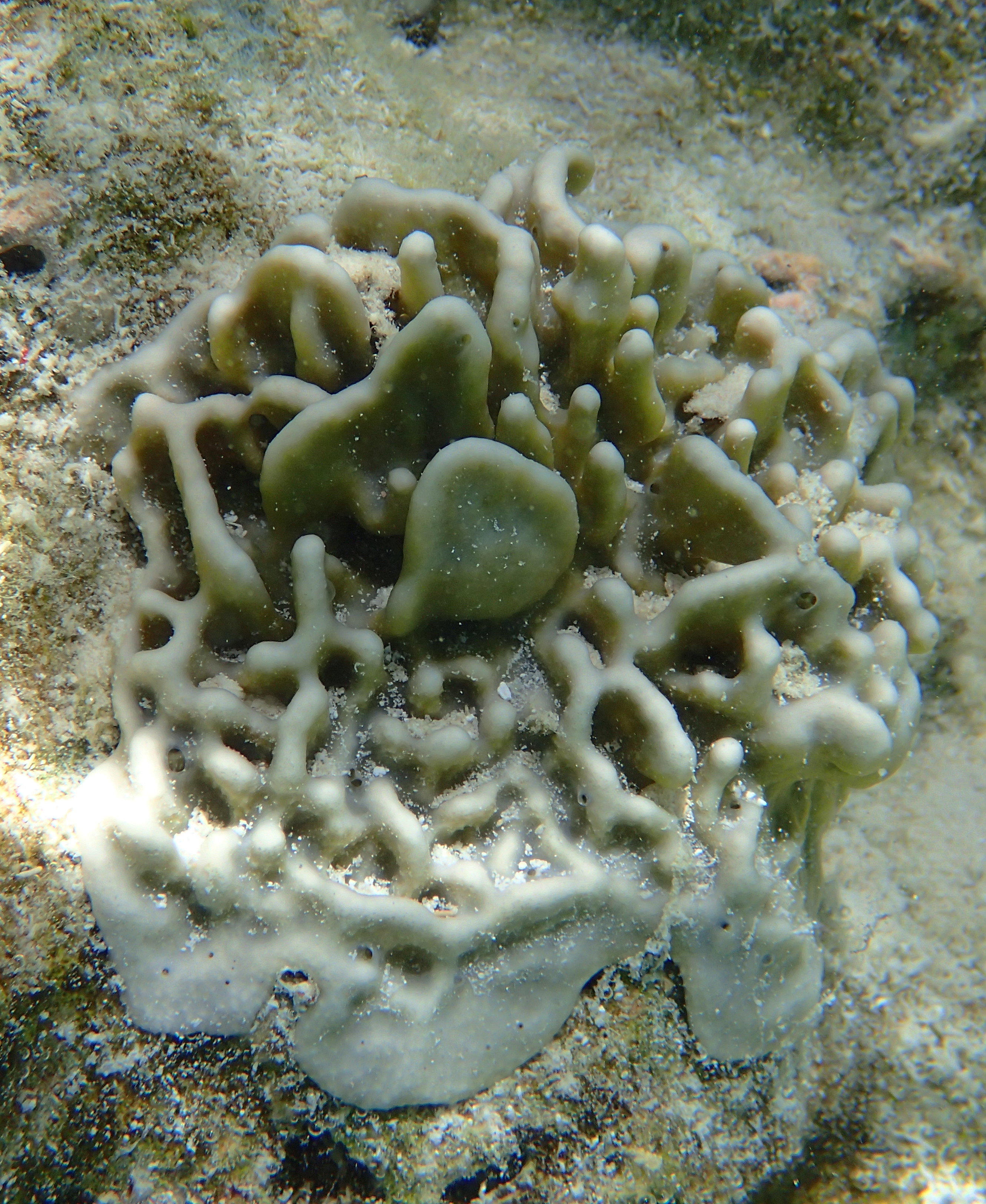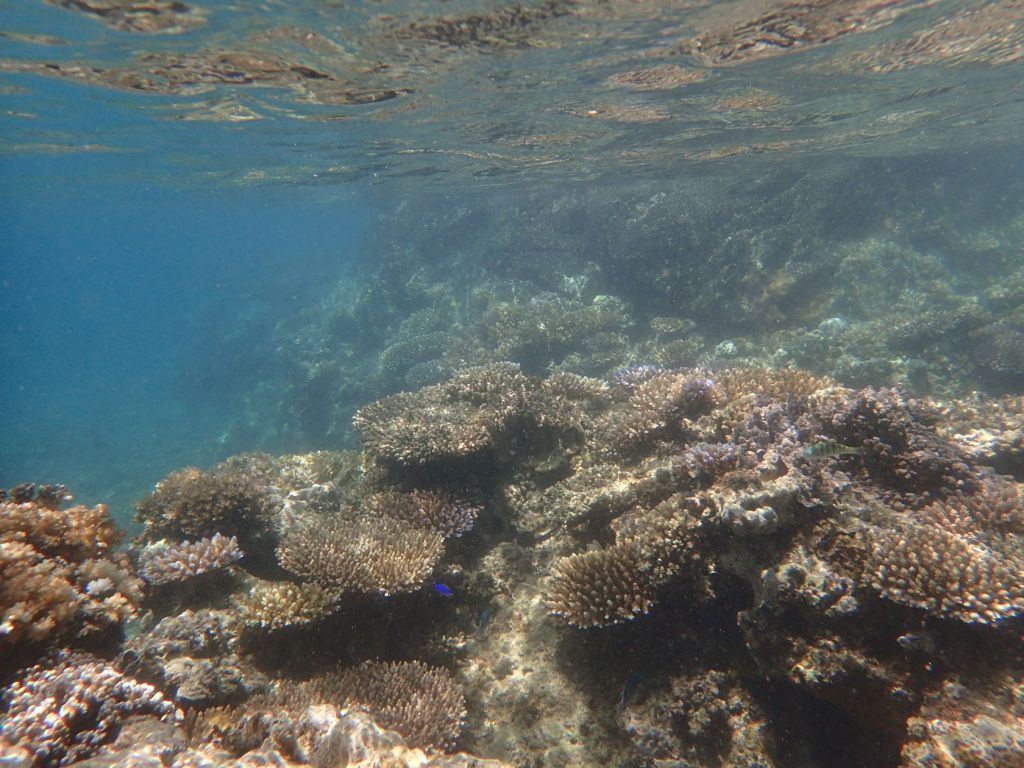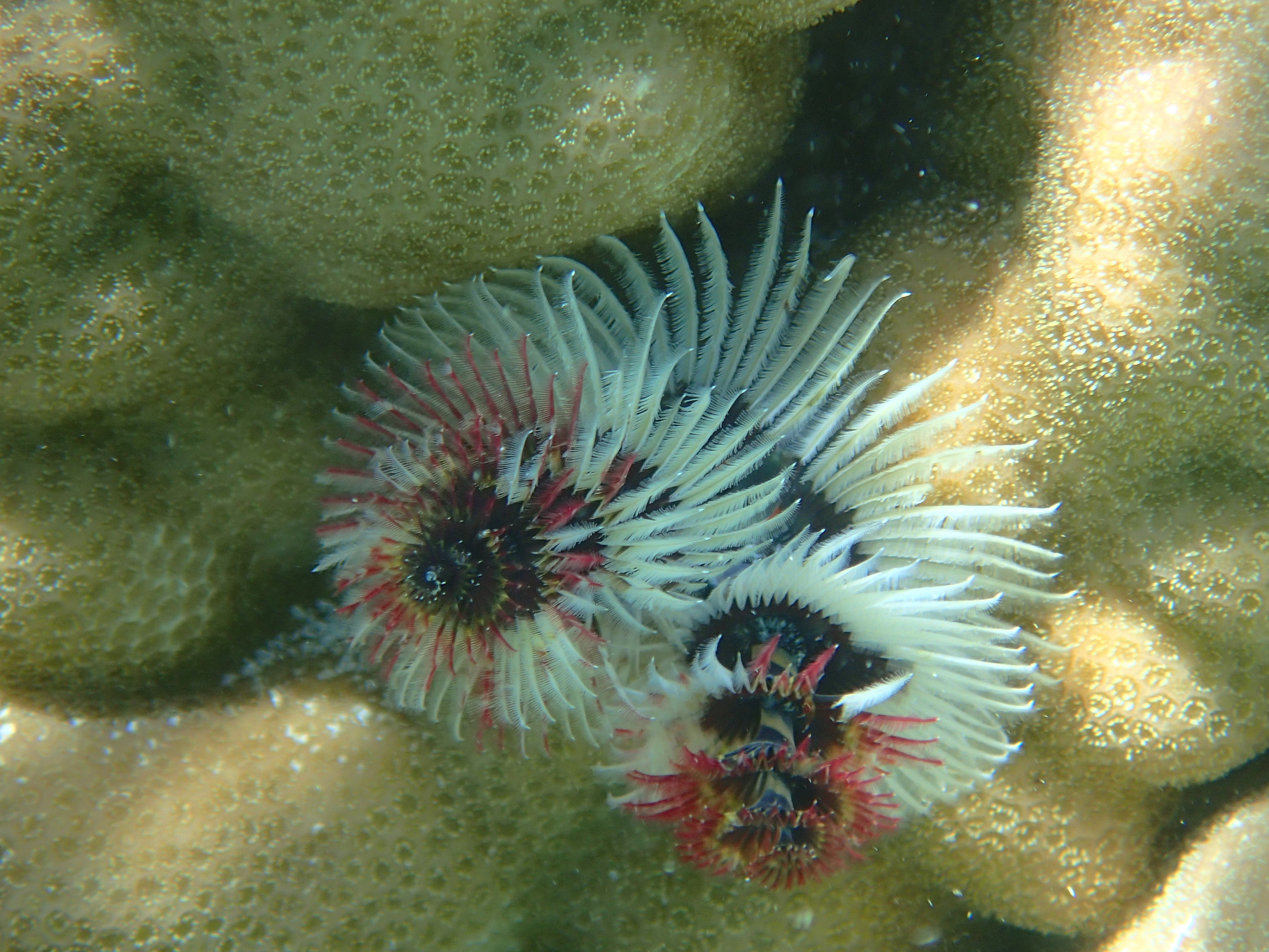 I was able to snorkel some. I was initially disappointed by the seagrass and sand upon entering but another snorkeler pointed to an area where he said there were corals. Sure enough, as one went out the water cleared up some and coral encrusted boulders appeared. I didn’t feel comfortable going very far out since I was soon the only person in the water, but did go far enough to see many interesting features. Some of the photos, taken with an Olympus TG-4 underwater camera, are shown below.