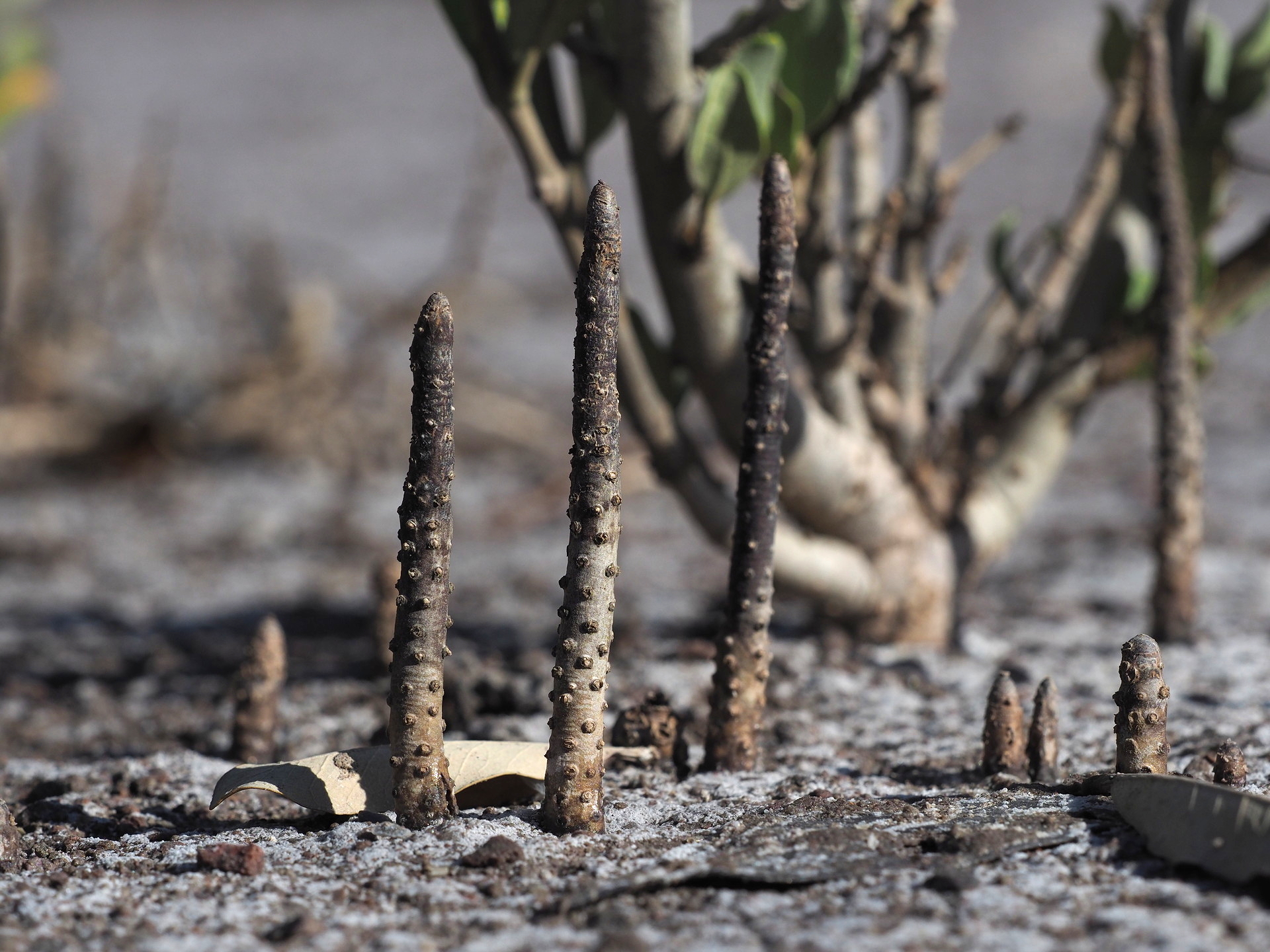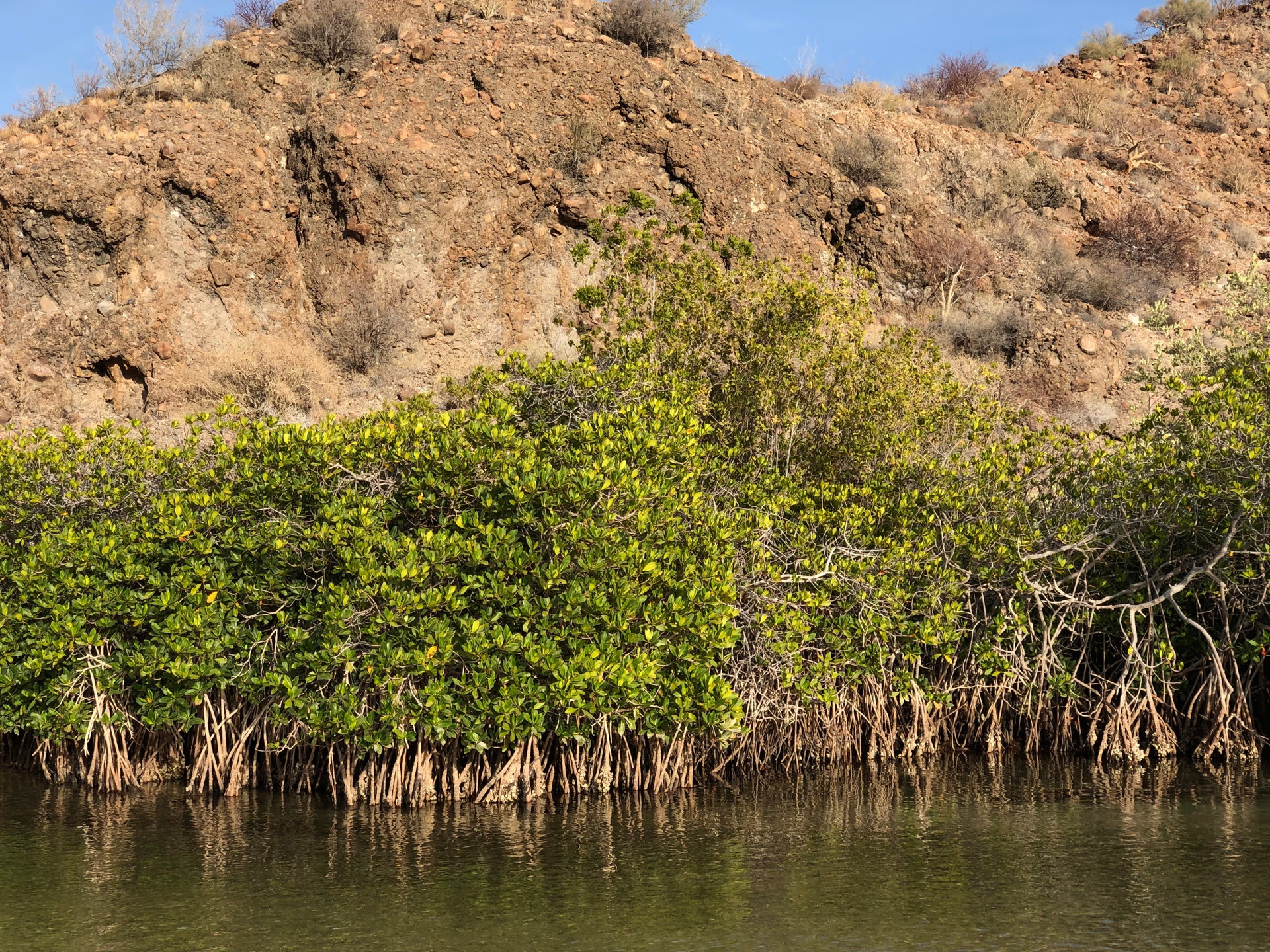 Mangroves are salt-tolerant trees or large shrubs that occur on weak wave-action coastlines throughout the tropics. They come from different plant families, but have certain salt management characteristics in common. In Baja California there are four common species (depending on how you define “mangrove”), the Red Mangrove (Rhizophora mangle), Black Mangrove (Avicennia germinans), White Mangrove (Laguncularia racemosa) and Buttonwood (Conocarpus erectus). These four species dominate any mangrove environment in the Americas, which is very poor in species compared with east Asia and the western Pacific. In Baja California by far the most common are Rhizophora and Avicennia.