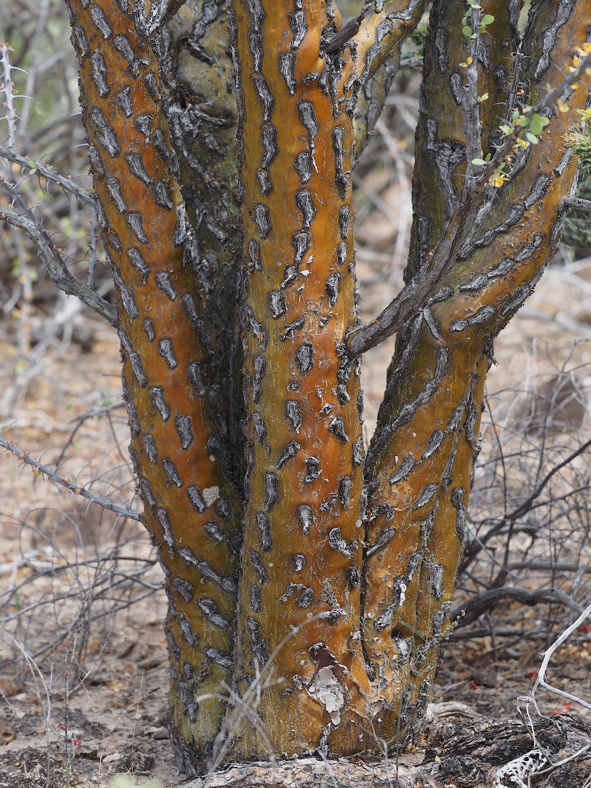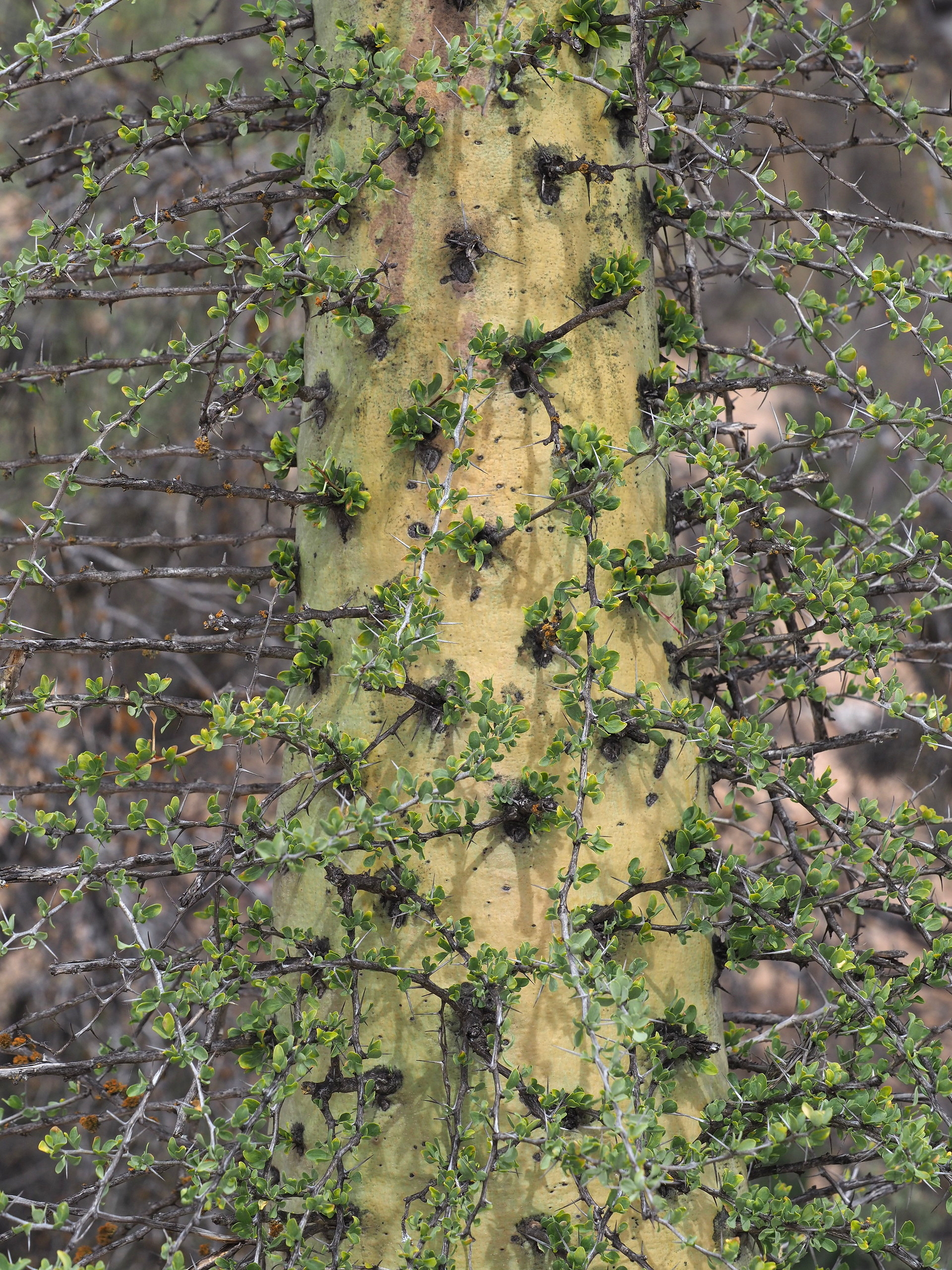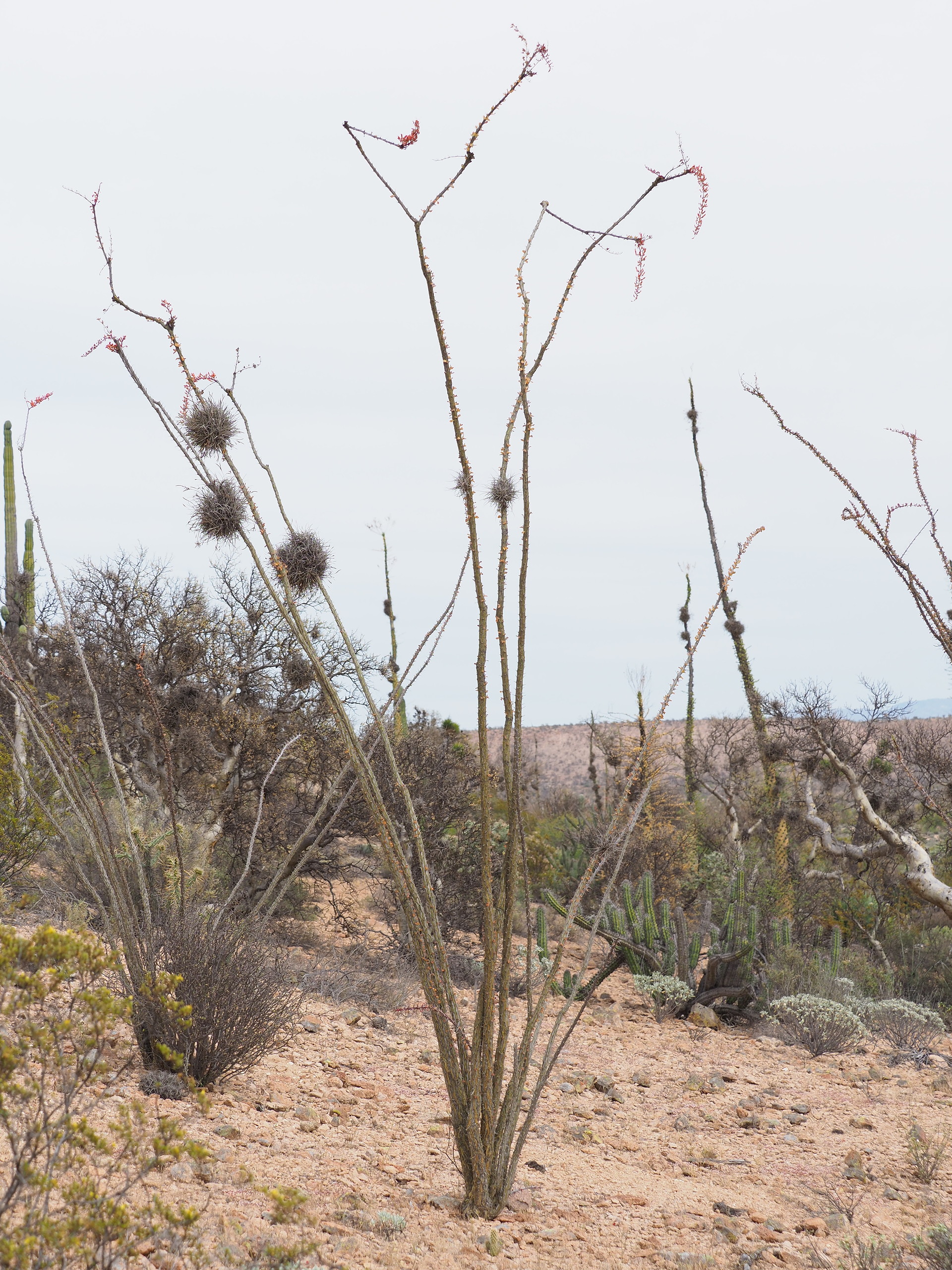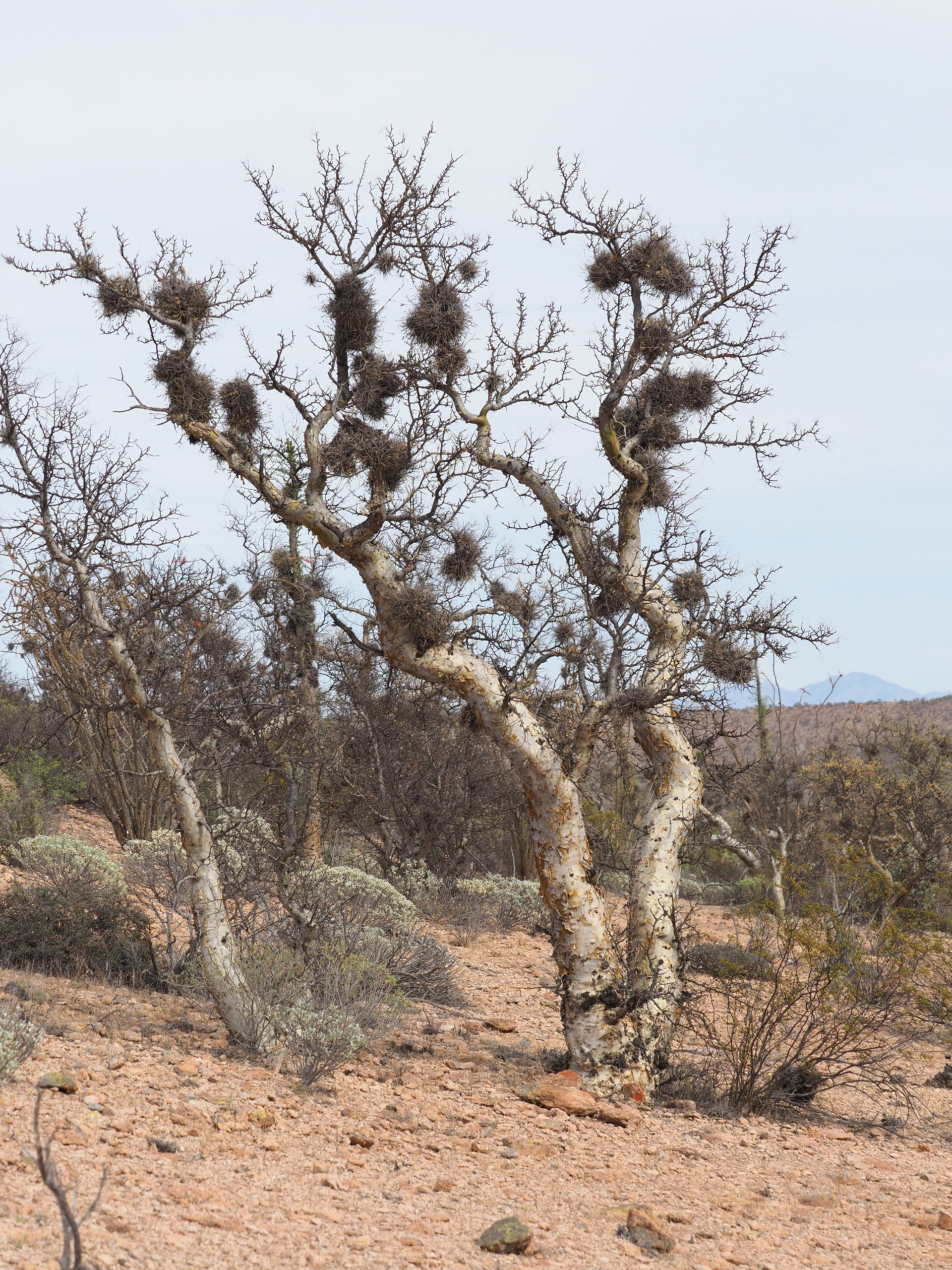Non-succulent xerophytes that are obvious members of the landscape include various Elephant Trees (genus Bursera of the Burseraceae) and the Baja California Elephant Tree (Pachycormus discolor) of the Anacardiaceae. Perhaps the most iconic plant of the Baja California Central Desert is the Cirio or Boojum (Fouquieria columnaris) – looking like an inverted carrot. Three other Fouquieria species are dominant plants in much of the landscape.
