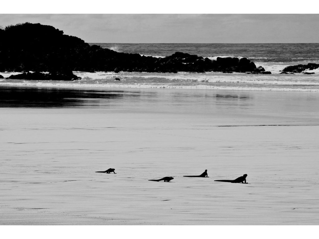 3) Tortuga Bay. For this we took a taxi (taxis are $1 each anywhere in Puerto Ayora) to the trail entrance. Then we climbed the steps to the park office where you register. The trail is paved with lava rock and goes through nice dry forest vegetation. Eventually after 30-45 minutes (2.5 km) you arrive at the main beach. This one is primarily used by surfers. You can continue on to another beach that borders a mangrove lagoon (we didn’t go). Many marine iguanas were at the first beach.