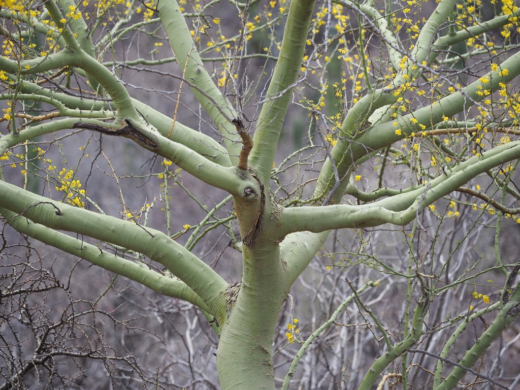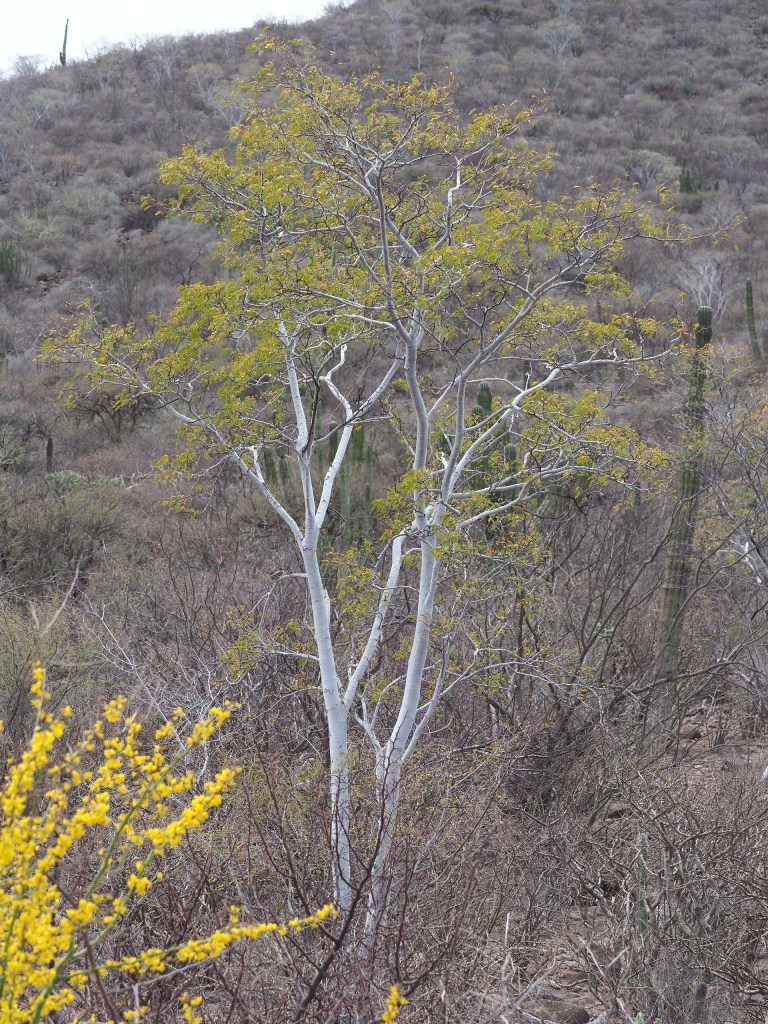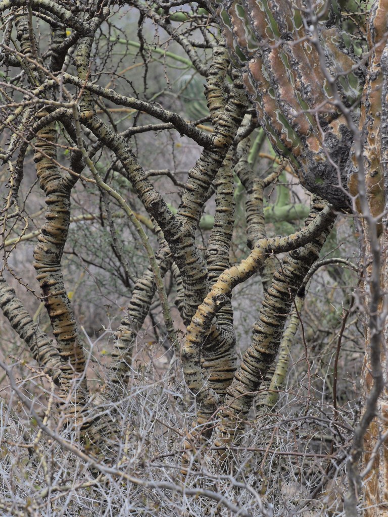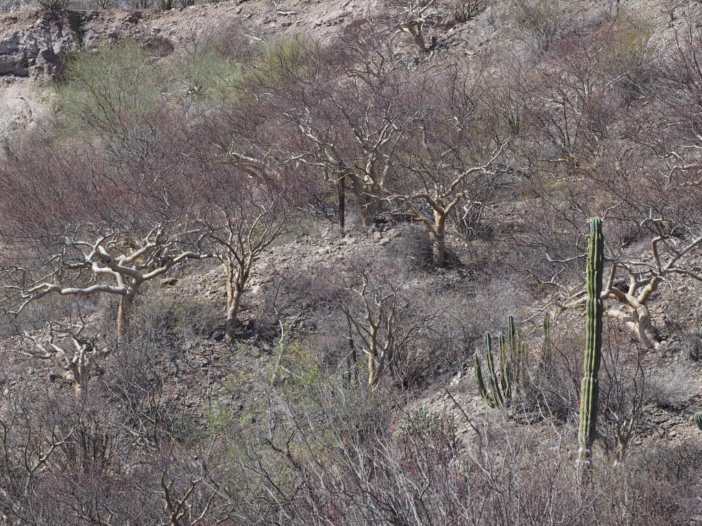 Perhaps the most common large/obvious plants found in the dry Gulf Coastal Desert are plants like Bursera microphylla, the Senita (Lophocereus schottii), various cholla (Cylindropuntia) and the Ocotillo (Fouquieria splendens). (For cactophiles there have been revisions of the taxonomy of the large cacti in Mexico and the Senita and Organ Pipe cactus are now included in Pachycereus.)