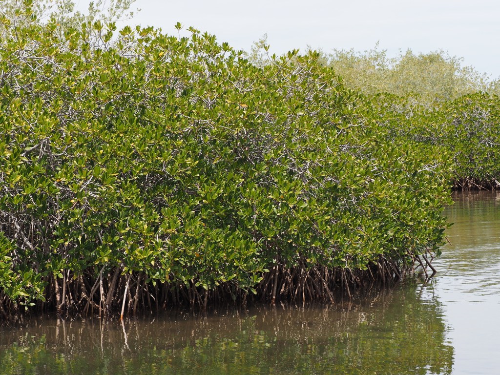 One of the odd aspects of the Central Gulf Desert is that it includes coastal vegetation than can be part of many different floristic regions. In particular, mangrove swamps dominated by two mangrove species (Red Mangrove (Rhizophora mangle) and Black Mangrove (Avicennia germinans) occur here and in many other floristic realms in the Americas. Their occurrence is essentially independent of the local climate – except they cannot take much frost or coastlines with strong wave action. The wave action criteria is a consequence of the mangroves requiring silty mudflats for their propagation – especially the Red Mangrove that drops its long seeds that eventually anchor into the soft mud.