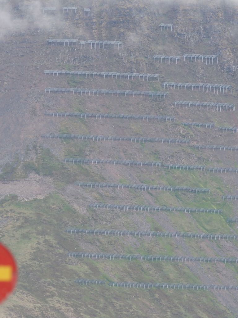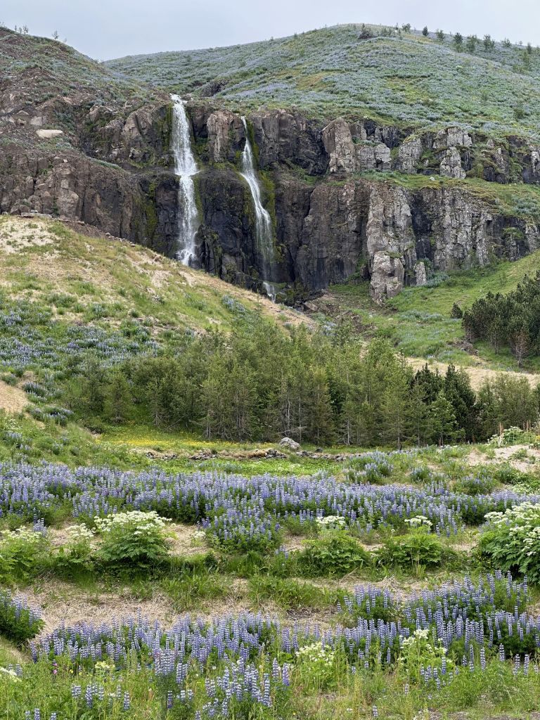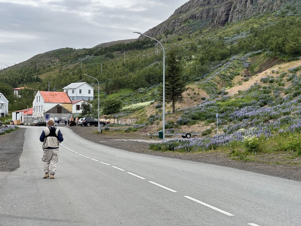Our second visit to this small port town, we finally discovered a formal trail network that climbed above the fjord and allowed us to visit natural landscapes that were not actively grazed by sheep. The trail is steep in places and the trail (4×4 road) has many loose rocks that require careful footing in places, so it would not be for many cruise ship passengers. But it isn’t dangerous in any way other than possible slipping, and leads to a concrete monstrosity that is advertised as “art”. There are some interesting acoustics associated with the small concrete domes, but otherwise the only reason for hiking the trail up perhaps 300 ft in elevation is for the view of the fjord and the abundant wildflowers along the way. We didn’t have energy or time to hike the full trail network that goes for at least a few more miles and loops, but more energetic walkers with less time constraints could find this productive.