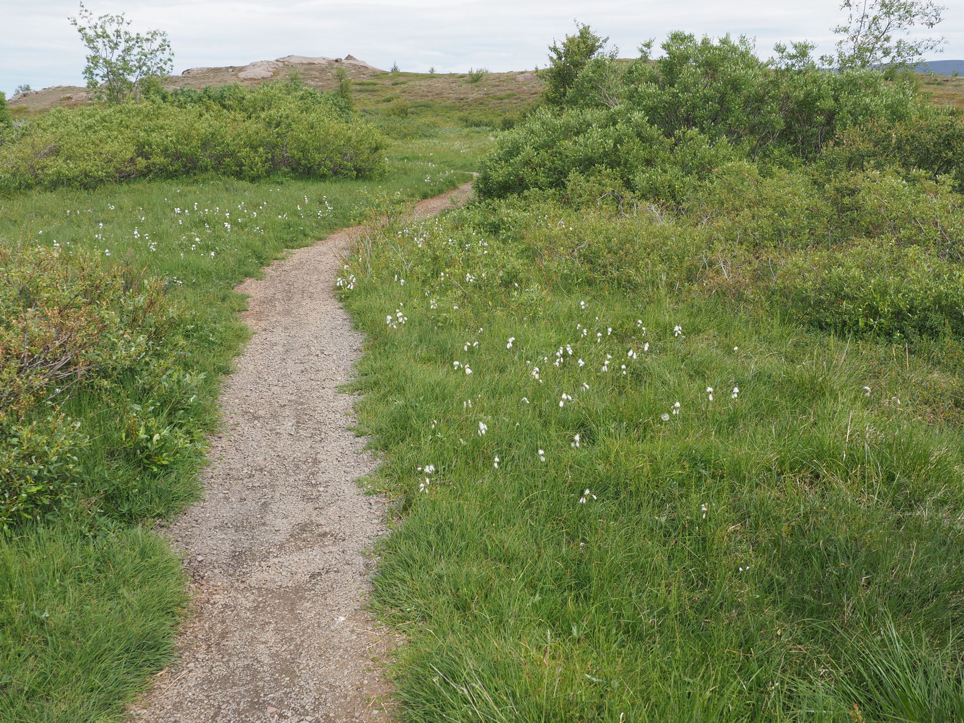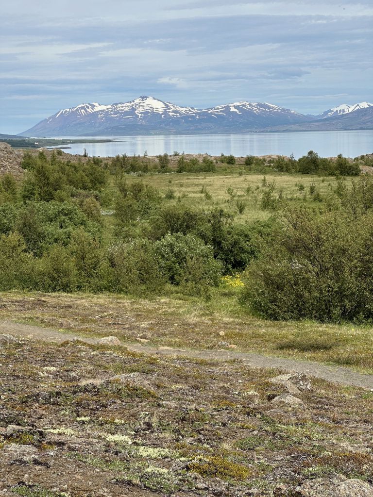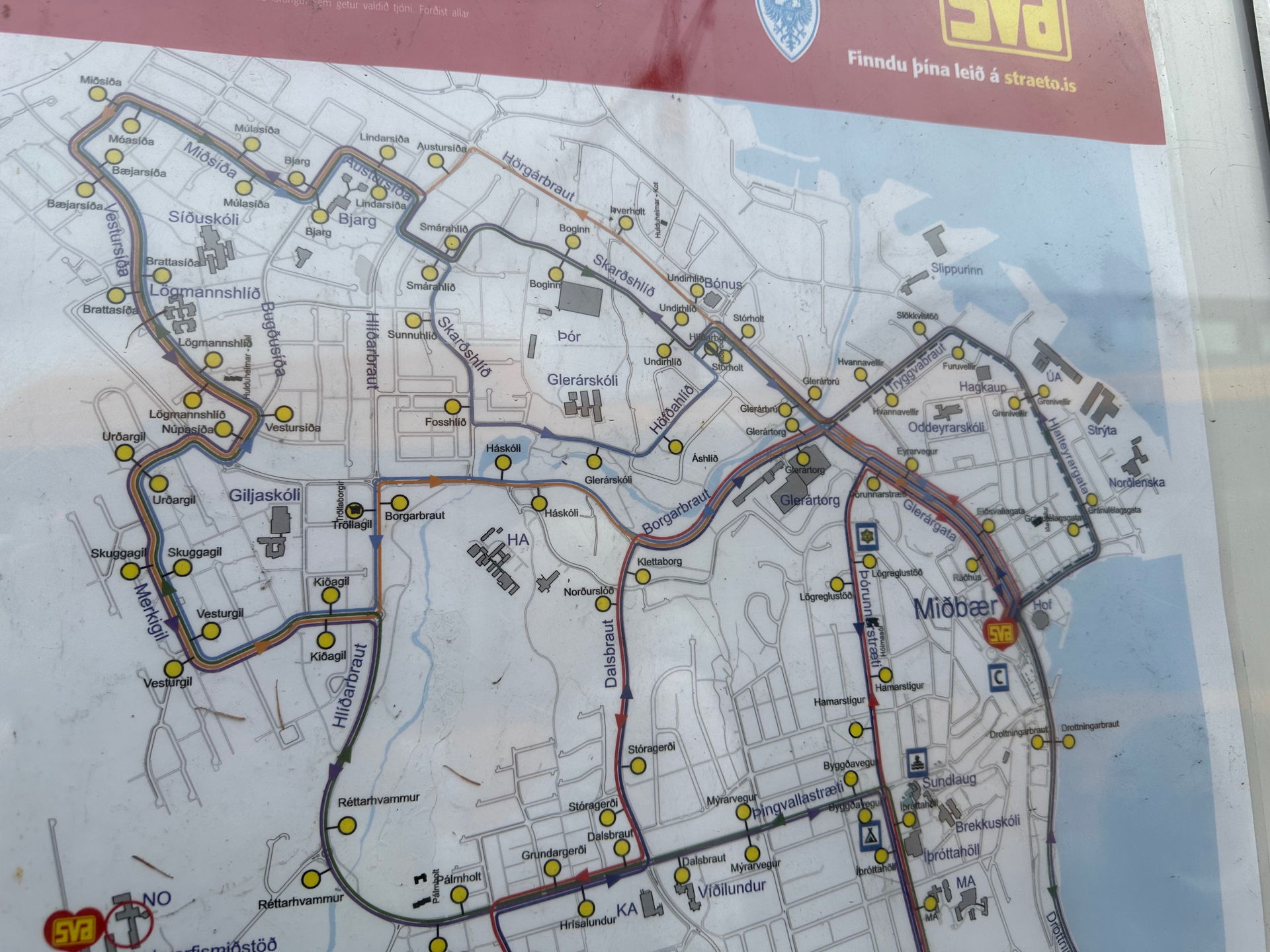 Getting to the hiking area involved a surprise. Since we first went to the visitor information center near the dock I asked how one might get to the area north of town. The person pointed out that the bus network in Akureyri was free and he found a bus route map that showed the various bus routes. The times he wasn’t sure of but the bus station was just across the street! So we went and waited not too long for the hourly bus to start its route. Via the bus we were able to get closer to our destination and to save a hill climb of a couple hundred feet elevation. Since we were not sure of the bus route, we probably could have saved another half-mile of walking.