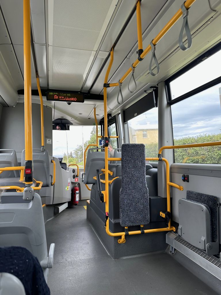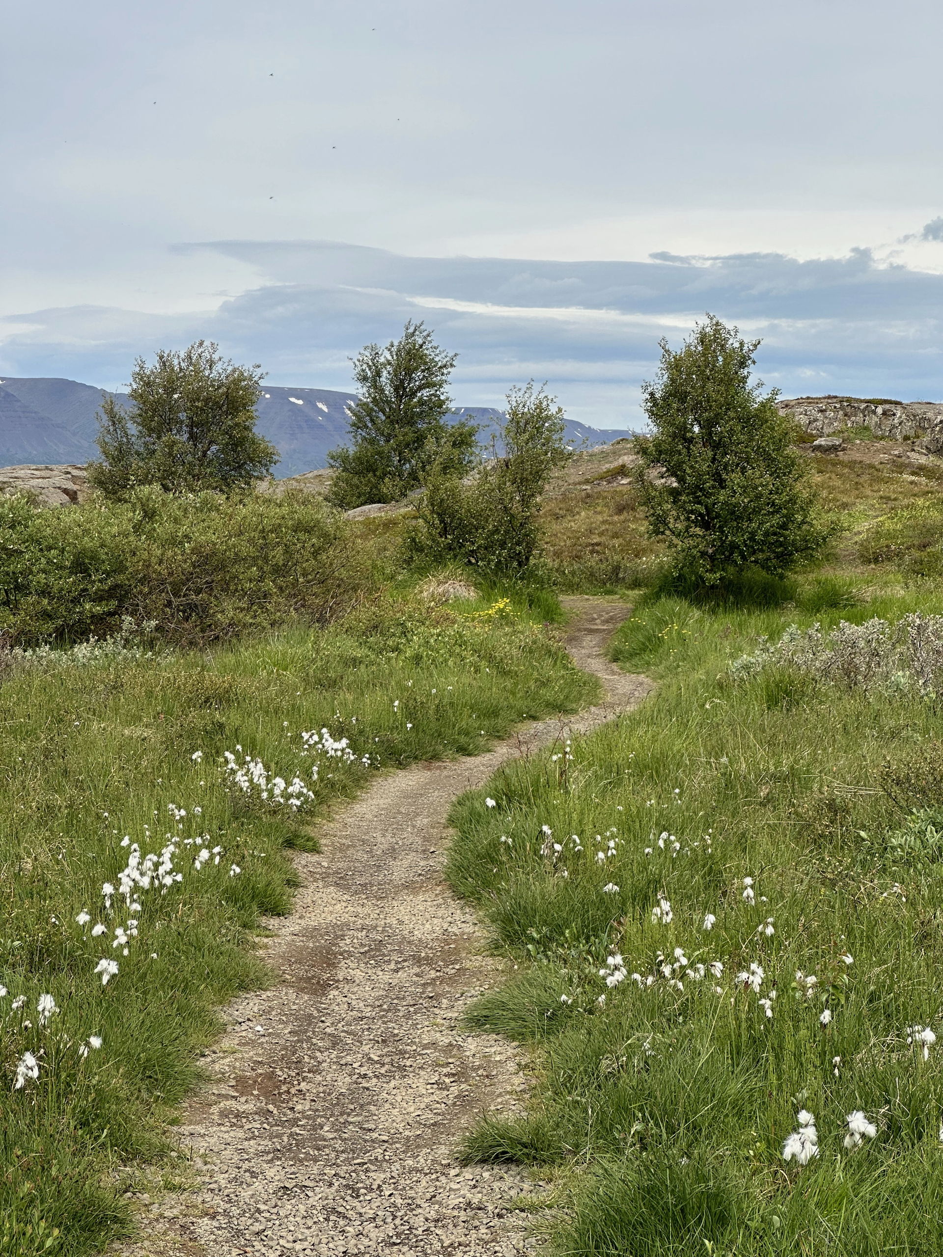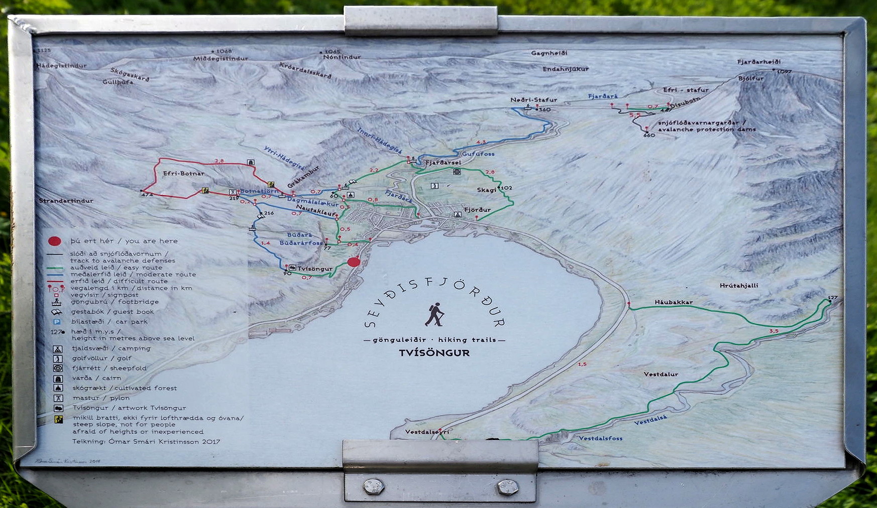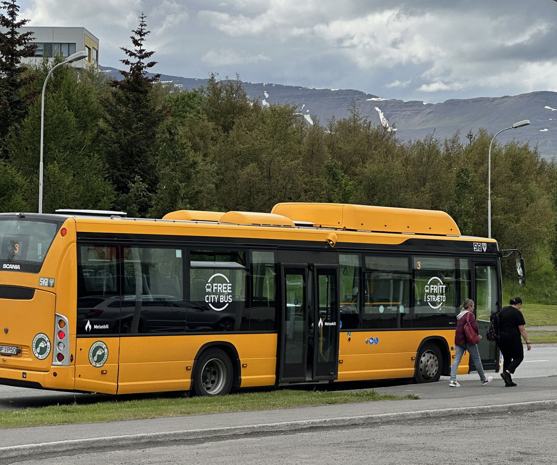 Getting to the hiking area involved a surprise. Since we first went to the visitor information center near the dock I asked how one might get to the area north of town. The person pointed out that the bus network in Akureyri was free and he found a bus route map that showed the various bus routes. The times he wasn’t sure of but the bus station was just across the street! So we went and waited not too long for the hourly bus to start its route. Via the bus we were able to get closer to our destination and to save a hill climb of a couple hundred feet elevation. Since we were not sure of the bus route, we probably could have saved another half-mile of walking.