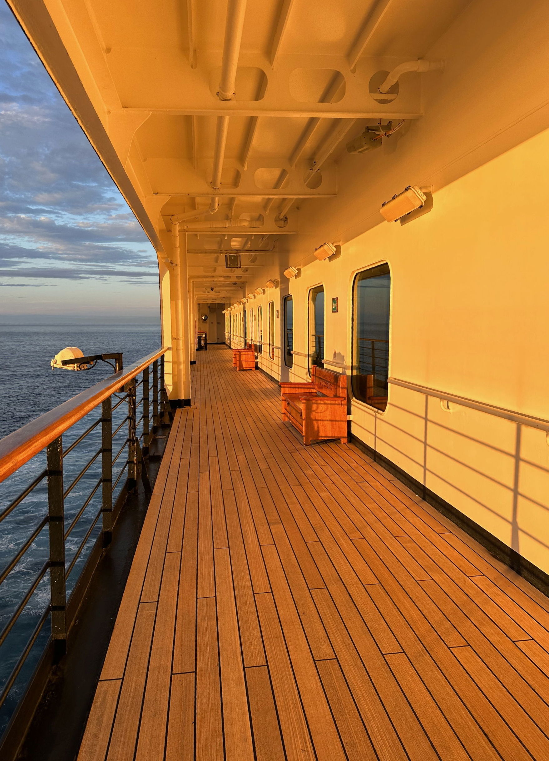 We like to spend lots of time on the promenade, walking and looking for whales or pelagic birds – or anything else. Unfortunately the water (and this air) temperatures on our cruise were rather cool 6-10˚C, so it wasn’t balmy. But that comes with the territory.