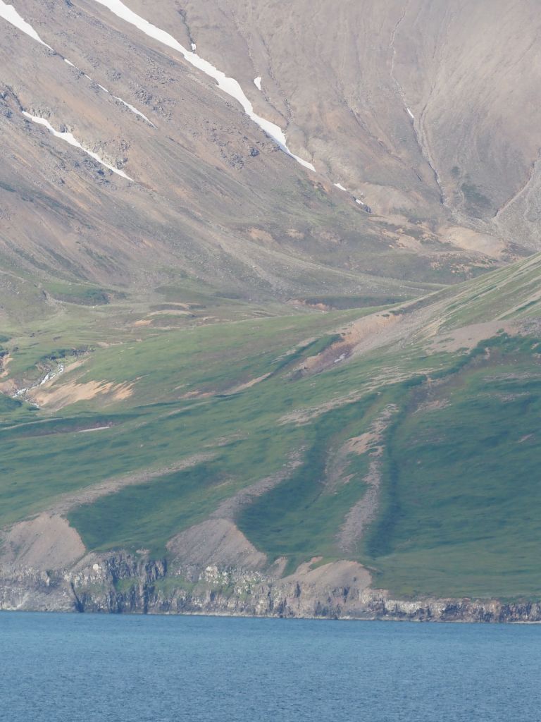 The arctic tundra vegetation we saw along our walk was interesting, and perhaps the most natural vegetation (fewest human modifications) that we saw in Norway. Of course, there was little potential use of such landscapes. We were surprised to see a handful of reindeer grazing in the distance with their calves nearby. Of course, like many passengers, we had see reindeer walking through the parts of town we visited and were told by locals that they come down in summer for “better food” in town.