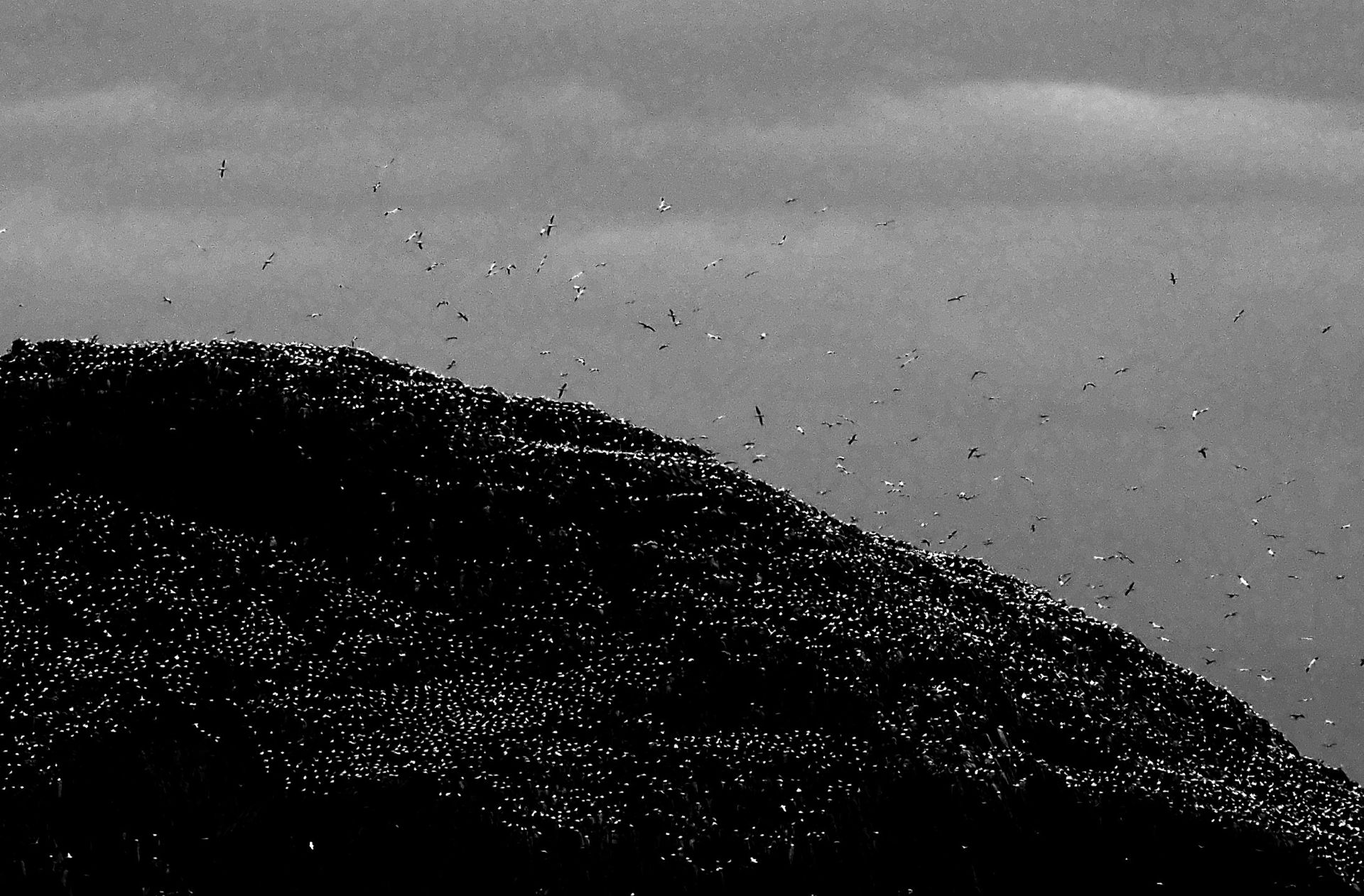 The final aspect of our visit occurred as we were leaving the estuary. We had noticed that Northern Gannets were relatively common around the Edinburgh waters and as we approached a small island near the open ocean we could see that it was covered in guano. It turned out that this island was the largest Northern Gannet colony anywhere. There have been as many as 150,000 birds on the island, which is a nature preserve now.