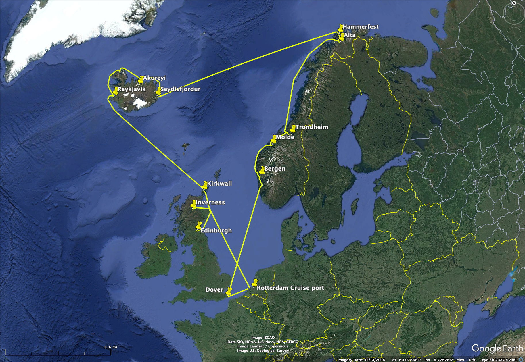 Here we quickly summarize our cruise route. The cruise was billed as a Midnight Sun one – which we did indeed experience for approximately 5 days when we were above the Arctic Circle around the Summer Solstice. Weather was very good the first part of the cruise but was cloudy/rainy by the time we reached Reykjavik, but the Scotland ports were overcast but otherwise OK. The cruise route is shown in the figure below.