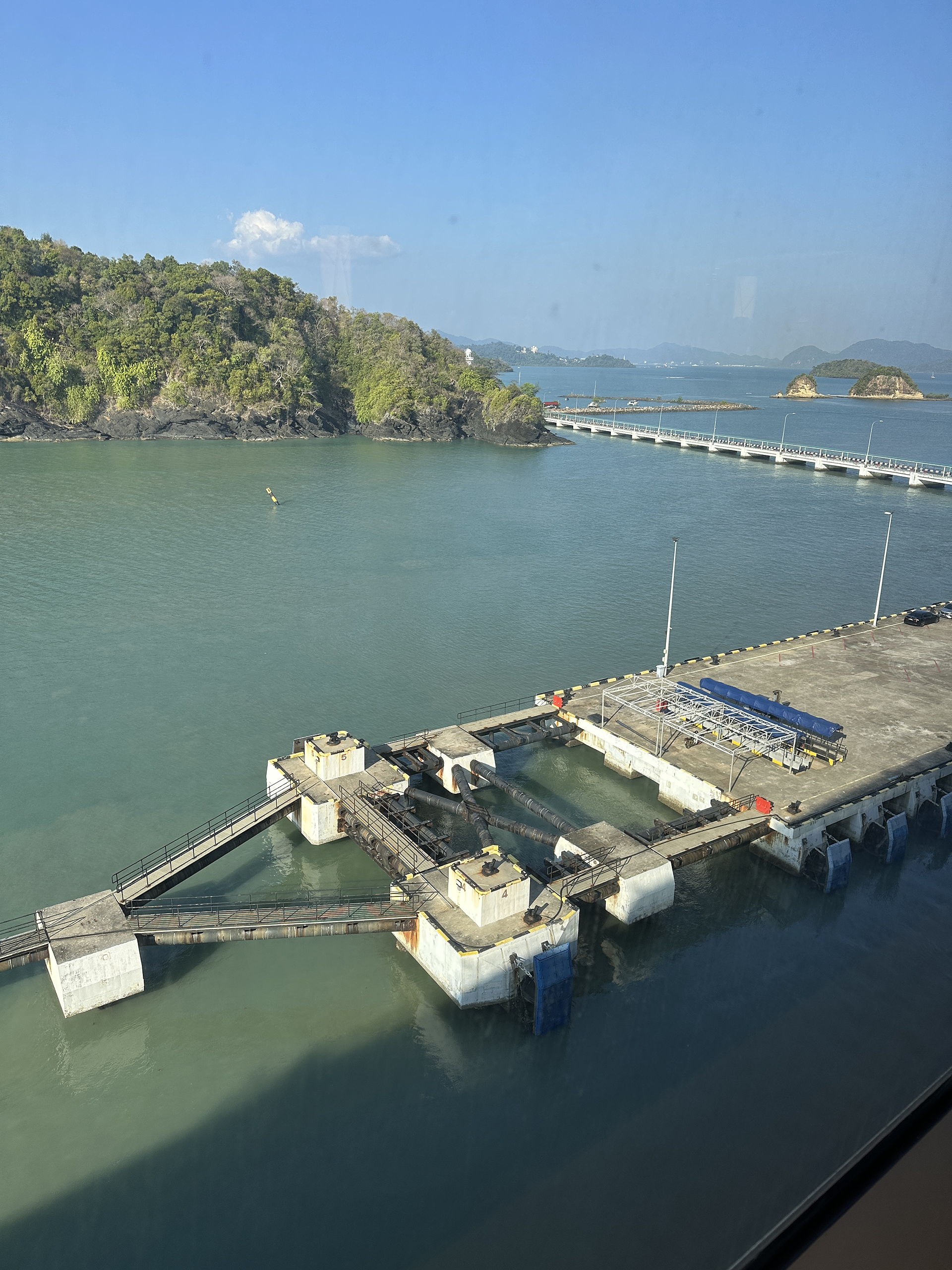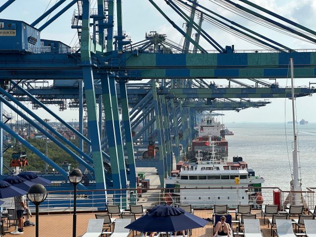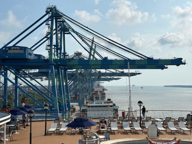 We visited a Botanic Garden which was OK, and only half the distance to Kuala Lumpur. It was still quite a way, mostly on a freeway. It had some mostly natural forest areas where we saw some reptiles and such. We were docked at the huge industrial port with endless container cranes.