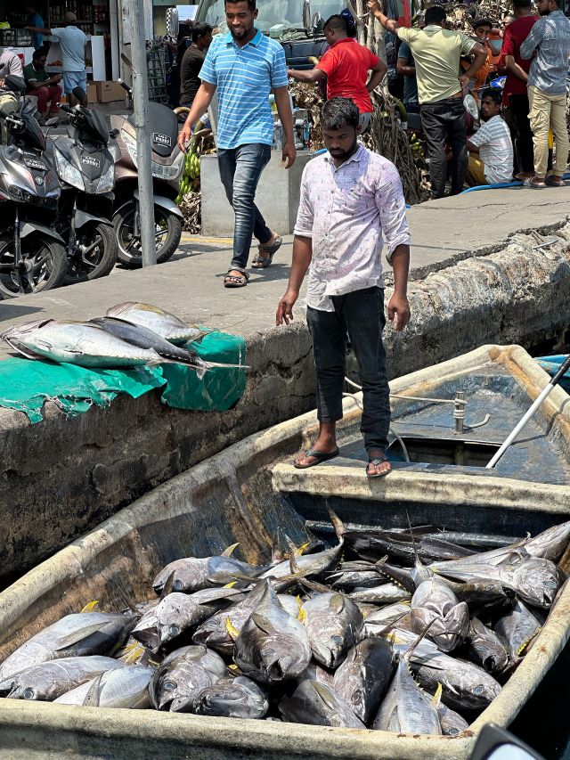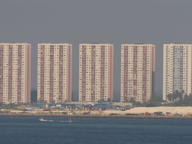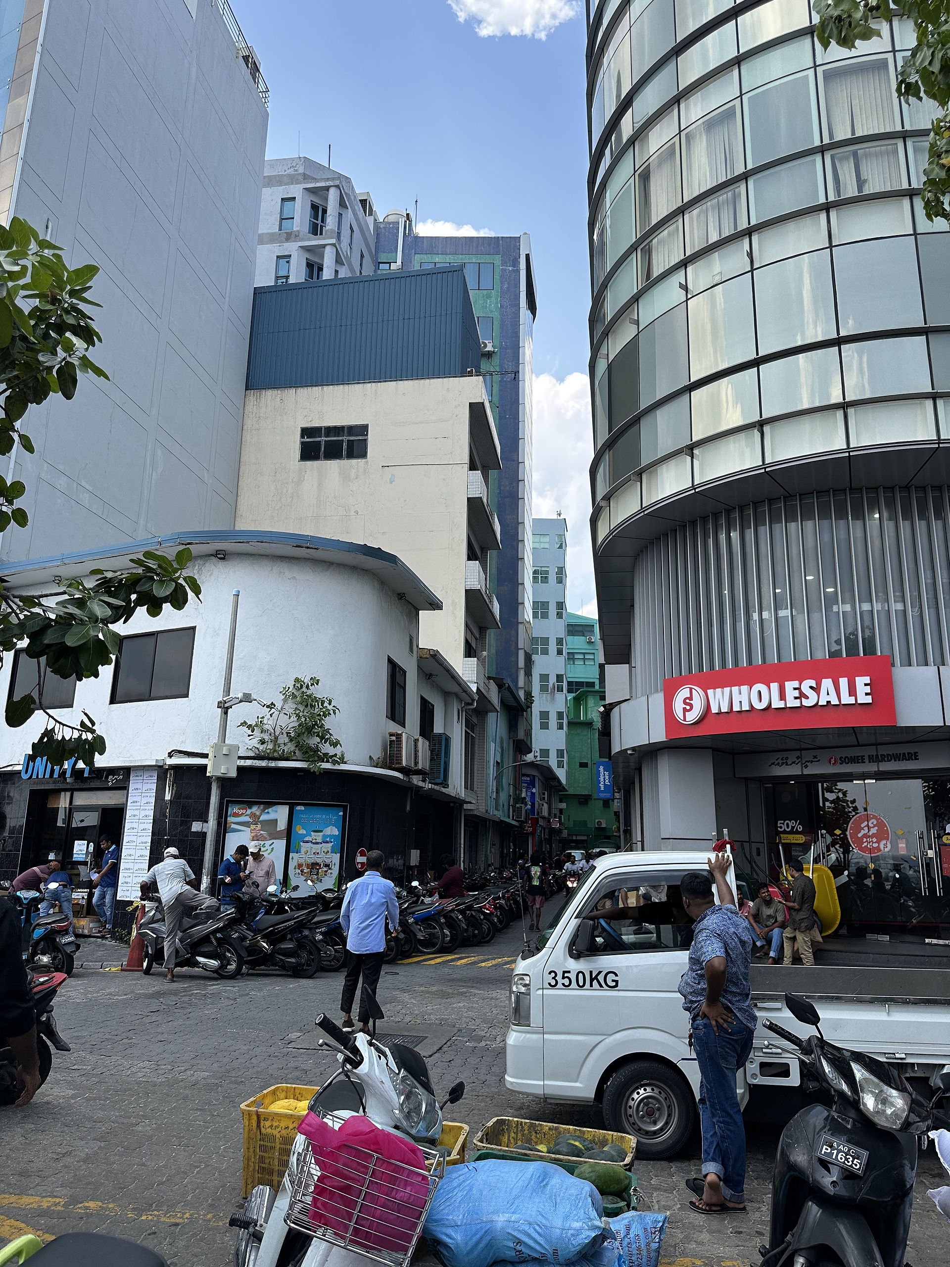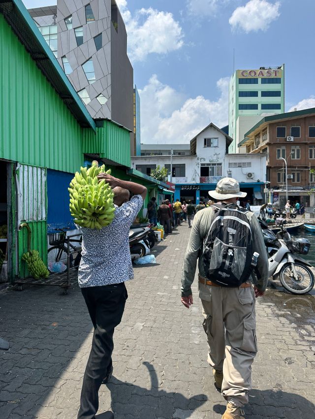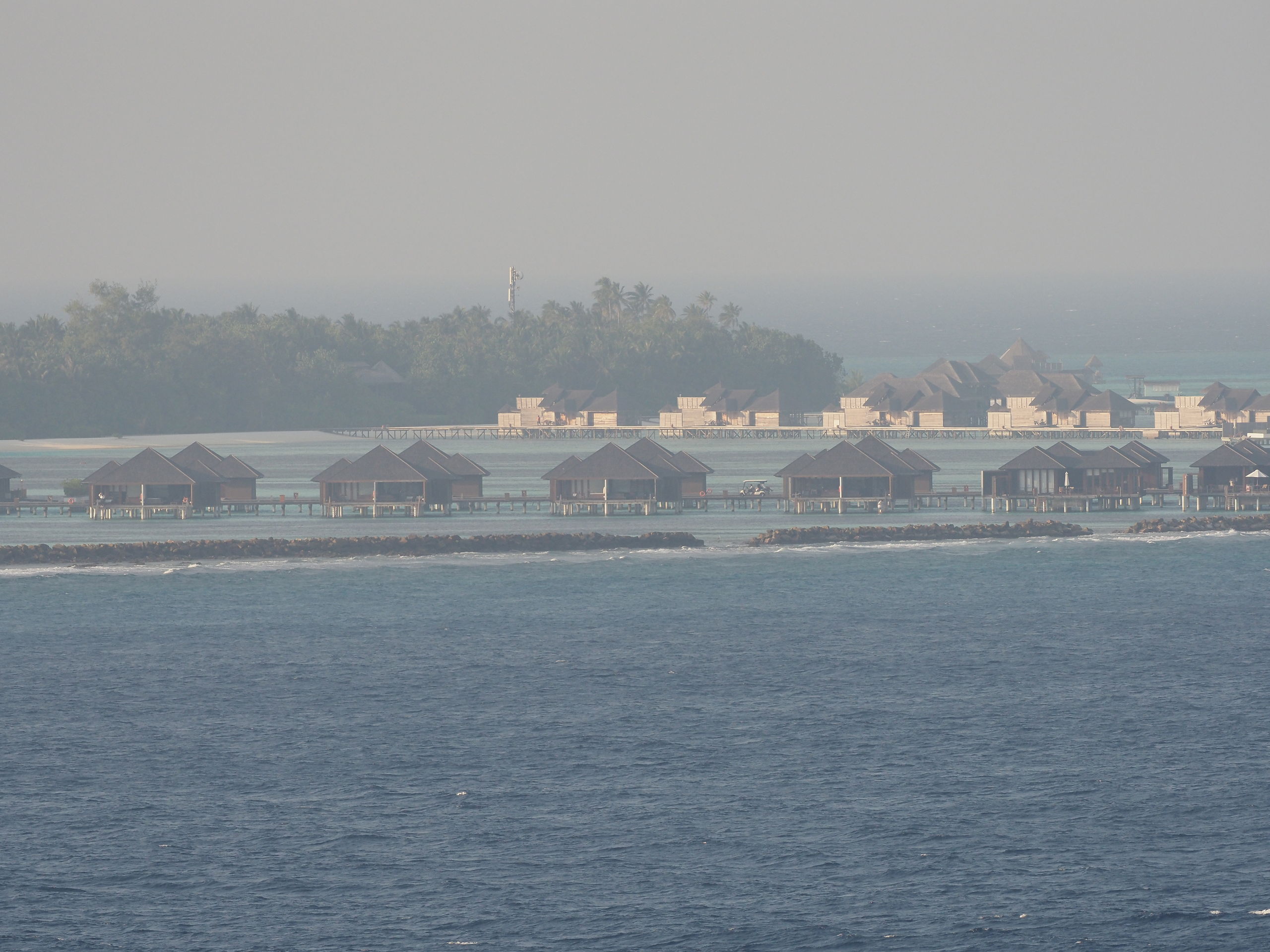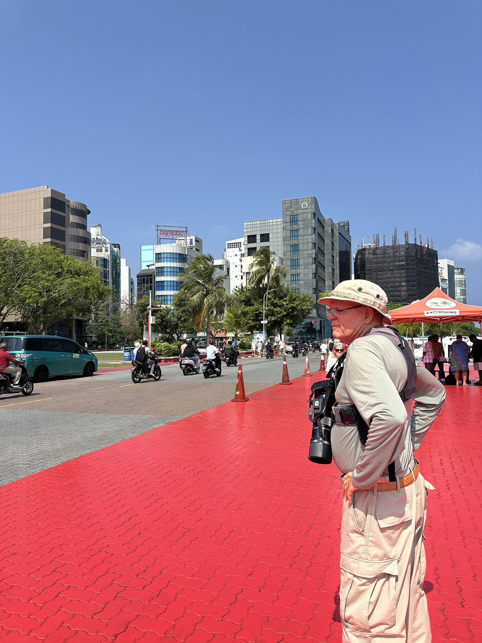 We tendered off the ship to the small port at the main town of Male, and didn’t go very far. There was a small city park with tall trees that had a few interesting birds and fruit bats hanging out. Also a somewhat interesting small market. But it was hot, humid, and we didn’t feel like going very far. And of course the island is only about 1 mile across, so you couldn’t go far if you wanted. Most tourists land at the airport and then immediately take a small seaplane to one of the 100+ resort islands. One resort per island. It looks awful on Google Earth – the amount of manipulation of the original atolls to satisfy tourism demands. Our course, the local workers don’t live in the resorts – see the photo of the large high rise apartments below.