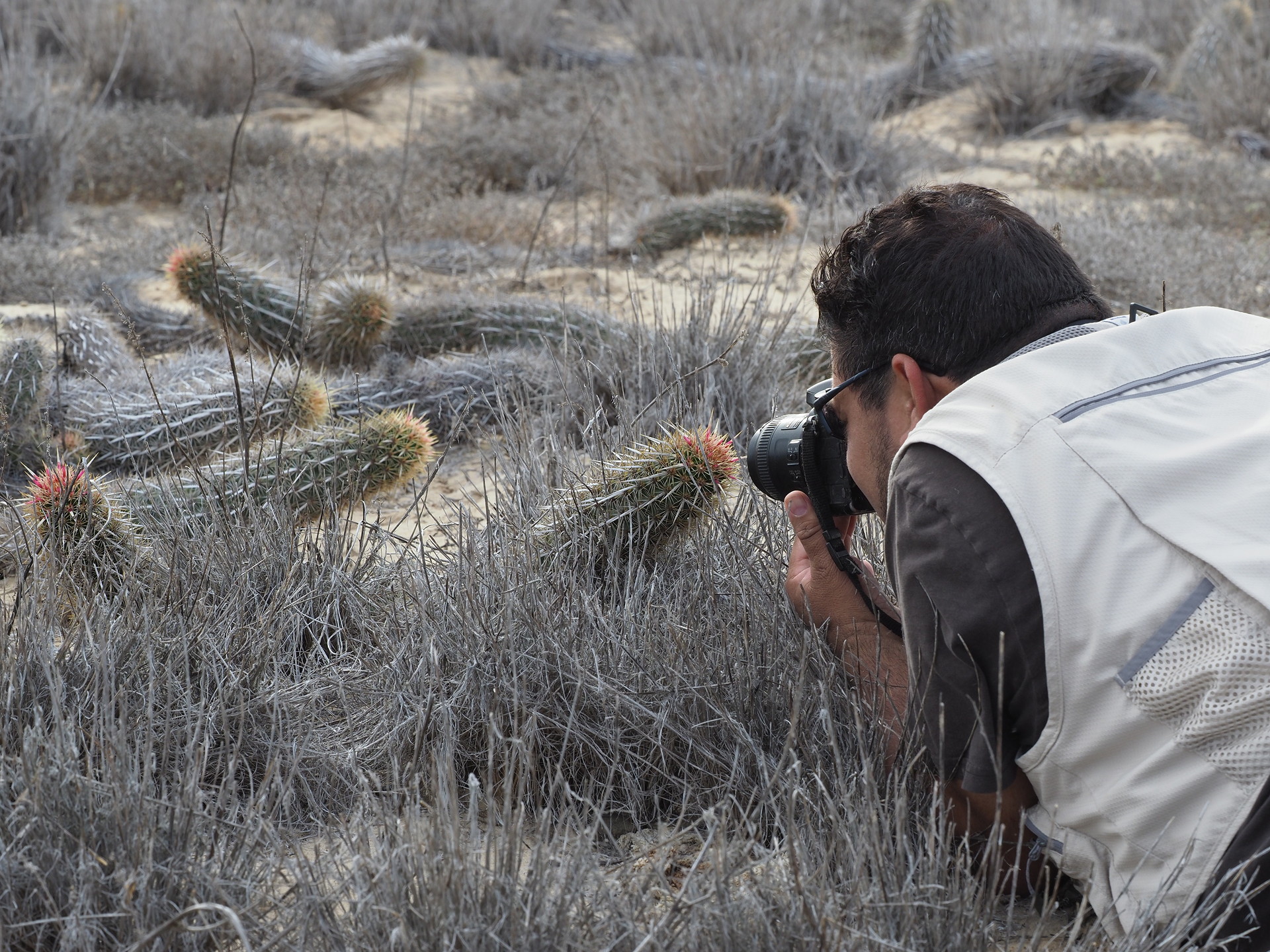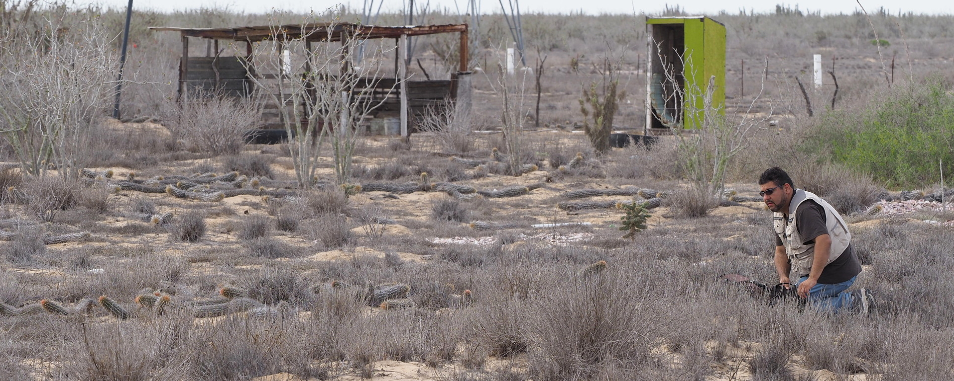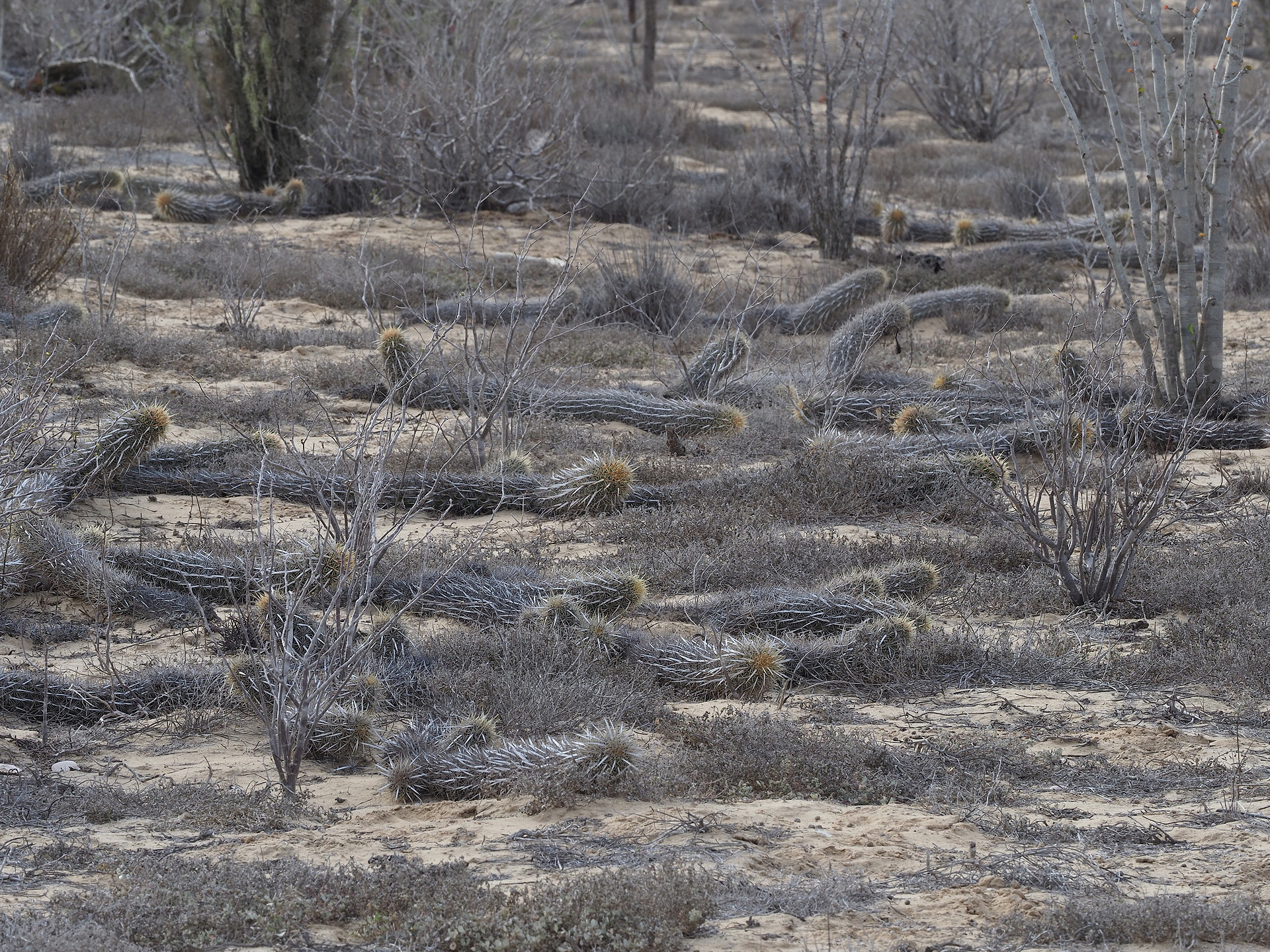 Finding undisturbed vegetation on the plain is another matter. Much of arid Mexico is open range land or poorly-fenced, and evidence of cattle is nearly ubiquitous. The side road to the small port of San Carlos crosses gently undulating vegetation-covered dunes with some salt lakes. Approaching San Carlos one of the more unique cacti in Baja California is found the Creeping Devil (Stenocereus eruca). Most visitors to Baja California never see this cactus because of its limited range on the Magdalena Plain- well off the main North-South Highway and the fact that it grows along the ground rather than upward.