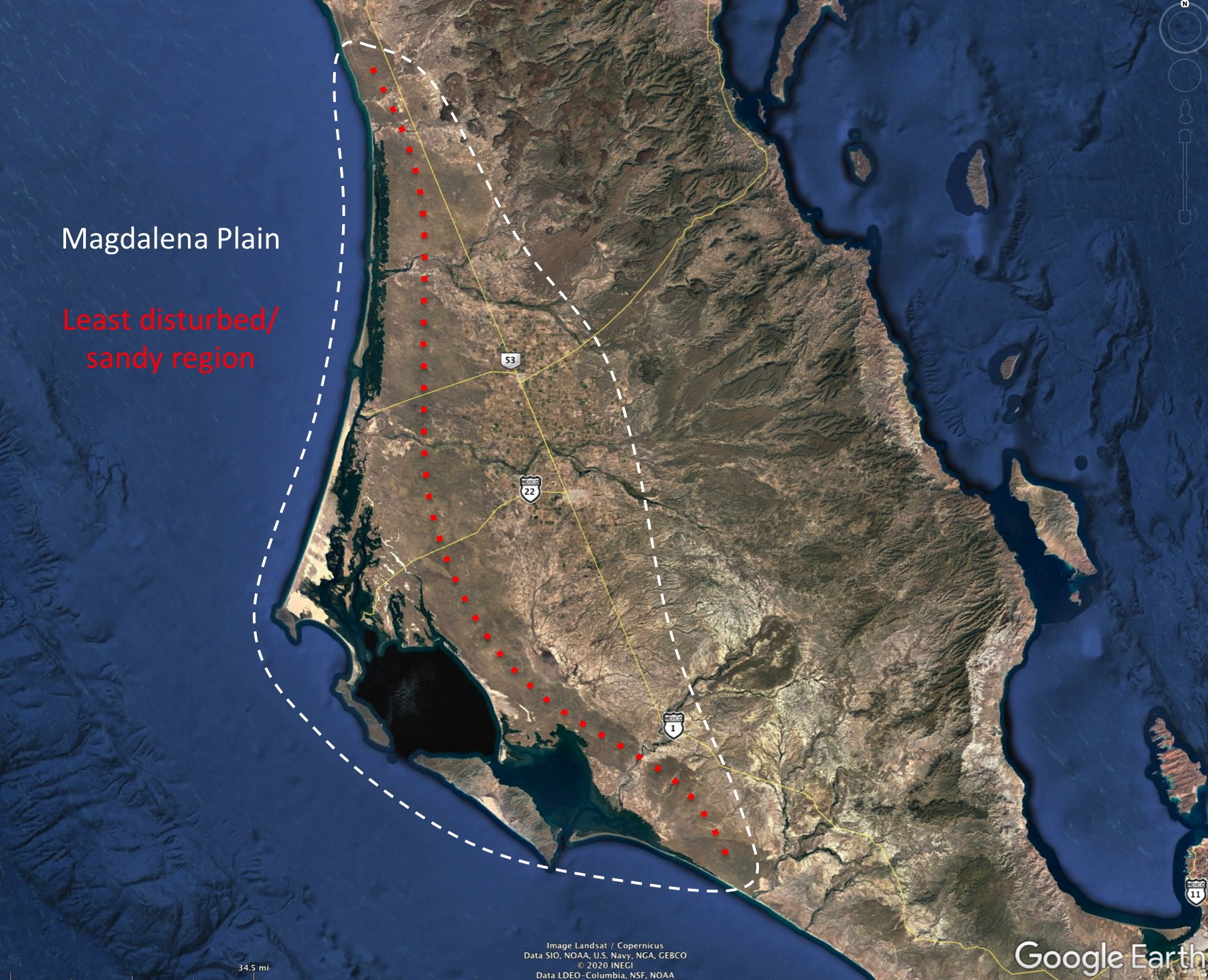 The Magdalena Plain is perhaps the flattest part of the Baja California peninsula. Examination of the topography shows that it is a tombolo – a sand spit that extends from the mainland to the “offshore” islands that are now connected to the mainland except for a barrier lagoon. Normally tombolos are associated with small features, but here the sand deposition must have been taking place for a much longer time.