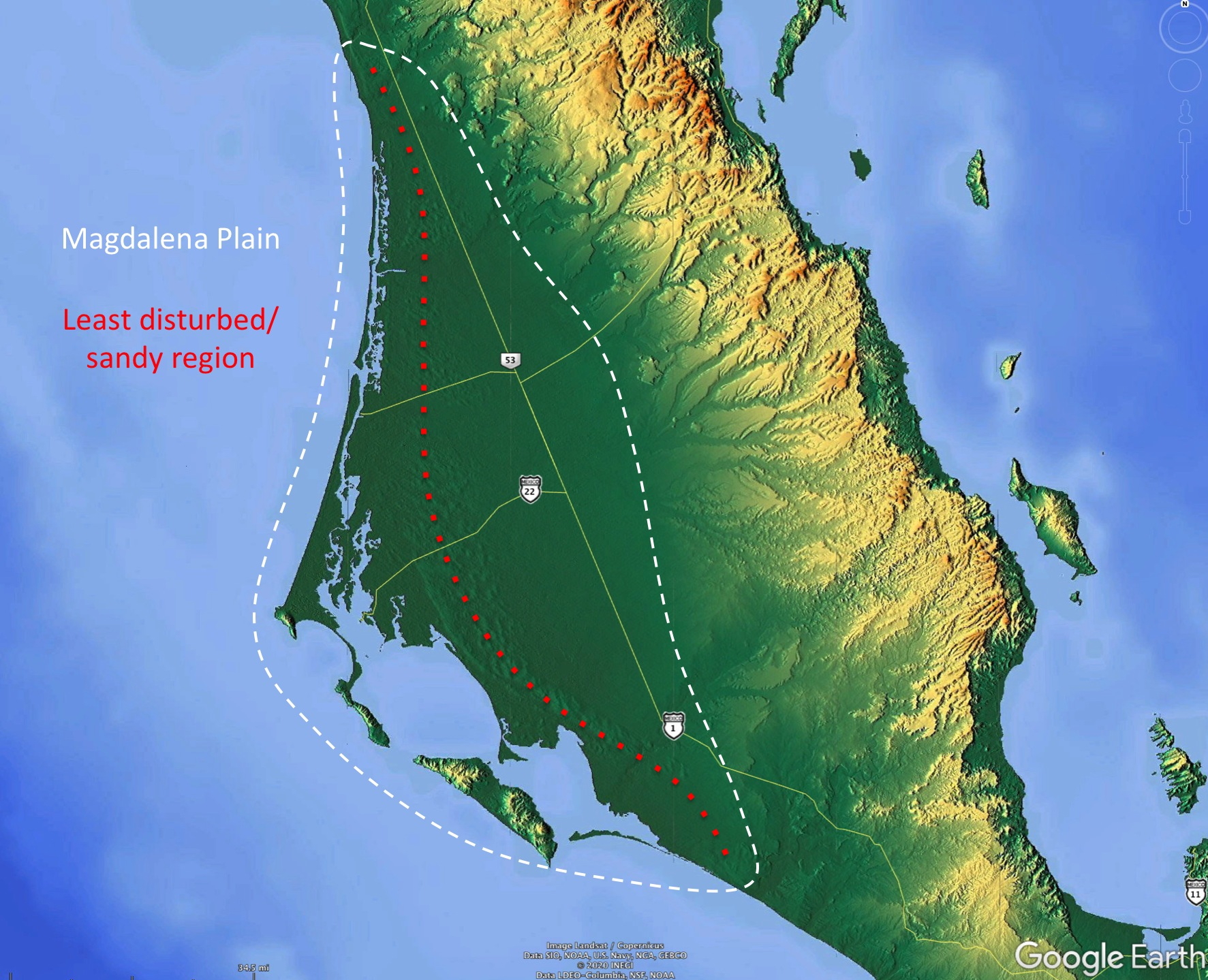 Because the Magdalena Plain is mostly flat or gently undulating, it has been developed for agriculture in many places. However, the groundwater has limited development and fortunately, from environmental perspectives, it has not greatly changed in Google Earth imagery over the past 30 years.