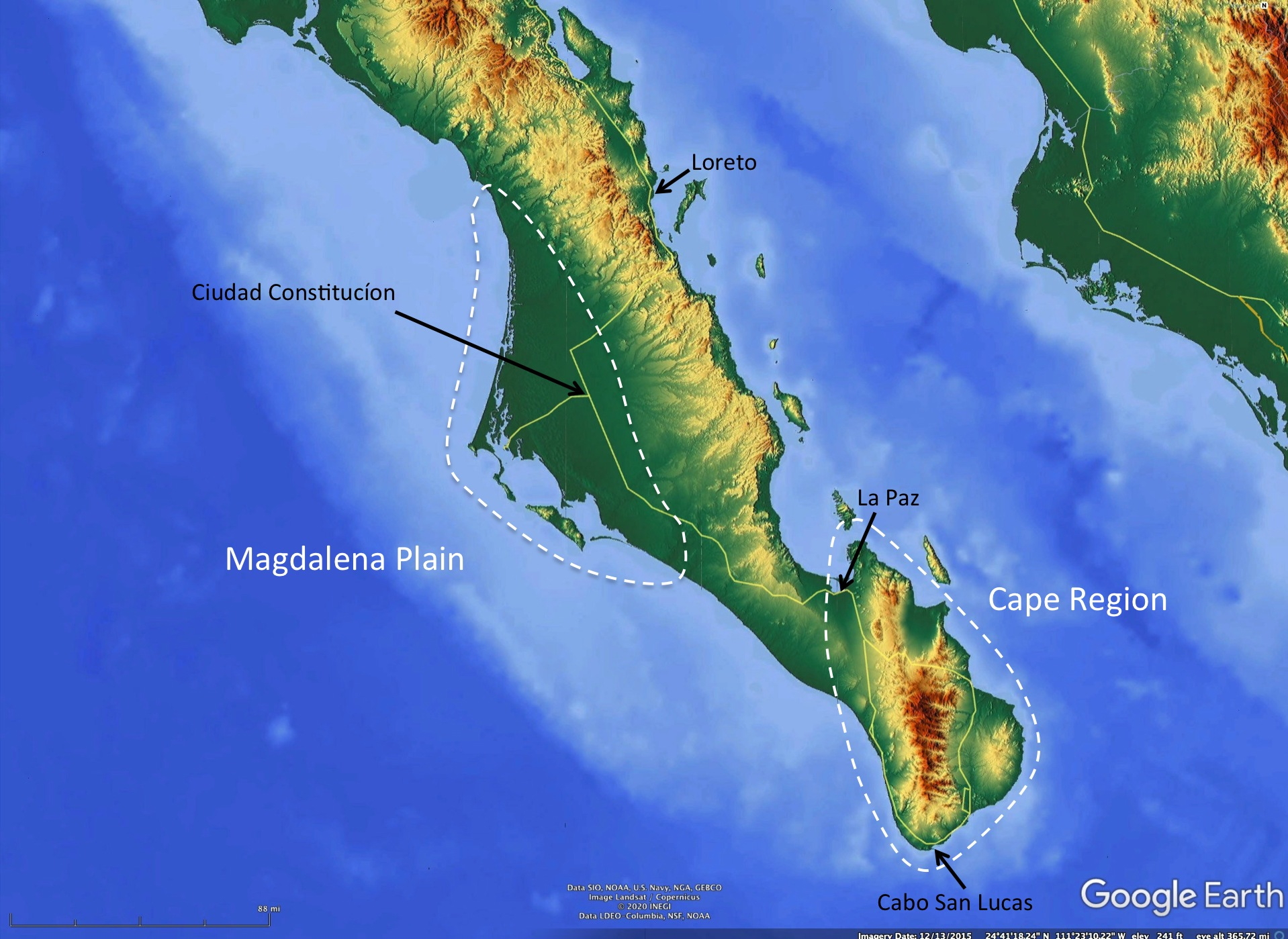 The Magdalena Plain is perhaps the flattest part of the Baja California peninsula. Examination of the topography shows that it is a tombolo – a sand spit that extends from the mainland to the “offshore” islands that are now connected to the mainland except for a barrier lagoon. Normally tombolos are associated with small features, but here the sand deposition must have been taking place for a much longer time.