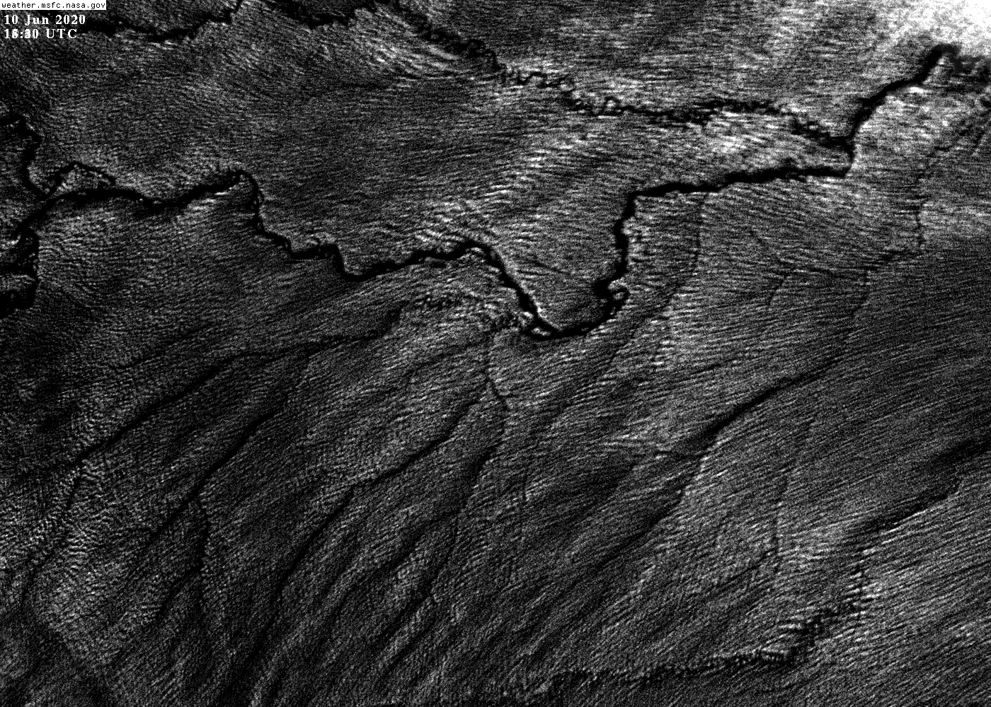 Cloudiness extracted from 10 min images on June 10 2020. The dark areas are over or along major Amazonian rivers where there were few/no clouds present in the images used. The relatively cool river surface suppresses convective cloud development and sinking motion is present over these rivers – to compensate for upward motion on each side of the river. On most days this pattern is not as obvious; this day showed especially clear river breeze evidence.