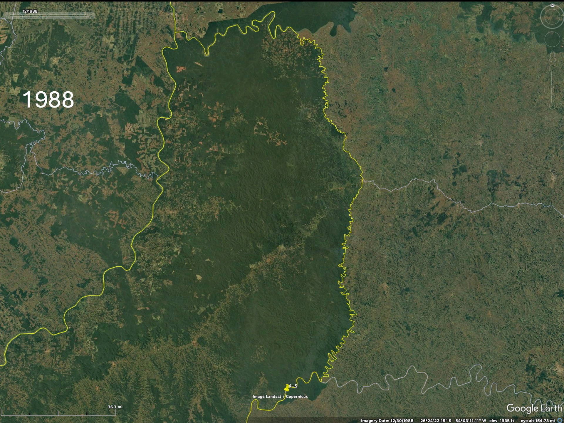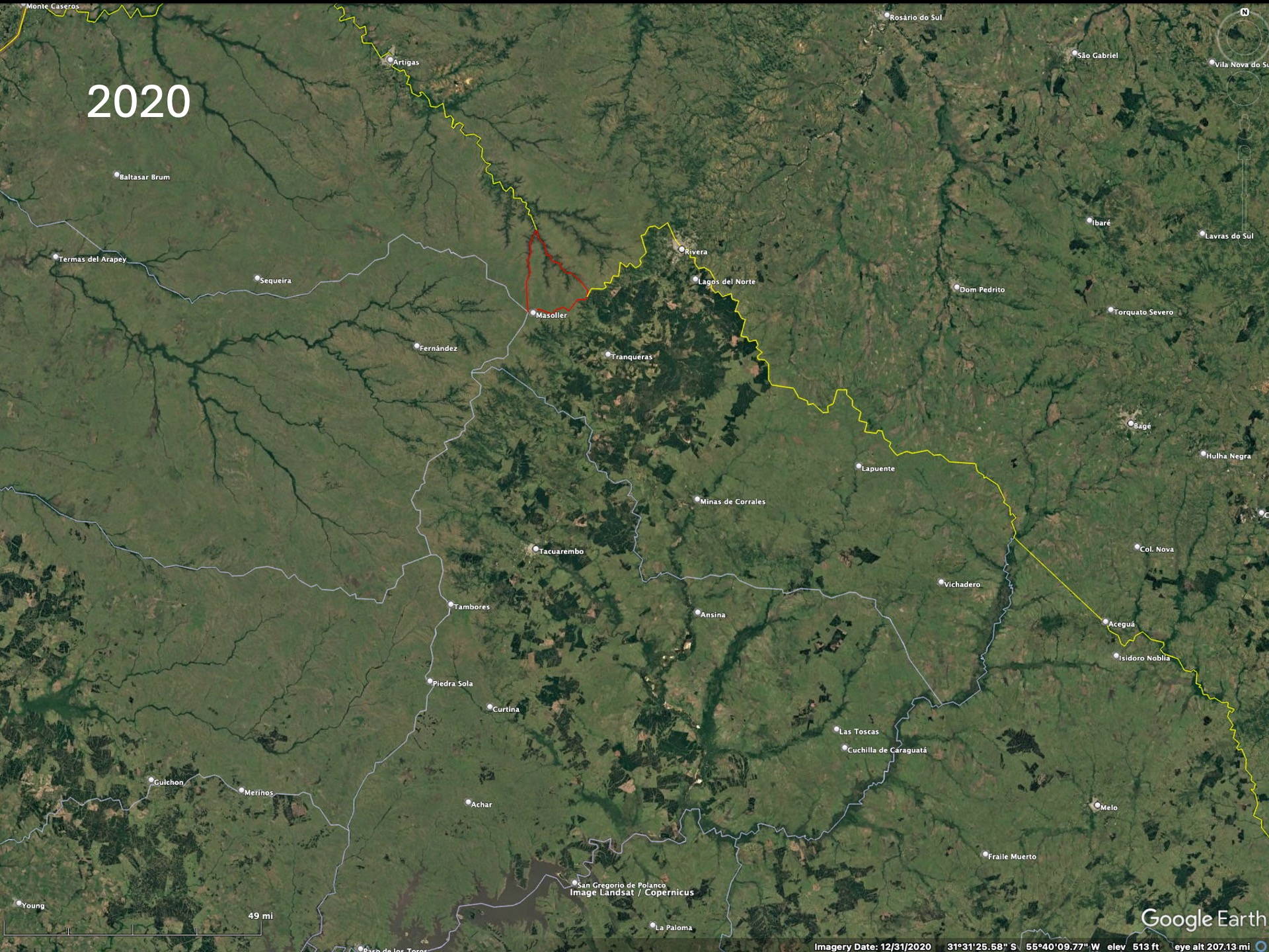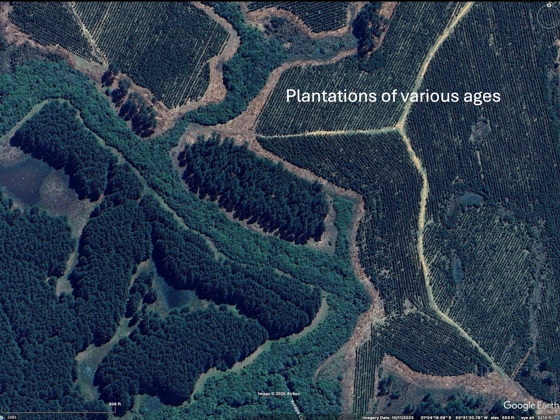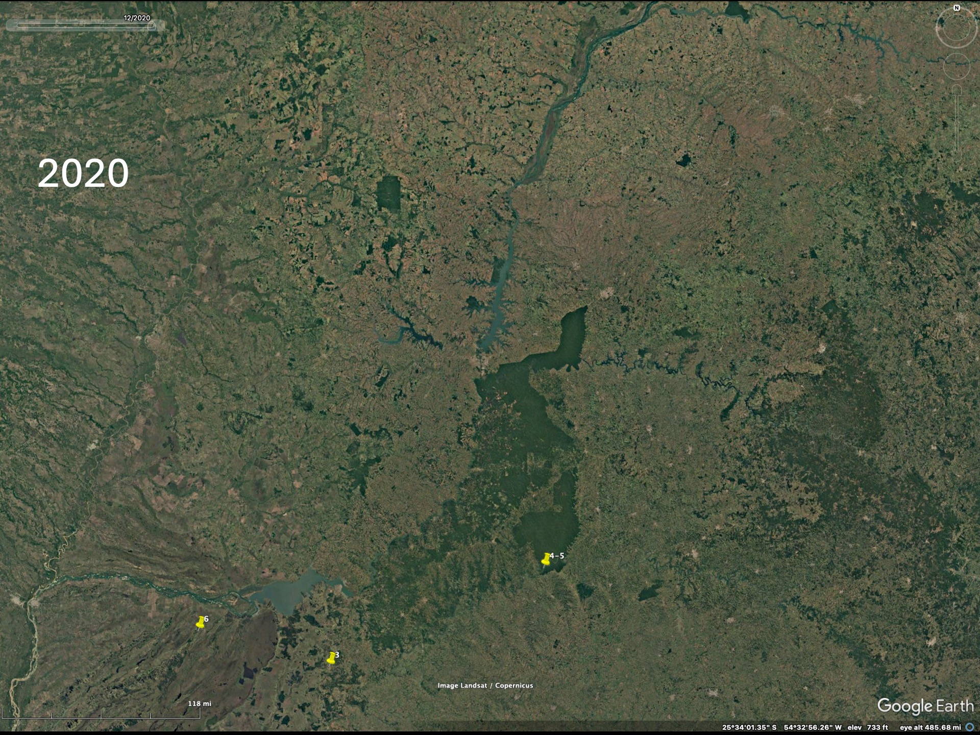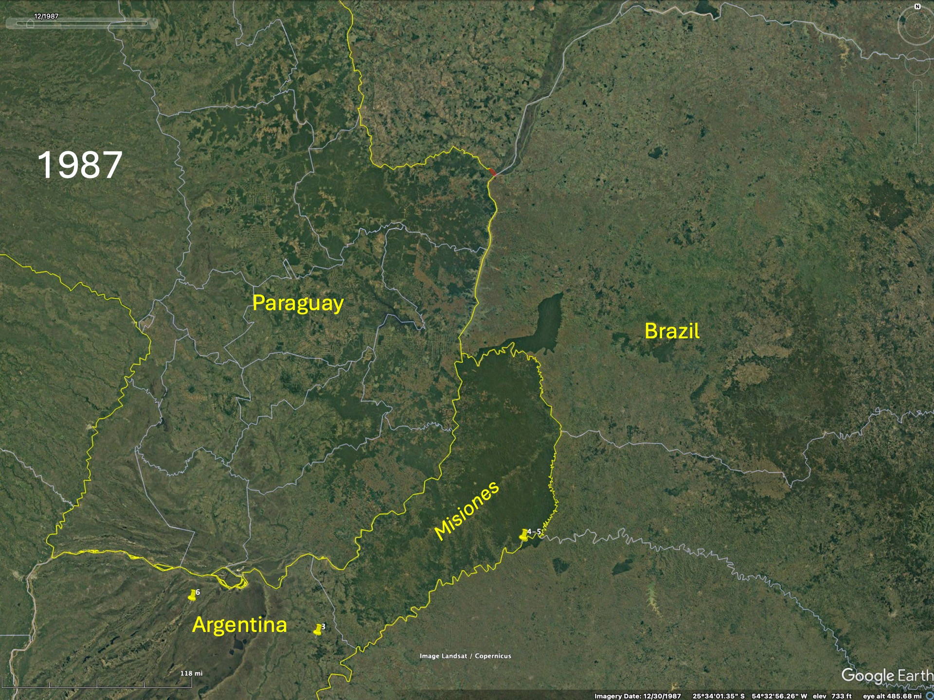 To realize the “forests” are actually plantations one needs to zoom in to higher resolution on the Google imagery to see that the trees are planted in rows. Then the difference between native forests and plantations becomes obvious. The native forest patches, especially in eastern Paraguay but also Argentina and Brazil, have decreased since the availability of the LANDSAT imagery in the early 1970’s (imagery from 1984 on Google).