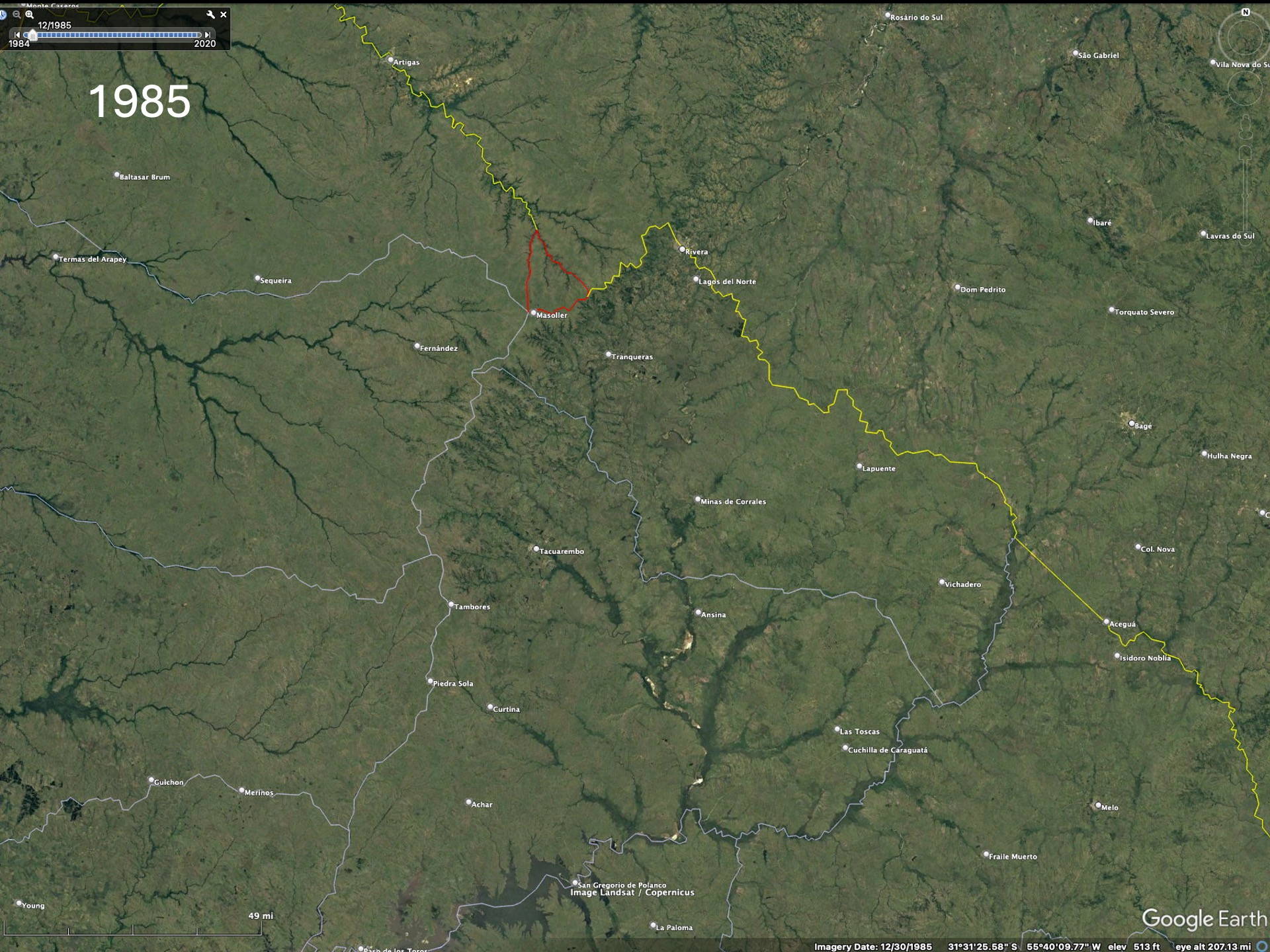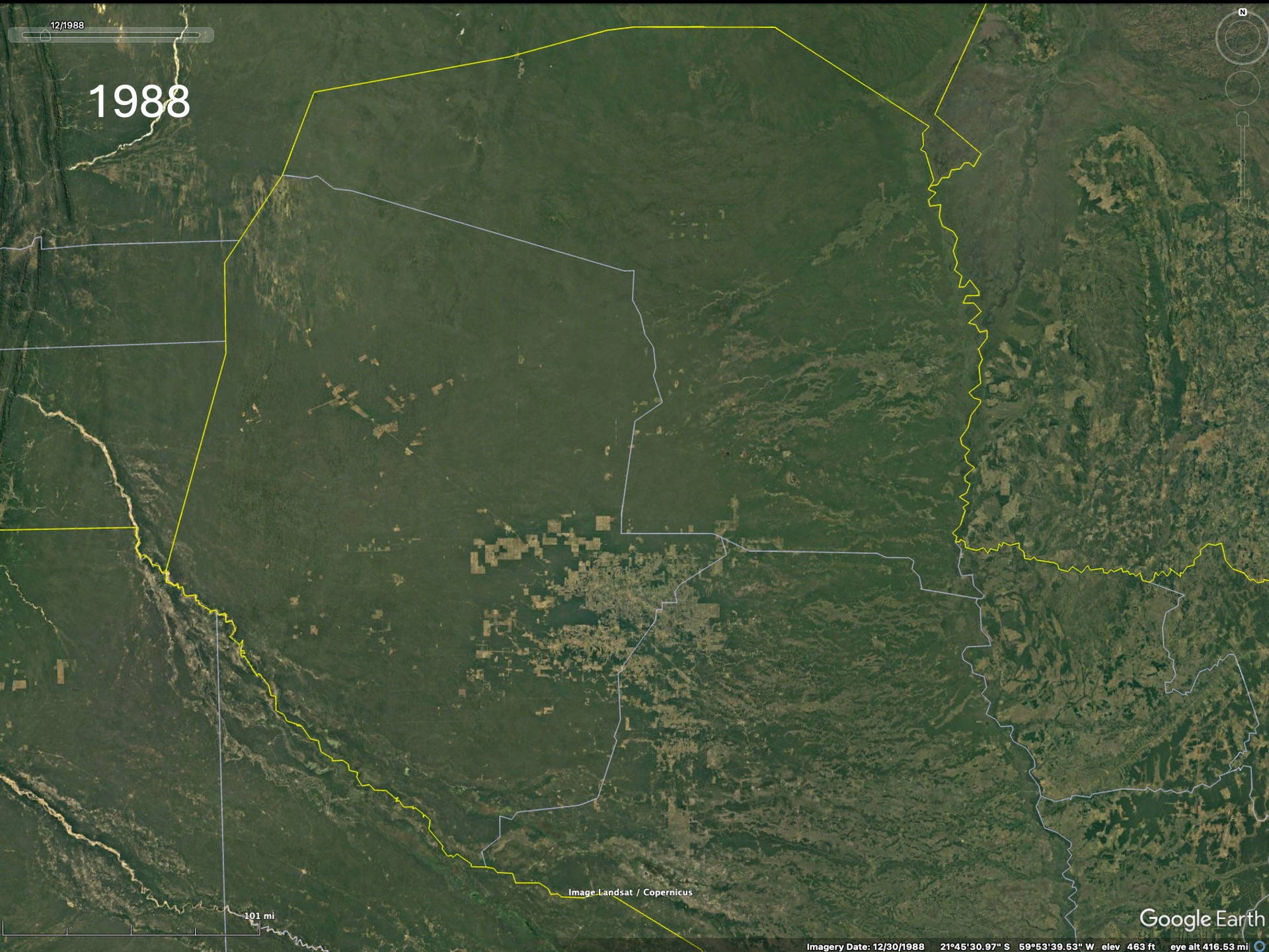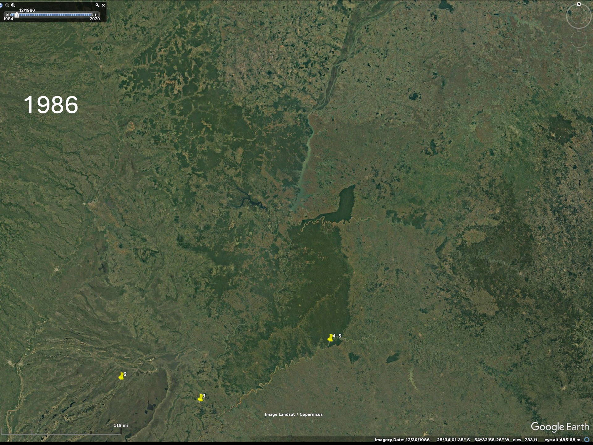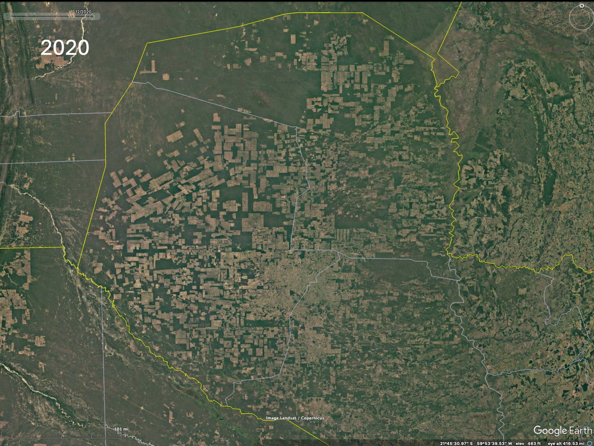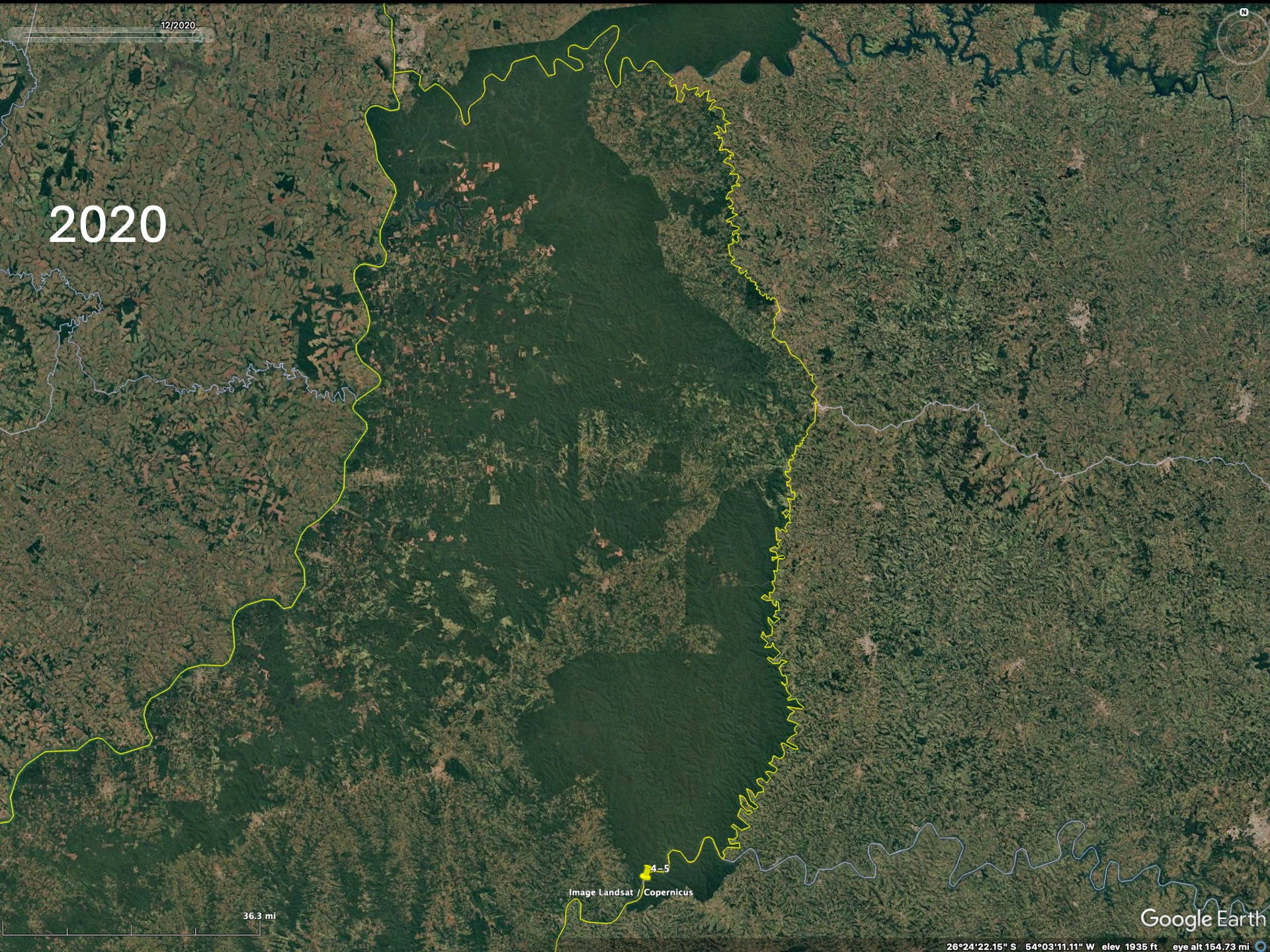 To realize the “forests” are actually plantations one needs to zoom in to higher resolution on the Google imagery to see that the trees are planted in rows. Then the difference between native forests and plantations becomes obvious. The native forest patches, especially in eastern Paraguay but also Argentina and Brazil, have decreased since the availability of the LANDSAT imagery in the early 1970’s (imagery from 1984 on Google).