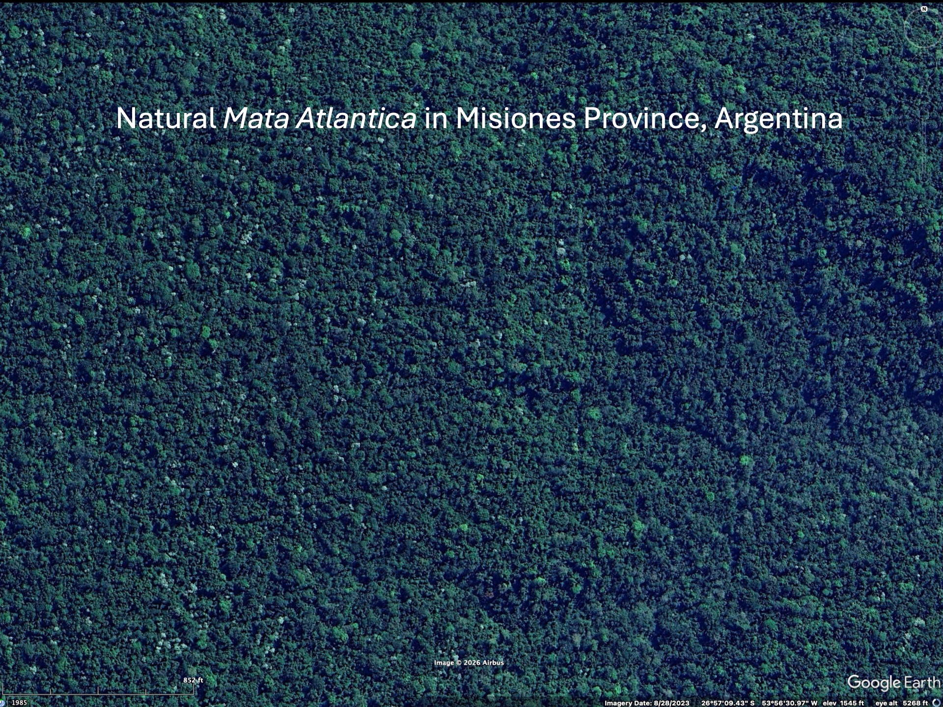If one looks at satellite imagery (usually from Google Maps or Google Earth, they use the same data) over a larger area, say northeast Argentina, one might believe that there are large forested areas in this region. A few images are shown below to suggest this. In fact, many areas are undergoing reforestation – suggesting that there is an increasing awareness and interest in conserving the original forests of the region. The truth is nearly the opposite.