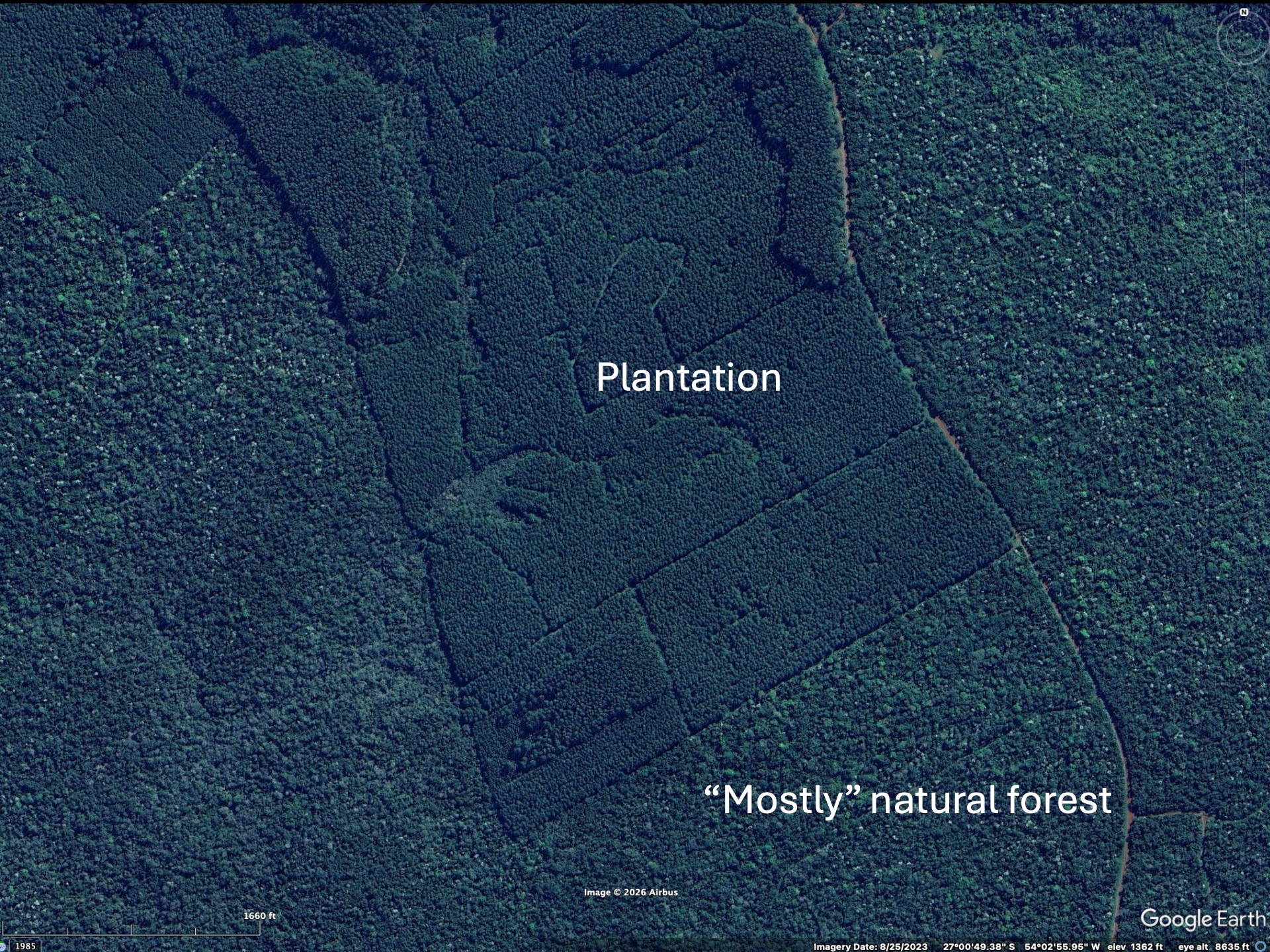Most reforestation in northeastern Argentina (the Mata Atlantica region) is actually done with species of fast-growing pine or eucalyptus (neither native to South America). These are used for wood, either for construction or paper pulp. These trees are planted very close together and appear darker on satellite imagery. There are essentially monocultures with minimal biodiversity. Like corn or wheat fields, only taller.