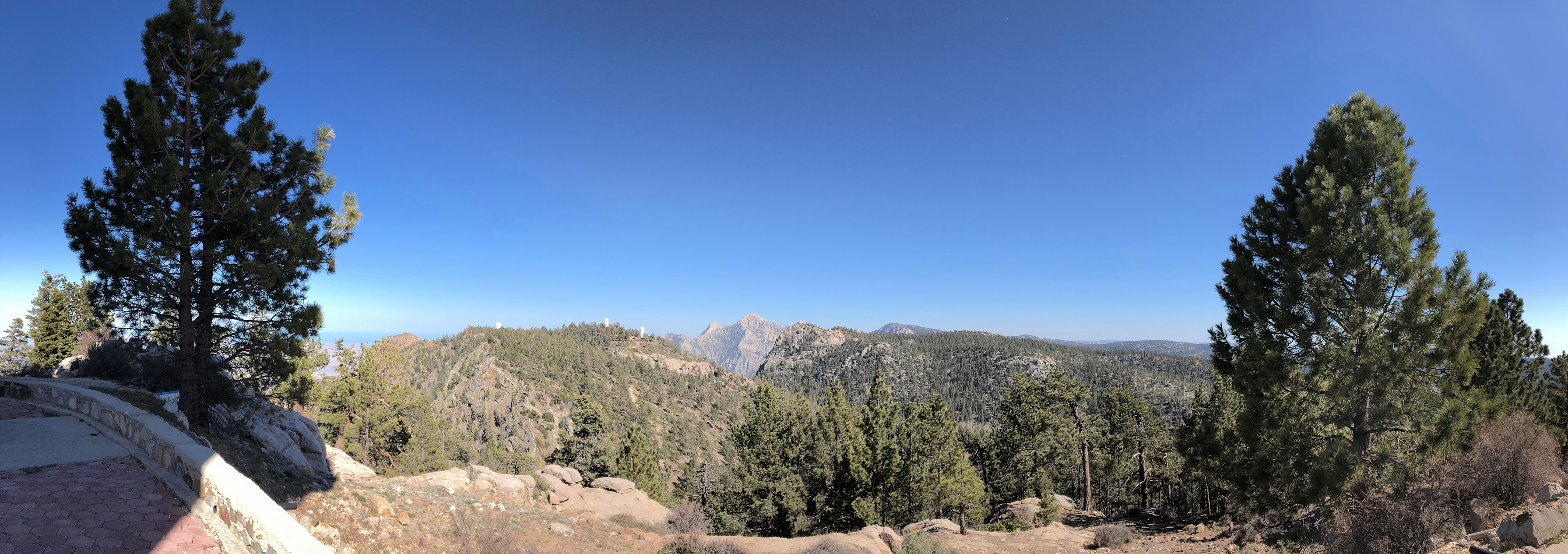The road to the mountains passes first through chaparral before climbing into the Jeffrey Pine (Pinus jeffreyi) and White Fir (Abies concolor) forests. Sugar Pine (Pinus lambertiana) and Lodgepole Pine (Pinus contorta) are also found in this high altitude forest. In fact, this is the southernmost location for Sugar and Lodgepole pines. There is a relatively large area (perhaps 20 x 8 miles) above 7000 ft, and the main observatory is at about 9200 ft.