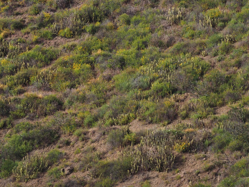 The California chaparral extends well into Baja California and the old highway to Ensenada passes through landscapes mostly modified by agriculture, but some hillsides and some large road cuts have excellent displays of succulent plants that have had many years to colonize these areas. (The toll road (Highway 1D) from Tijuana to Ensenada has almost no places to stop.) Most of the photographs above were taken from walking along the road (best done at low-traffic times of the week) about 20 miles north of Ensenada on the old Highway 1.