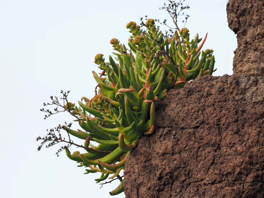 Entering Ensenada, one see Stenocereus gummosus for the first time – it remains with the traveler all the way to the tip of the peninsula. Prior to that, Bergerocactus emoryi is present from extreme southern California southward, but its distribution ends before the Central Desert. It is restricted to coastal areas.