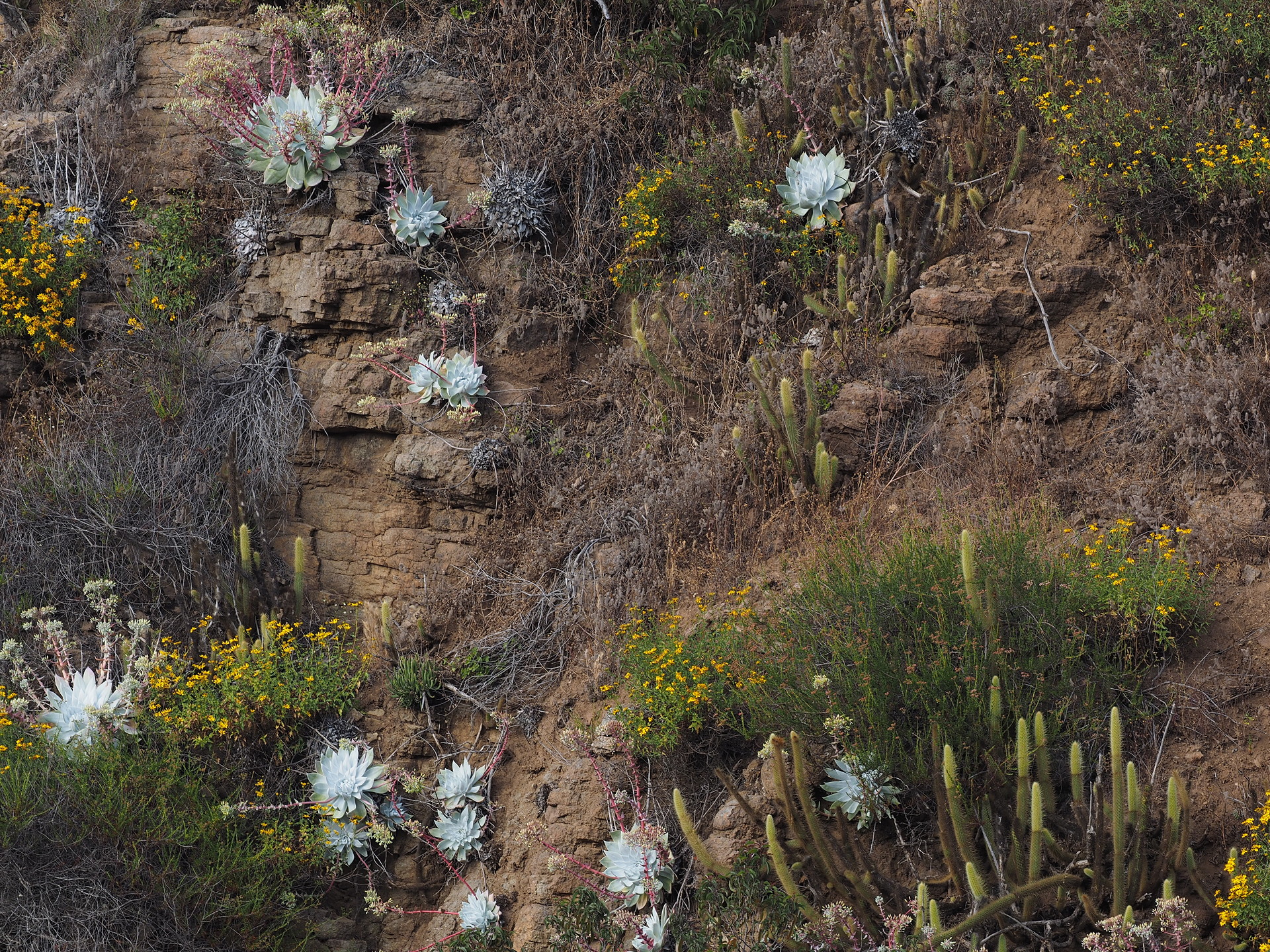 Slightly closer view of the Dudleya brittonii along with Bergerocactus. This is a “natural” slope, not a road-cut. ← Previous Next → Slightly closer view of the Dudleya brittonii along with Bergerocactus. This is a “natural” slope, not a road-cut. Like Loading...