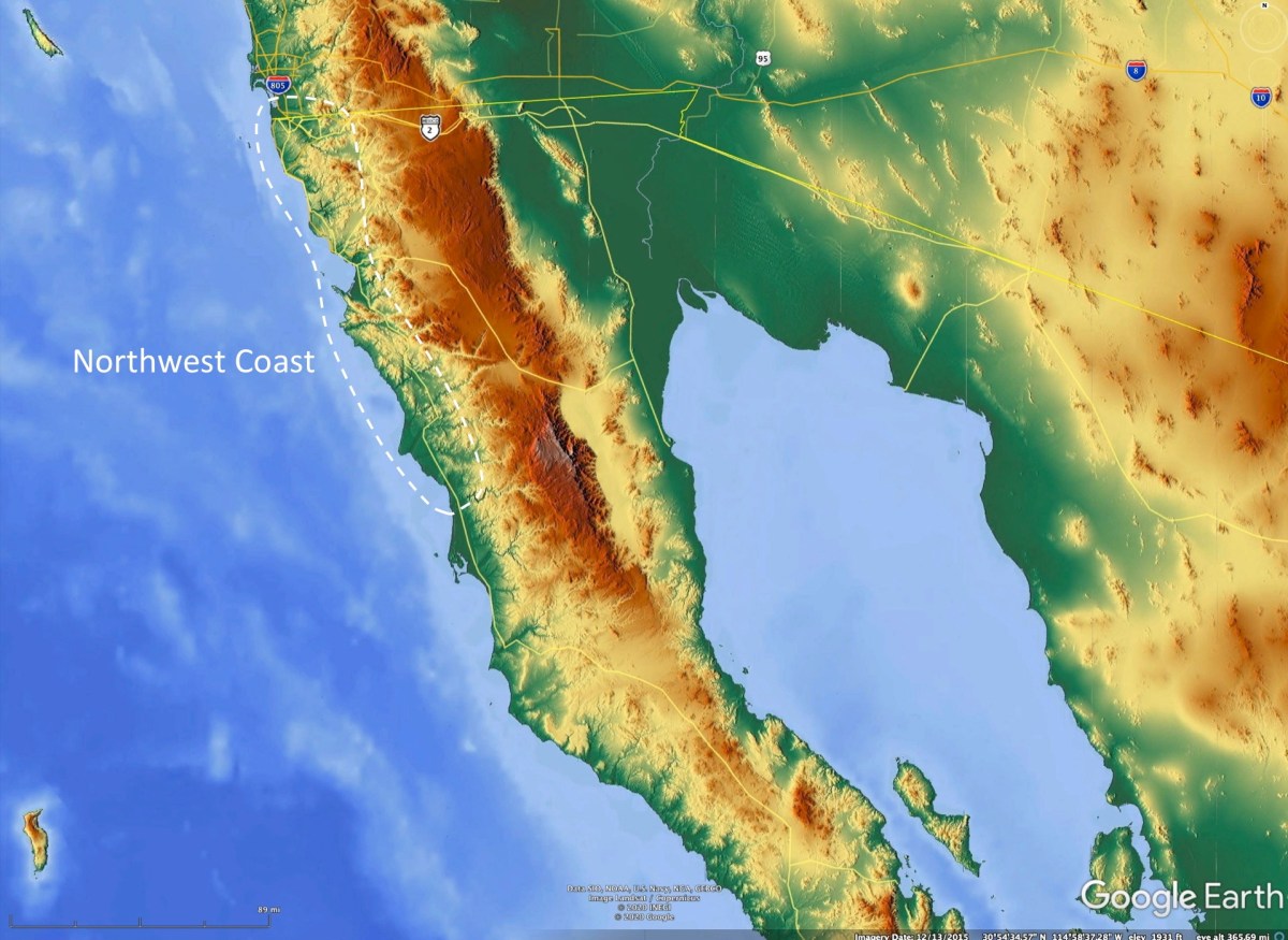 This map shows the relief of northern Baja California and the area we call the “northwestern coast”. This is very approximate, but roughly includes the area along the coast from the border to north of San Quintin.