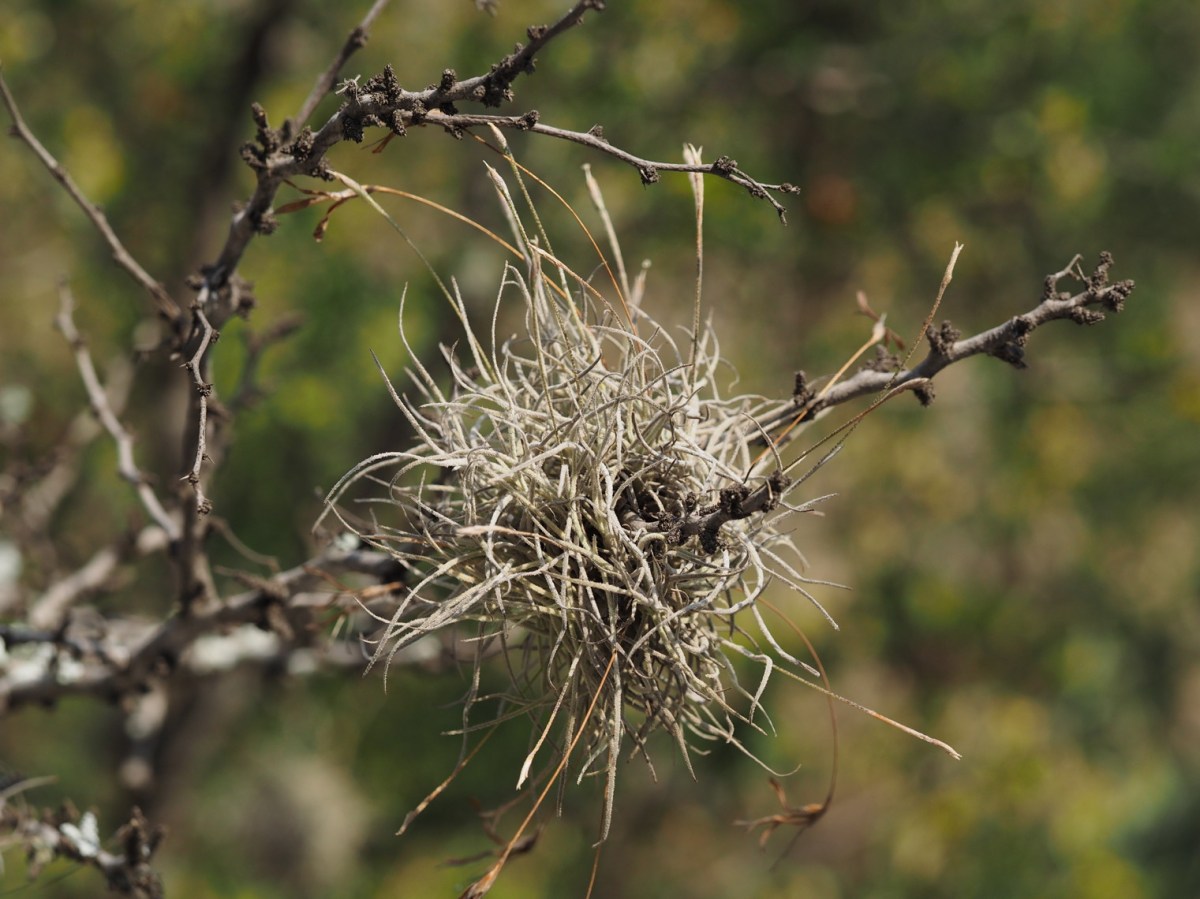 136 This I put in for those who haven’t been to the American tropics (or Florida or south Texas). Tillandsia recurvata is a very common and wide-ranging bromeliad growing on trees, telephone wires etc. all the way to South America. Small bluish flowers. “Ball moss” is one common name.