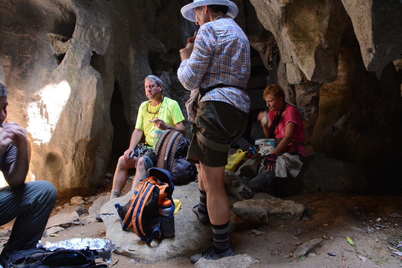 Then we descended to the bottom of a Tsingy “canyon” where we had lunch. It was much cooler (about 75F in the canyon bottom, where sunlight barely reached. However, some of us had run out of water by that time. Then there was scrambling on all 4’s to go through short cave passages to continue on the trail. The final stretch was through fairly uninteresting grassland/deciduous forest devoid of many succulents.