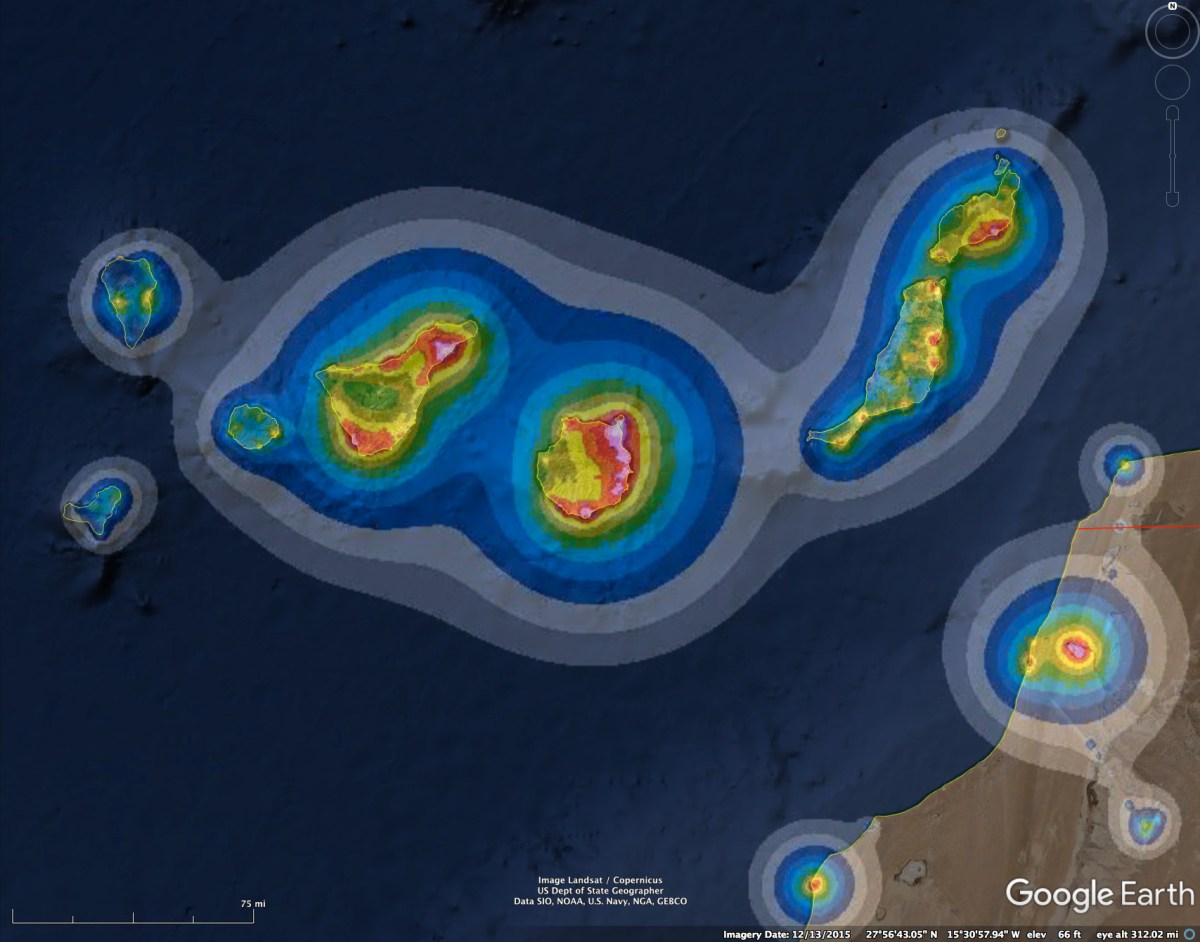 Sky brightness over the Canary Islands, a very popular tourist destination for Europeans. Only the western part of El Hierro, the westernmost island, has dark skies. It is the least populated island and the most difficult of access.
