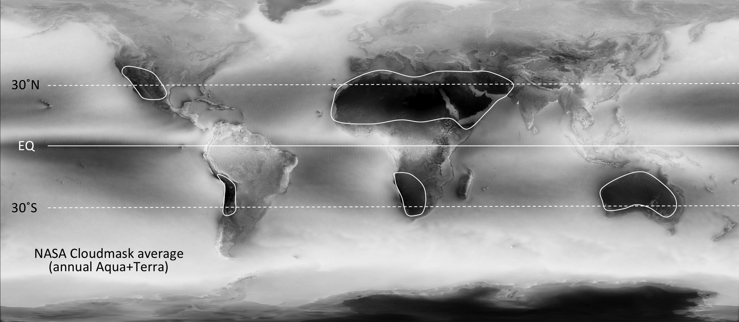 NASA cloudmask product averaged for 6 years and enhanced to emphasize the main areas of minimal cloudiness over land (areas enclosed by the curves. The Sahara – Arabian Peninsula is the largest, but also somewhat difficult of access at times.