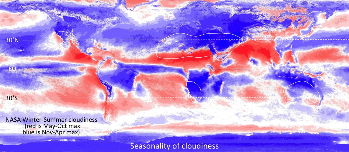 SEASONALITY OF CLOUDINESS ← Previous Next → Seasonality of cloudiness – red areas have more clouds in boreal summer than boreal winter. Opposite for blue areas. Like Loading...