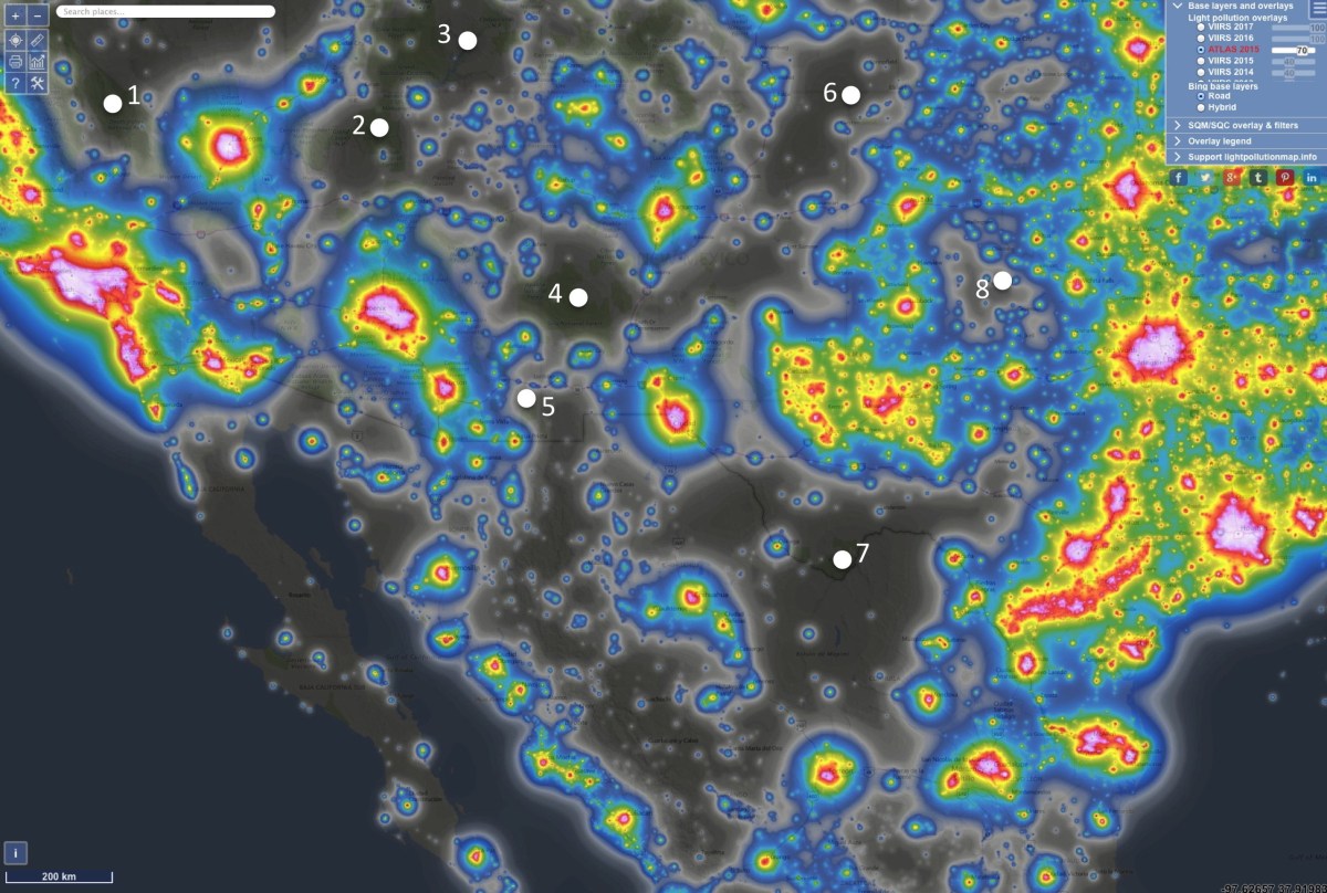 Sky brightness over the southwestern US and northwestern Mexico and some of the sites suitable for dark sky observations. The dots are the approximate locations of 1) Death Valley National Park, 2) North Rim of the Grand Canyon, 3) Canyonlands area of Utah, 4) Gila Mountains of New Mexico, 5) Chiricahua National Monument (Arizona), 6) Kenton, Oklahoma – site of the annual Okie-Tex Star Party, 7) Big Bend National Park, 8) The location of the 3RF (Three Rivers Foundation) Astronomy Campus. The 3RF is the closest gooddark sky location to the Dallas-Ft Worth Metroplex.