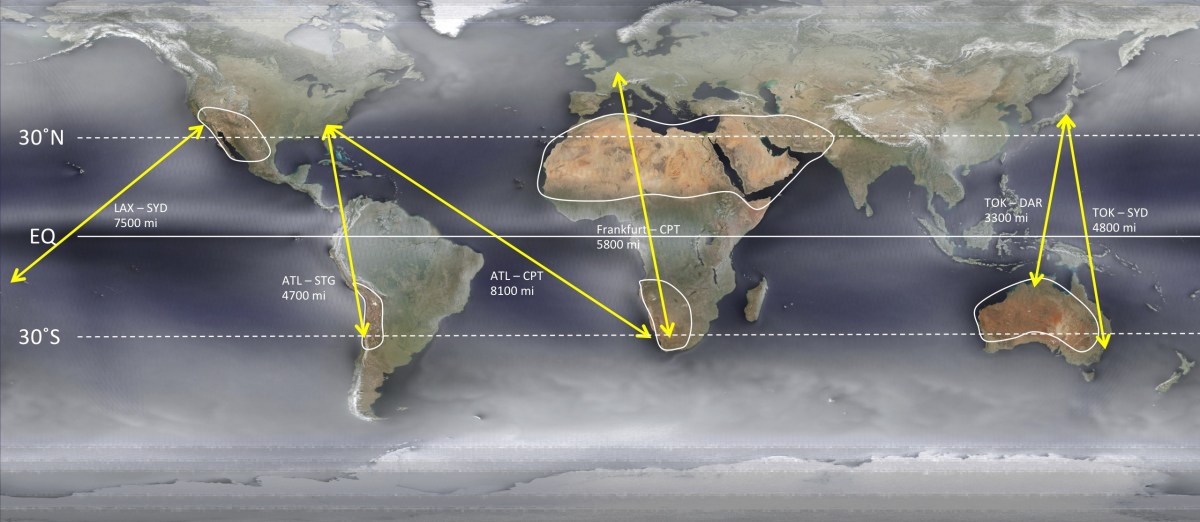 The typical or at least most plausible travel routes for astronomical tourists coming from Europe, North America or Japan (China is roughly similar to Japan). Distances are in miles between major airports (not all airport 3-letter codes correspond to the actual airports – I put what would be quickly recognizable). Note that some flights are nearly along the same longitude (no jet lag) while others cross many time zones (e.g. Atlanta to Cape Town or Los Angeles to Sydney).
