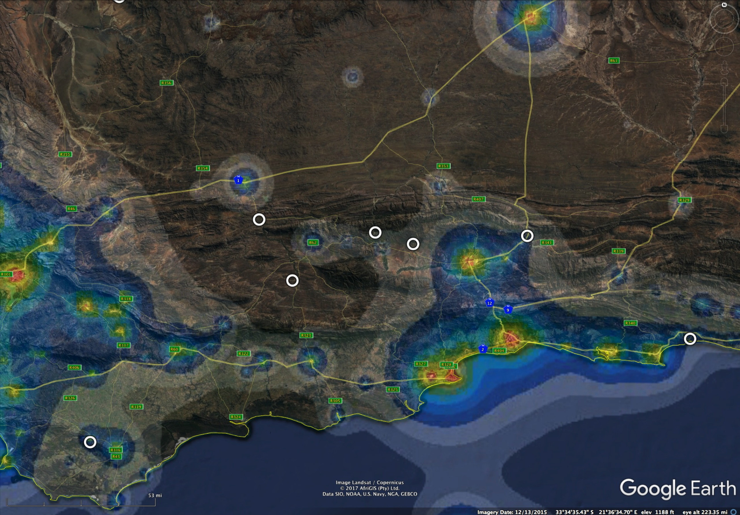 Same region of Little Karoo as previous slide, but with light pollution superimposed. Some of the farm cottages have excellent dark skies, others less so. “The Place”, is perhaps the best situated, but has only two cottages available: https://thetravelingnaturalist.org/botanizing-on-south-african-farms/the-place/