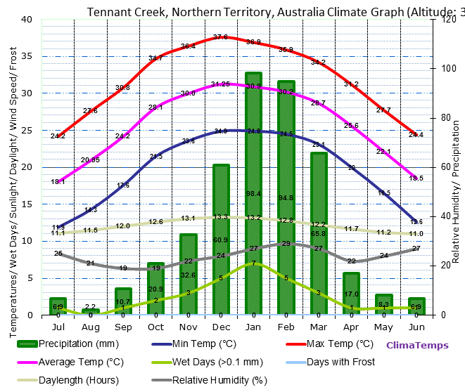 Tennant Creek is a small town about 550 miles (straight) south of Darwin. It is much drier, but with a precipitation maximum similar to that of Darwin. The axes have been rescaled, but the January rainfall is now only about 100mm (4 inches). Maximum temperatures are higher in the summer (Jan) but cooler in the winter. The relative humidity is much lower. Thus you can escape the high humidity and rainfall of the coastal areas on northern Australia by traveling south a day or so.