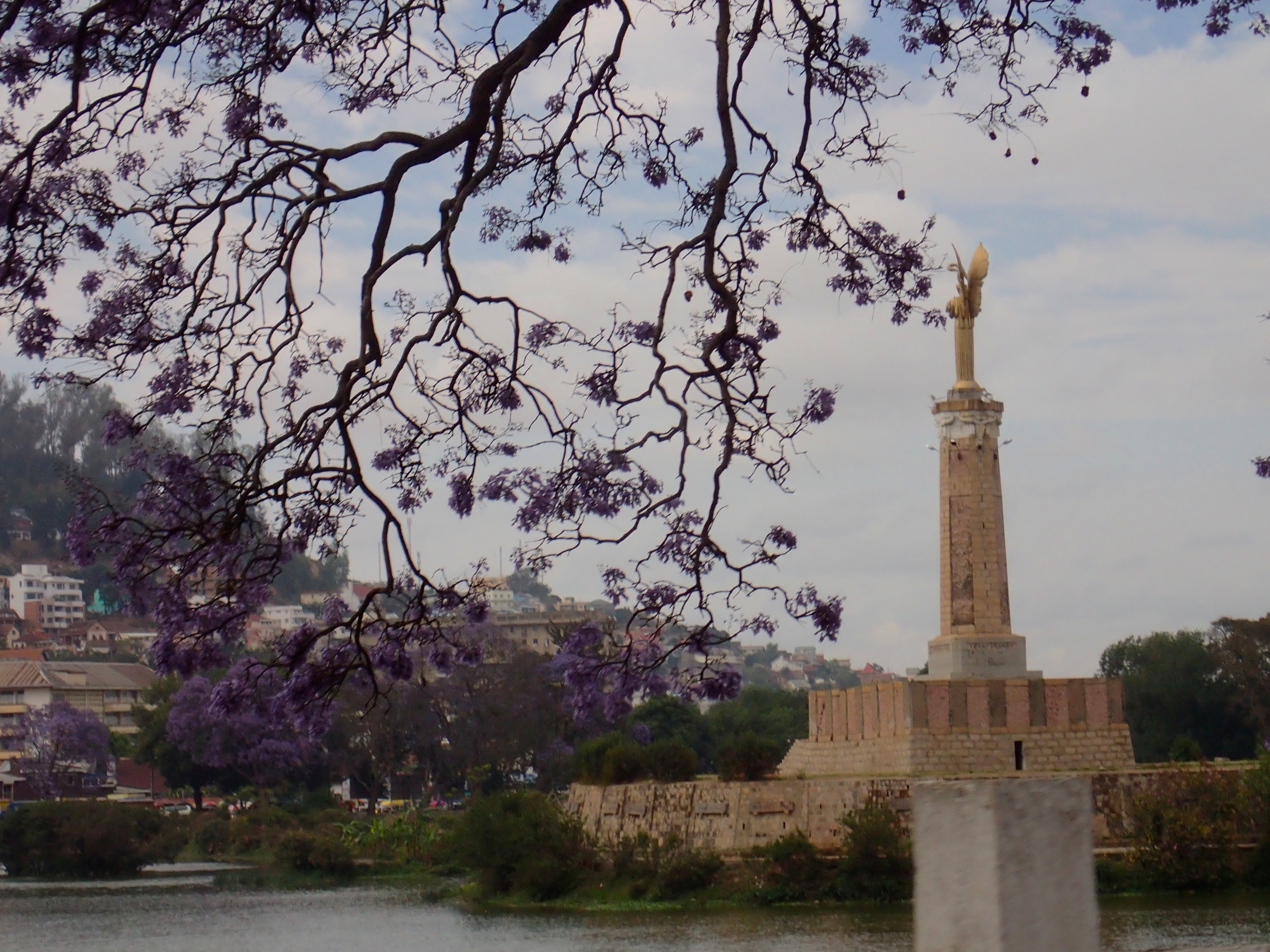 The Black Angel statue on Lake Anosy, a famous monument erected in 1927. The beautiful Jacaranda flowers were on display this time of year.