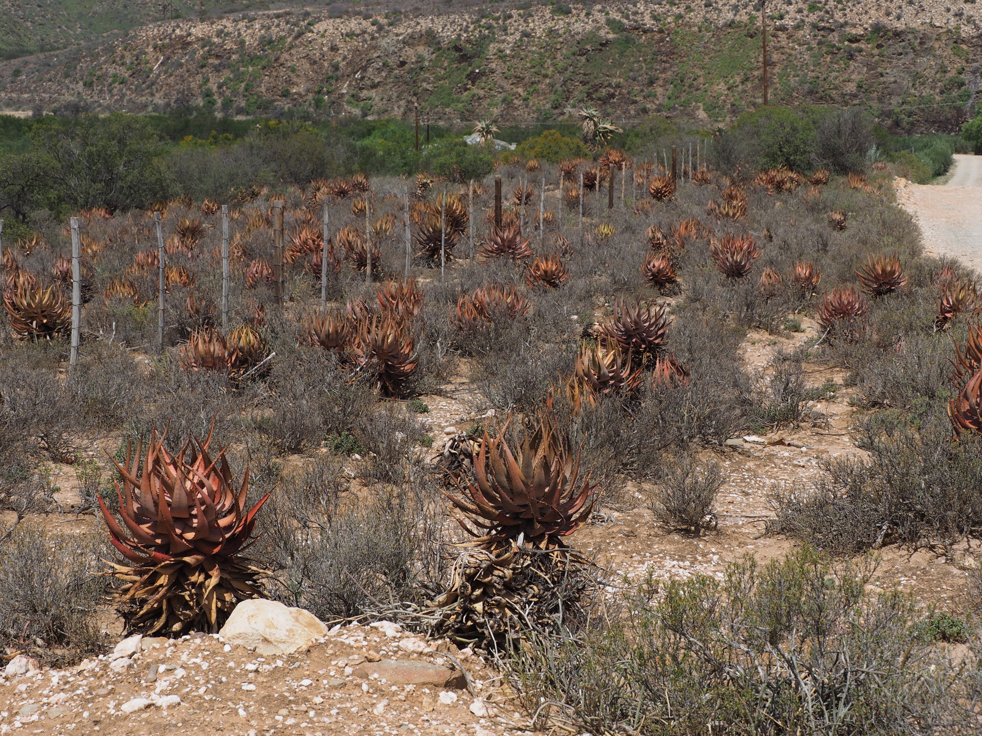 Around the entrance to Trail #3 we had easy access to many, many Aloe microstigma that appear to be adept colonizers of disturbed land (near the road). Unlike the Aloe ferox and Aloe speciosa these Aloes do not grow tall. We had seen huge patches of these Aloe across the river but could not cross the river to see them.