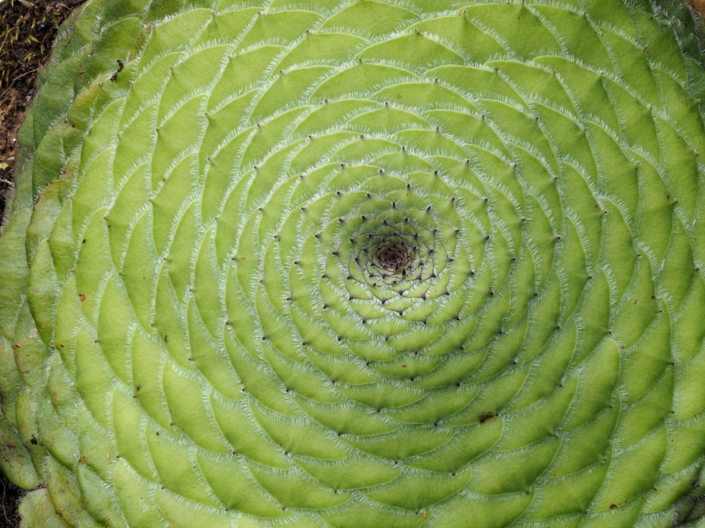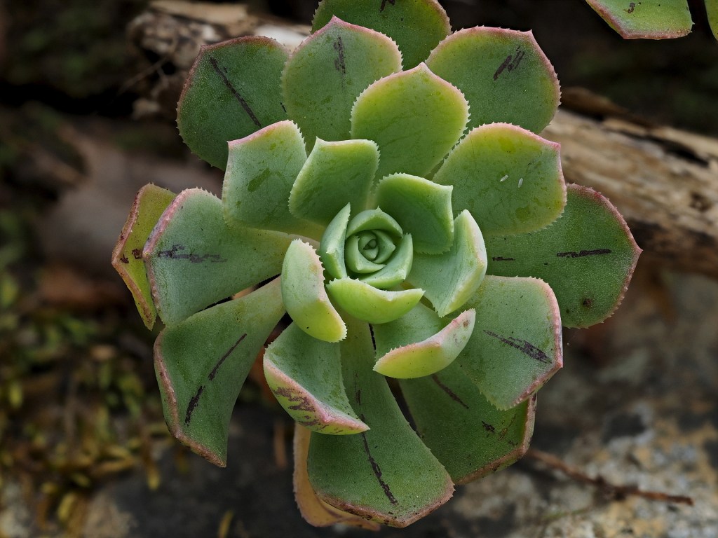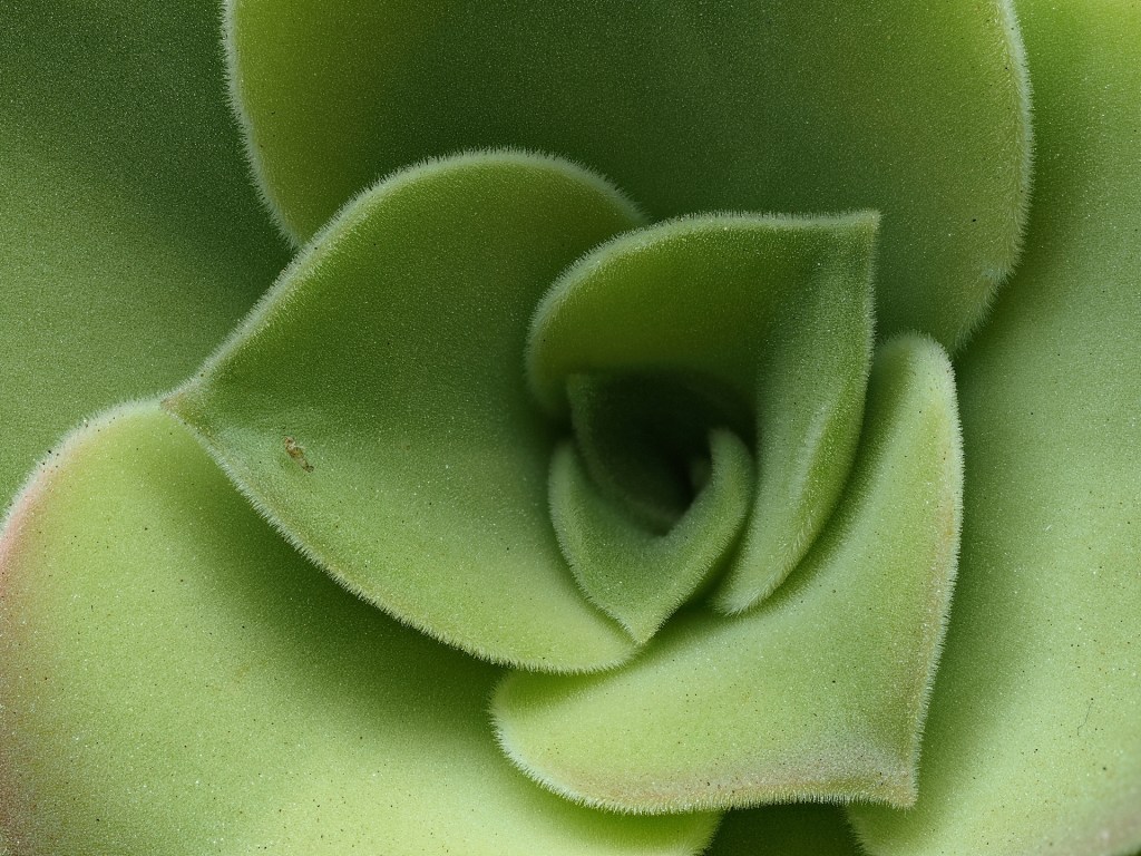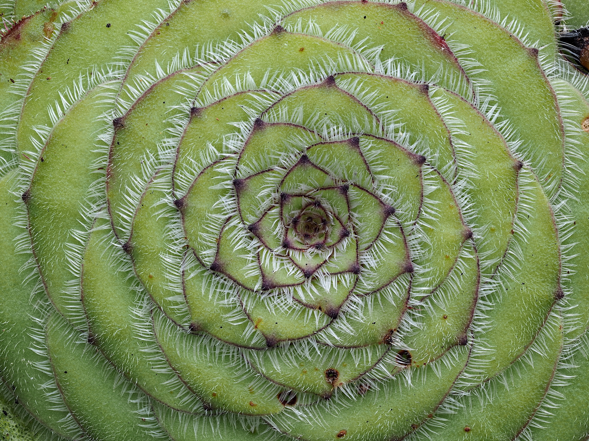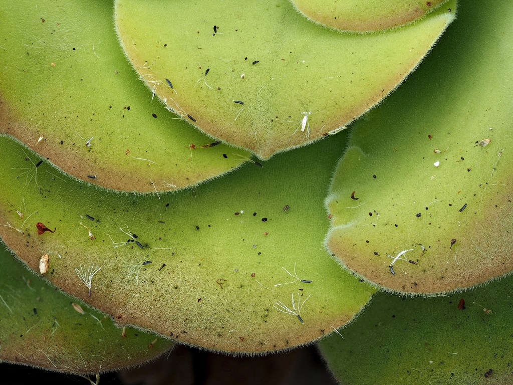 This close-up of an Aeonium tabuliforme shows the leaf-margin hairs that are not nearly as obvious when seeing the plant from a distance.
