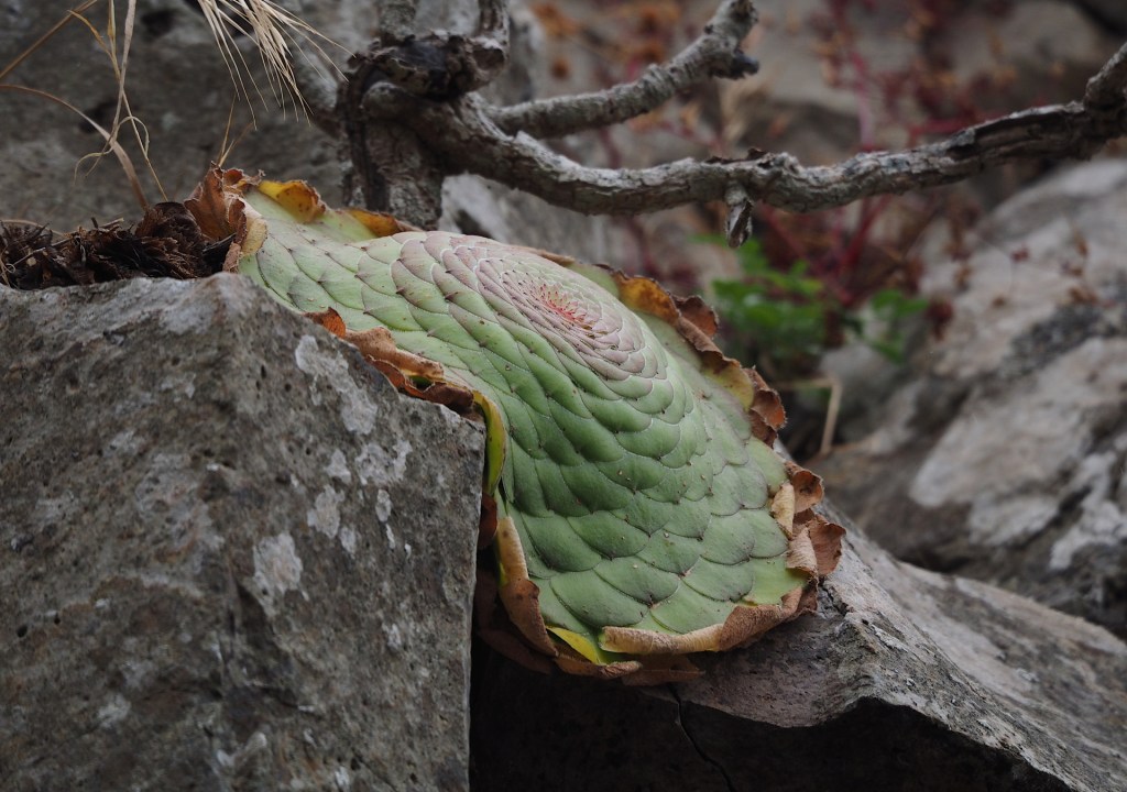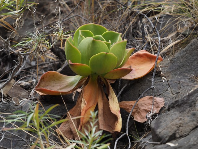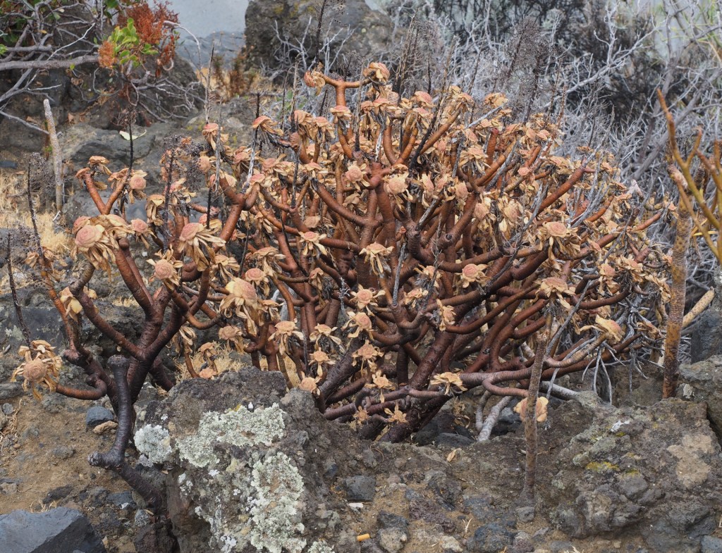 We thought that identifying Aeonium species would be relatively easy, but this was not to be. The plants of a particular species can be quite variable in appearance depending on the sunlight and water available to them. Then there was the second factor – the genera Greenovia – a group of succulents were were barely aware of prior to visiting the islands. These can be confusingly similar to some Aeoniums, and they are quite abundant on certain islands like El Hierro. They don’t appear to be very common in cultivation (at least in USA).