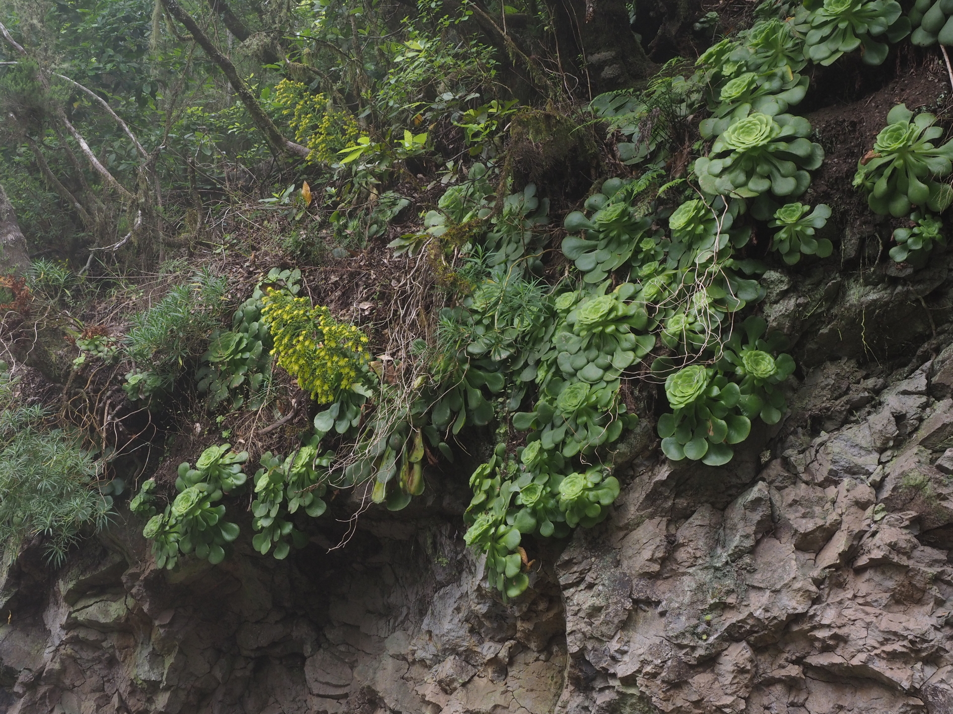 Some of the non-Aeonium genera of the Crassulaceae family that one will likely encounter in the Canary Islands include Aichryson, Greenovia, Monanthes and Sedum. Members of the Euphorbiaceae (all genus Euphorbia) are abundant and dominate many landscapes, while Asclepiadaceae (genera Ceropegia and Caralluma) are found on all islands, but less conspicuously.