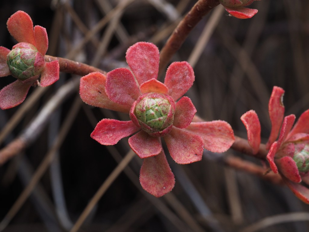 Airchryson is a genus of succulent herbs that are found mostly in the laurisliva forests. They tend to look similar, but because of variations in available light and water even the same species can be quite variable in their appearance. At least when we were visiting the islands they were flowering profusely. Occasionally they will grow epiphytic on tree trunks or branches, though we mostly saw them on rock outcrops – like most other succulents.